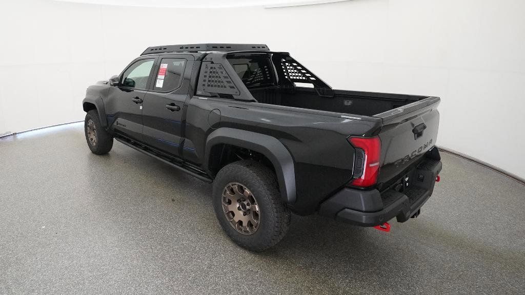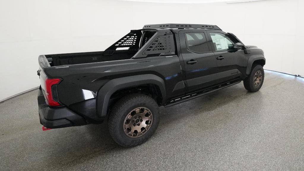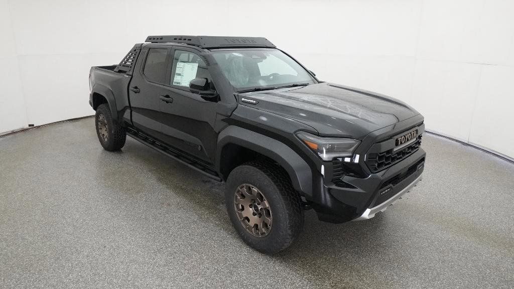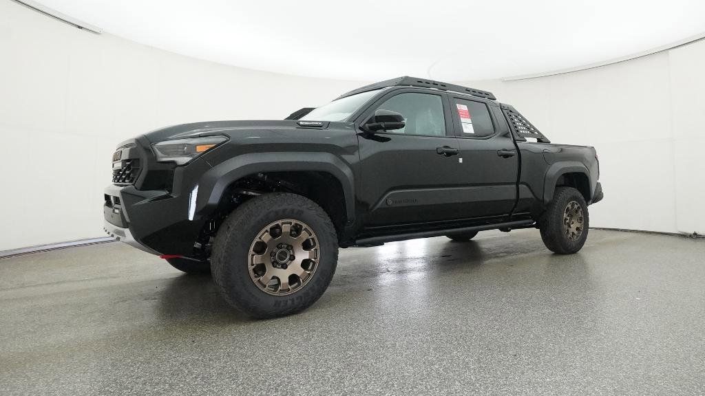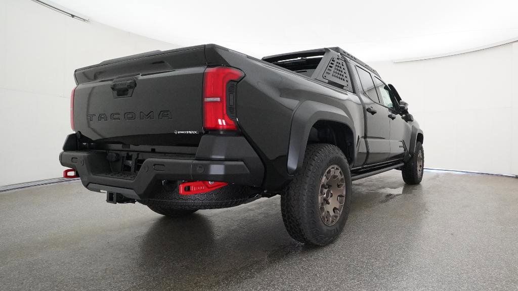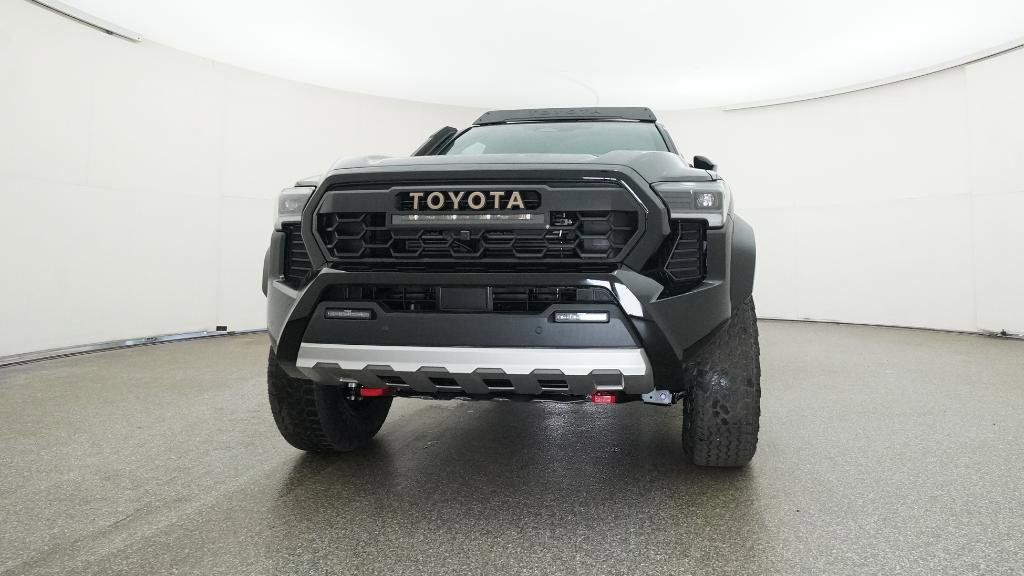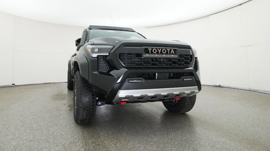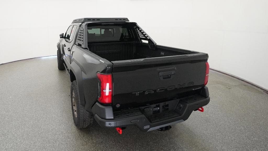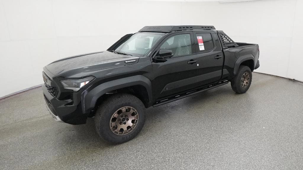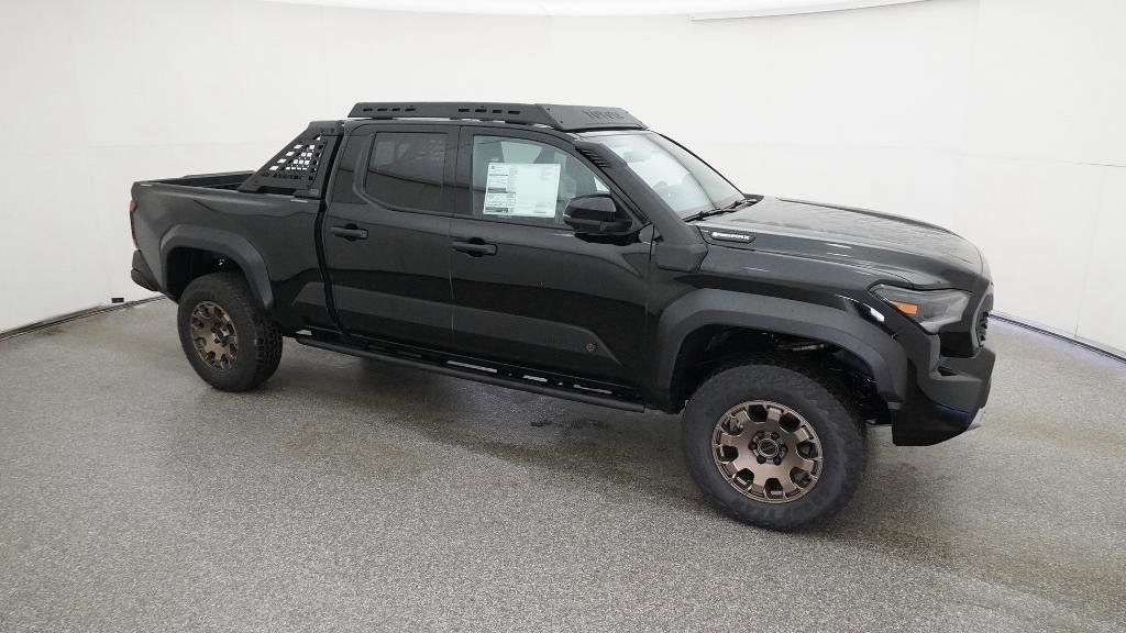 2025 Toyota Tacoma Hybrid Trailhunter Black 4WD 8-Speed Automatic 2.4L I4 PDI Hybrid Turbocharged DOHC 16V3.583 Axle Ratio, 4-Wheel Disc Brakes, 9 Speakers, ABS brakes, Air Conditioning, Alloy wheels, AM/FM radio: SiriusXM, Anti-whiplash front head restraints, Apple CarPlay/Android Auto, Auto High-beam Headlights, Auto-dimming Rear-View mirror, Automatic temperature control, Brake assist, Bumpers: body-color, Driver door bin, Driver vanity mirror, Dual front impact airbags, Dual front side impact airbags, Electronic Stability Control, Emergency communication system: Safety Connect (1-year trial), Exterior Parking Camera Rear, Four wheel independent suspension, Front anti-roll bar, Front Bucket Seats, Front Center Armrest, Front dual zone A/C, Front fog lights, Front reading lights, Fully automatic headlights, Garage door transmitter: HomeLink, Heads-Up Display, Heated & Ventilated Front Bucket Seats, Heated door mirrors, Heated front seats, Heated steering wheel, Illuminated entry, JBL Premium Audio, Knee airbag, Leather Shift Knob, Leather steering wheel, Low tire pressure warning, Navigation system: Drive Connect (1 year trial) includes Cloud Navigation with real time traffic and Google POI, Occupant sensing airbag, Outside temperature display, Overhead airbag, Overhead console, Panic alarm, Passenger door bin, Passenger vanity mirror, Power door mirrors, Power driver seat, Power passenger seat, Power steering, Power windows, Radio: 14 Toyota Audio Multimedia, Rear anti-roll bar, Rear step bumper, Rear window defroster, Remote keyless entry, Security system, SofTex Seat Trim, Speed control, Speed-sensing steering, Split folding rear seat, Steering wheel mounted audio controls, Tachometer, Telescoping steering wheel, Tilt steering wheel, Traction control, Trip computer, Turn signal indicator mirrors, Variably intermittent wipers, Ventilated front seats, Wheels: 18 Bronze-Finished Trailhunter Alloy.