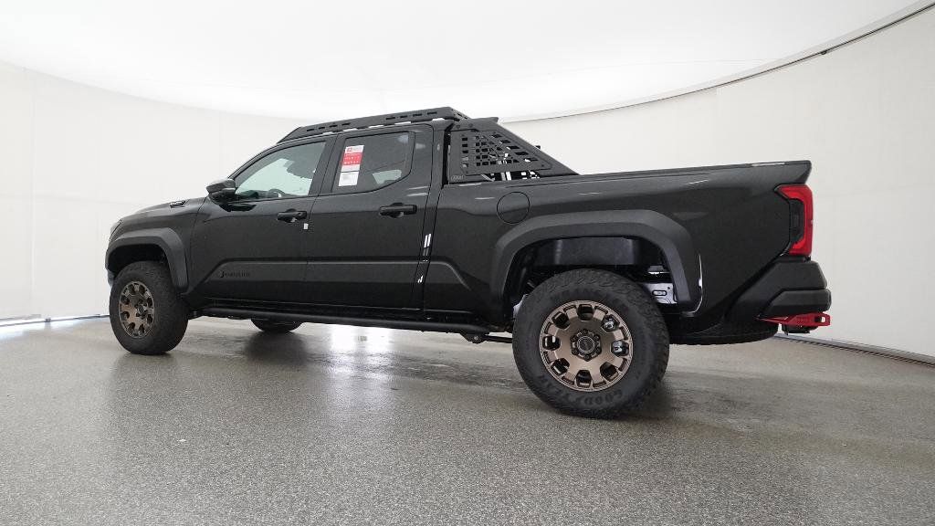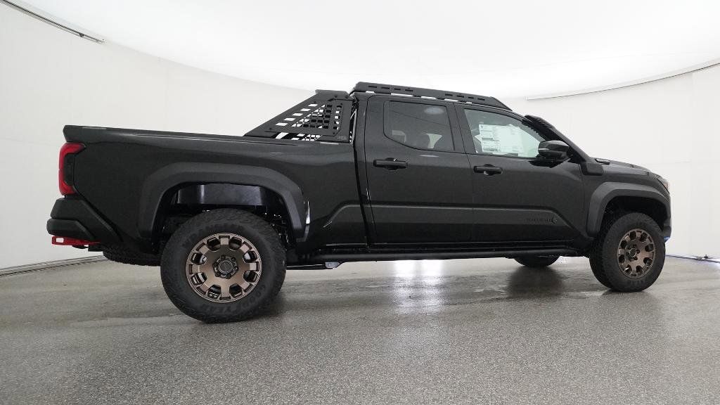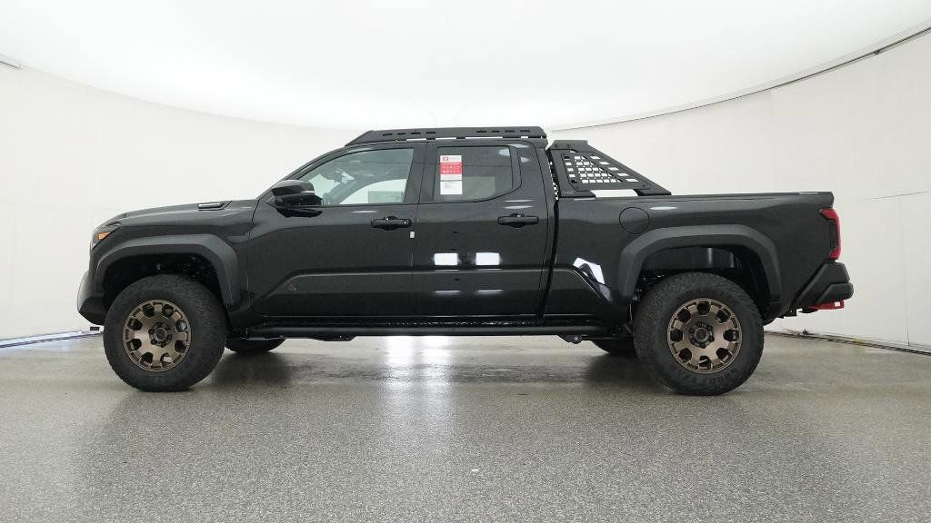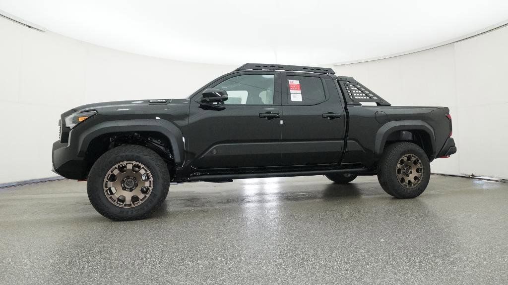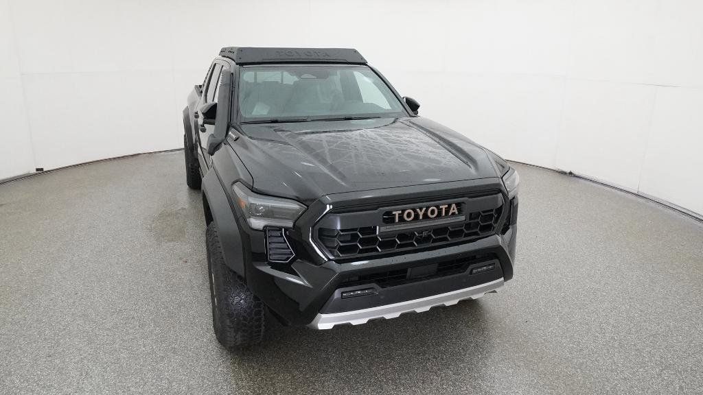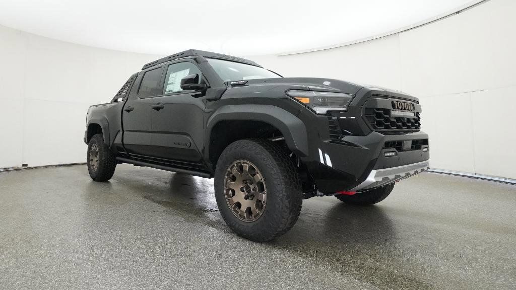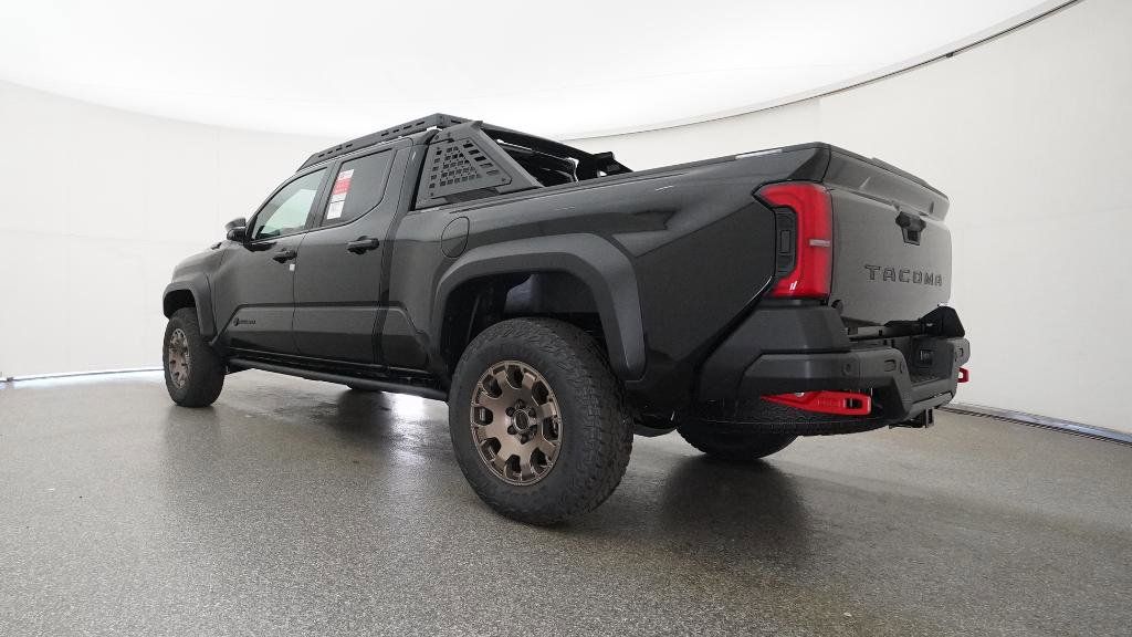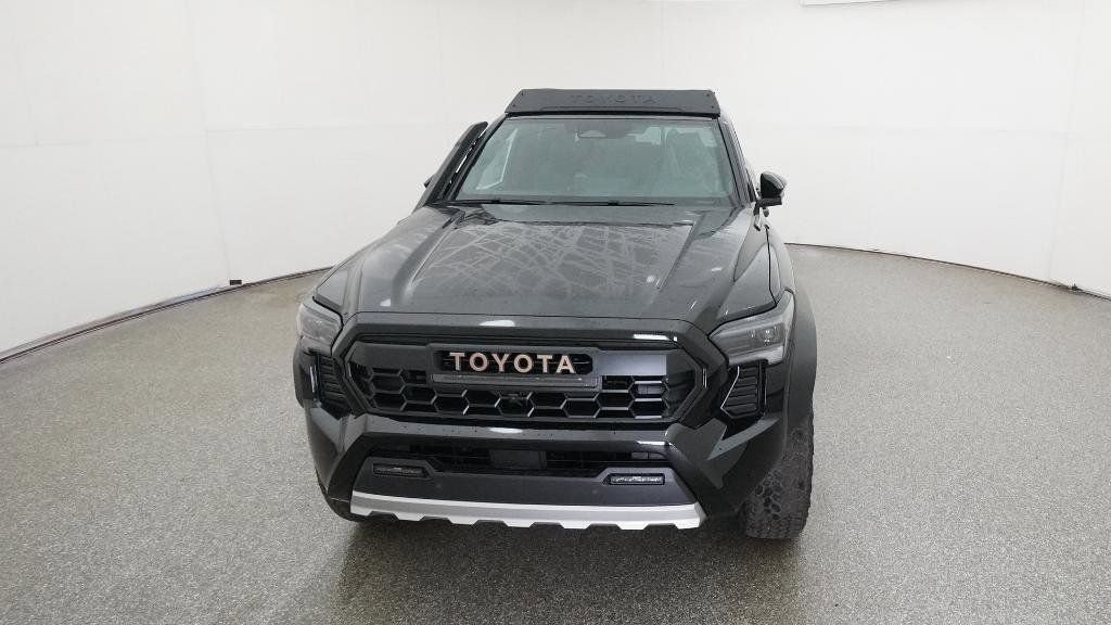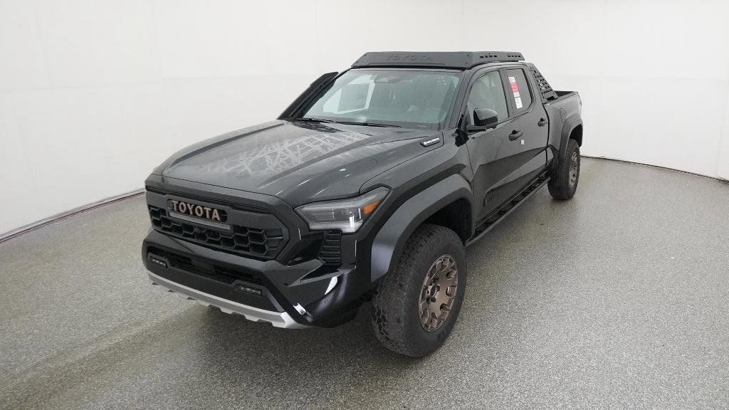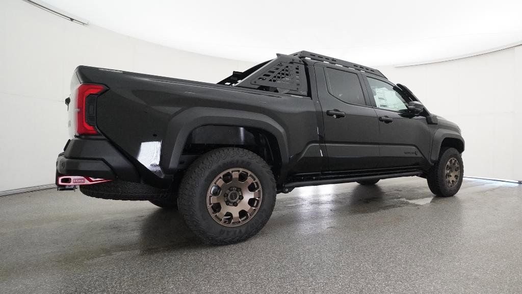 2025 Toyota Tacoma Hybrid Trailhunter Black 4WD 8-Speed Automatic 2.4L I4 PDI Hybrid Turbocharged DOHC 16V3.583 Axle Ratio, 4-Wheel Disc Brakes, 9 Speakers, ABS brakes, Air Conditioning, Alloy wheels, AM/FM radio: SiriusXM, Anti-whiplash front head restraints, Apple CarPlay/Android Auto, Auto High-beam Headlights, Auto-dimming Rear-View mirror, Automatic temperature control, Brake assist, Bumpers: body-color, Driver door bin, Driver vanity mirror, Dual front impact airbags, Dual front side impact airbags, Electronic Stability Control, Emergency communication system: Safety Connect (1-year trial), Exterior Parking Camera Rear, Four wheel independent suspension, Front anti-roll bar, Front Bucket Seats, Front Center Armrest, Front dual zone A/C, Front fog lights, Front reading lights, Fully automatic headlights, Garage door transmitter: HomeLink, Heads-Up Display, Heated & Ventilated Front Bucket Seats, Heated door mirrors, Heated front seats, Heated steering wheel, Illuminated entry, JBL Premium Audio, Knee airbag, Leather Shift Knob, Leather steering wheel, Low tire pressure warning, Navigation system: Drive Connect (1 year trial) includes Cloud Navigation with real time traffic and Google POI, Occupant sensing airbag, Outside temperature display, Overhead airbag, Overhead console, Panic alarm, Passenger door bin, Passenger vanity mirror, Power door mirrors, Power driver seat, Power passenger seat, Power steering, Power windows, Radio: 14 Toyota Audio Multimedia, Rear anti-roll bar, Rear step bumper, Rear window defroster, Remote keyless entry, Security system, SofTex Seat Trim, Speed control, Speed-sensing steering, Split folding rear seat, Steering wheel mounted audio controls, Tachometer, Telescoping steering wheel, Tilt steering wheel, Traction control, Trip computer, Turn signal indicator mirrors, Variably intermittent wipers, Ventilated front seats, Wheels: 18 Bronze-Finished Trailhunter Alloy.