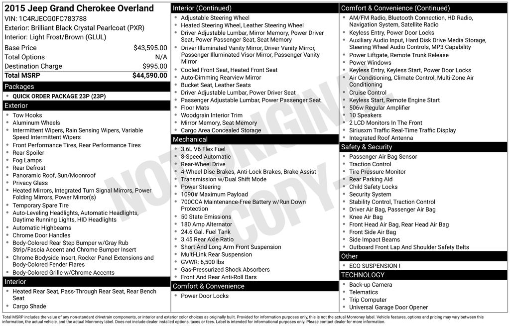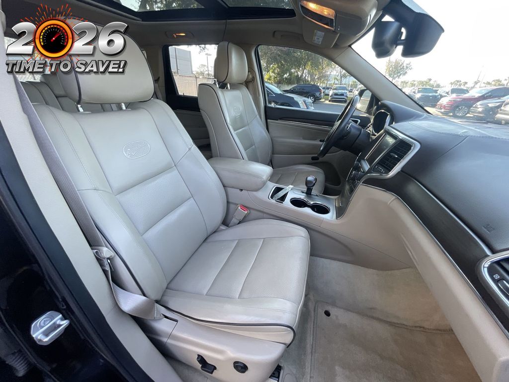 BACKUP CAMERA, BLUETOOTH HANDS FREE, LOCAL TRADE IN, NAVIGATION SYSTEM, POWER LIFTGATE, PUSH BUTTON START, CRUISE CONTROL, NON SMOKER, Grand Cherokee Overland, 4D Sport Utility, 3.6L V6 24V VVT, 8-Speed Automatic, RWD, Brilliant Black Crystal Pearlcoat, Light Frost/Brown Leather, ABS brakes, Front dual zone A/C, Low tire pressure warning, Remote keyless entry, Steering wheel mounted audio controls, 10 Speakers, 20" x 8.0" Aluminum Wheels, 3.45 Rear Axle Ratio, 4-Wheel Disc Brakes, 8.4" Touchscreen Display, Air Conditioning, Alloy wheels, AM/FM radio: SiriusXM, Anti-whiplash front head restraints, Audio memory, Auto High-beam Headlights, Auto-dimming door mirrors, Auto-dimming Rear-View mirror, Automatic temperature control, Brake assist, Bumpers: body-color, Compass, Delay-off headlights, Driver door bin, Driver vanity mirror, Dual front impact airbags, Dual front side impact airbags, Eco Suspension I, Electronic Stability Control, Exterior Parking Camera Rear, Four wheel independent suspension, Front anti-roll bar, Front Bucket Seats, Front Center Armrest w/Storage, Front fog lights, Front reading lights, Fully automatic headlights, Garage door transmitter, Genuine wood dashboard insert, GPS Antenna Input, Heated door mirrors, Heated front seats, Heated rear seats, Heated steering wheel, High intensity discharge headlights: Bi-Xenon, Illuminated entry, Knee airbag, Leather Shift Knob, Leather steering wheel, Leather Trim Seats w/Edge Welting, Memory seat, Navigation System, Occupant sensing airbag, Outside temperature display, Overhead airbag, Overhead console, Panic alarm, Passenger door bin, Passenger vanity mirror, Power door mirrors, Power driver seat, Power Liftgate, Power moonroof, Power passenger seat, Power steering, Power windows, Quick Order Package 23P, Radio data system, Radio: Uconnect 8.4 NAV, Rain sensing wipers, Rear anti-roll bar, Rear Parking Sensors, Rear reading lights, Rear seat center armrest, Rear window defroster, Rear window wiper, Roof rack: rails only, Security system, Speed control, Speed-Sensitive Wipers, Split folding rear seat, Spoiler, Tachometer, Telescoping steering wheel, Tilt steering wheel, Traction control, Trip computer, Turn signal indicator mirrors, Variably intermittent wipers, Ventilated front seats, Grand Cherokee Overland, 4D Sport Utility, 3.6L V6 24V VVT, 8-Speed Automatic, RWD, Brilliant Black Crystal Pearlcoat, Light Frost/Brown Leather, ABS brakes, Front dual zone A/C, Low tire pressure warning, Remote keyless entry, Steering wheel mounted audio controls.
