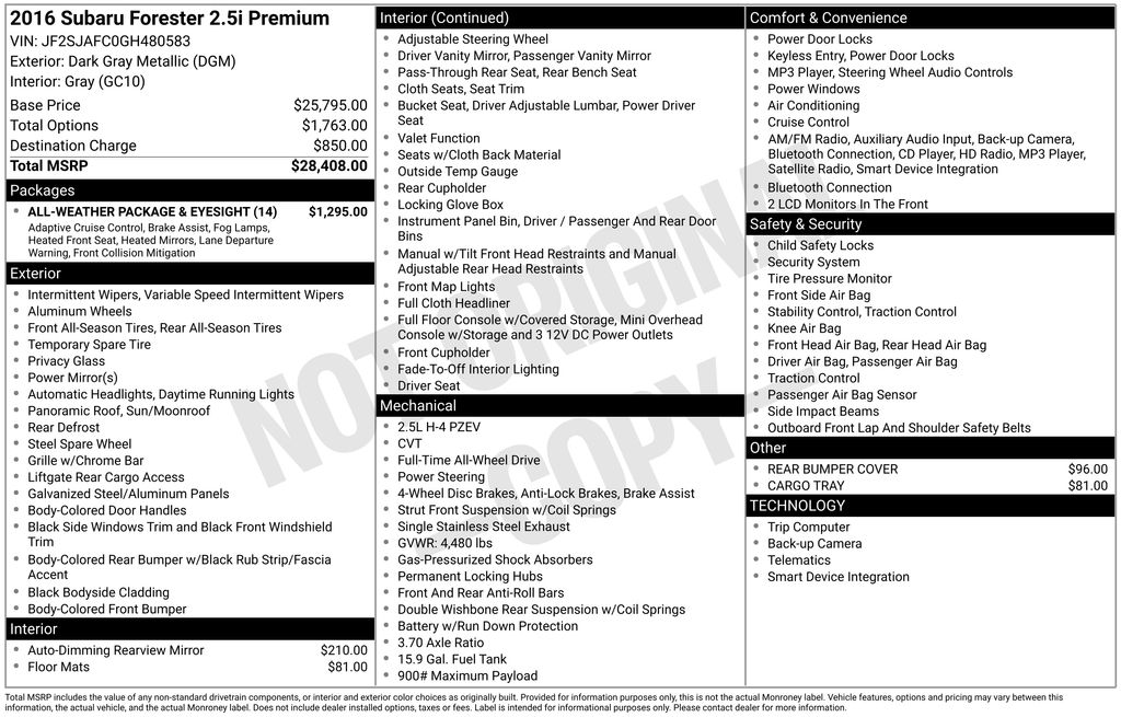 BACKUP CAMERA, BLUETOOTH HANDS FREE, AWD/ALLWHEEL DRIVE, POWER SEATS, LOCAL TRADE IN, SUNROOF/MOONROOF, CRUISE CONTROL, NON SMOKER, Forester 2.5i Premium AWD, 4D Sport Utility, 2.5L 4-Cylinder DOHC 16V VVT, Lineartronic CVT, AWD, Dark Gray Metallic, Gray Cloth, Steering wheel mounted audio controls, 17" Alloy Wheels, 3.70 Axle Ratio, 4-Wheel Disc Brakes, 6 Speakers, ABS brakes, Air Conditioning, All Weather Floor Mats, All-Weather Package & EyeSight, Alloy wheels, AM/FM radio: SiriusXM, Auto-Dimming Mirror Compass, Brake assist, Bumpers: body-color, Cargo Tray, CD player, Cloth Upholstery, Driver door bin, Driver vanity mirror, Dual front impact airbags, Dual front side impact airbags, Electronic Stability Control, Emergency communication system: STARLINK, Exterior Parking Camera Rear, EyeSight System, Four wheel independent suspension, Front anti-roll bar, Front Bucket Seats, Front Center Armrest, Front reading lights, Heated Exterior Mirrors, Heated Front Seats, Illuminated entry, Knee airbag, Low tire pressure warning, Occupant sensing airbag, Outside temperature display, Overhead airbag, Overhead console, Panic alarm, Passenger door bin, Passenger vanity mirror, Power door mirrors, Power driver seat, Power moonroof, Power steering, Power windows, Radio data system, Radio: Subaru Starlink 7.0" Multimedia Plus System, Rear anti-roll bar, Rear Bumper Cover, Rear seat center armrest, Rear window defroster, Rear window wiper, Remote keyless entry, Roof rack: rails only, Security system, Speed control, Split folding rear seat, Steering Responsive Fog Lights (SRF), Tachometer, Telescoping steering wheel, Tilt steering wheel, Traction control, Trip computer, Variably intermittent wipers, Windshield Wiper De-Icer, Forester 2.5i Premium AWD, 4D Sport Utility, 2.5L 4-Cylinder DOHC 16V VVT, Lineartronic CVT, AWD, Dark Gray Metallic, Gray Cloth, Steering wheel mounted audio controls.