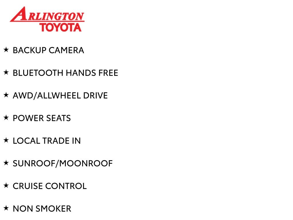 Prices do not include tax, tag, title, a pre-delivery service fee* of $894.00, an electronic registration filing fee* of $199.00 (*these charges represent costs and profits to the dealer for items such as inspecting, cleaning, and preparing documents related to the sale), and an Arlington Toyota Total Value Package of $1,889.00 (*these charges represent costs and profits to the dealer for items such as inspecting, cleaning, and preparing documents related to the sale). The final price is also subject to repair order reconditioning costs. Any price does not include dealer-installed accessories. All offers are mutually exclusive. All vehicles are subject to prior sale. See dealer for complete details.