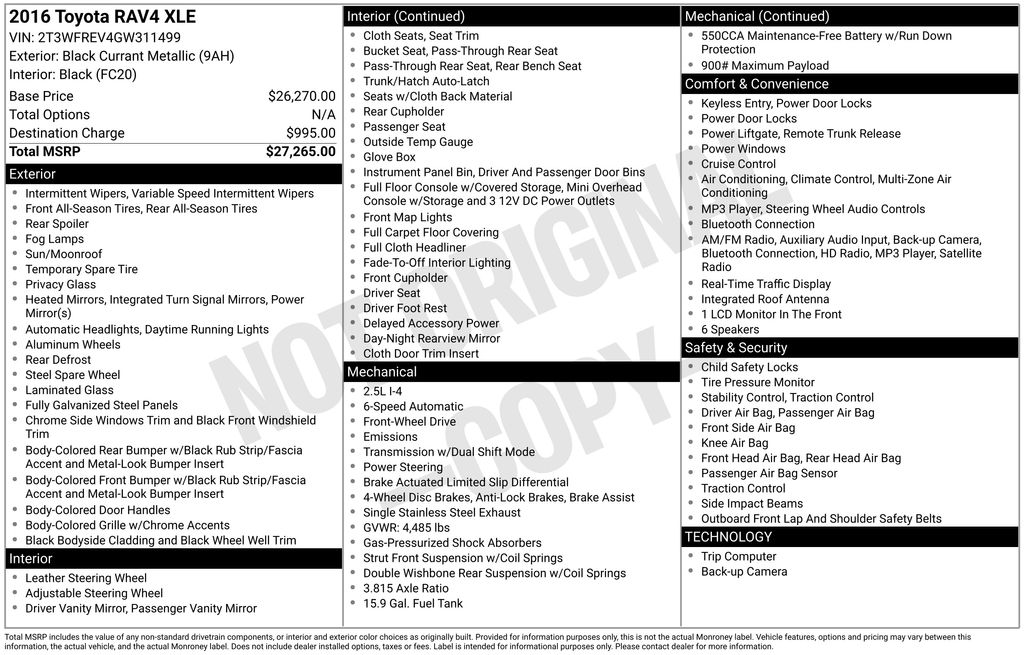 BACKUP CAMERA, BLUETOOTH HANDS FREE, LOCAL TRADE IN, CRUISE CONTROL, NON SMOKER, RAV4 XLE, 4D Sport Utility, 2.5L 4-Cylinder DOHC Dual VVT-i, 6-Speed Automatic, FWD, Black Currant Metallic, Black w/Fabric Seat Trim, ABS brakes, Electronic Stability Control, Four wheel independent suspension, Low tire pressure warning, Steering wheel mounted audio controls, 3.815 Axle Ratio, 4-Wheel Disc Brakes, 6 Speakers, Air Conditioning, Brake assist, Bumpers: body-color, Driver door bin, Driver vanity mirror, Dual front impact airbags, Dual front side impact airbags, Exterior Parking Camera Rear, Front anti-roll bar, Front Bucket Seats, Front Center Armrest, Front reading lights, Illuminated entry, Knee airbag, Occupant sensing airbag, Outside temperature display, Overhead airbag, Overhead console, Panic alarm, Passenger door bin, Passenger vanity mirror, Power door mirrors, Power steering, Power windows, Radio data system, Rear anti-roll bar, Rear seat center armrest, Rear window defroster, Rear window wiper, Remote keyless entry, Roof rack: rails only, Speed control, Speed-sensing steering, Split folding rear seat, Spoiler, Tachometer, Telescoping steering wheel, Tilt steering wheel, Traction control, Trip computer, RAV4 XLE, 4D Sport Utility, 2.5L 4-Cylinder DOHC Dual VVT-i, 6-Speed Automatic, FWD, Black Currant Metallic, Black w/Fabric Seat Trim, ABS brakes, Electronic Stability Control, Four wheel independent suspension, Low tire pressure warning, Steering wheel mounted audio controls.