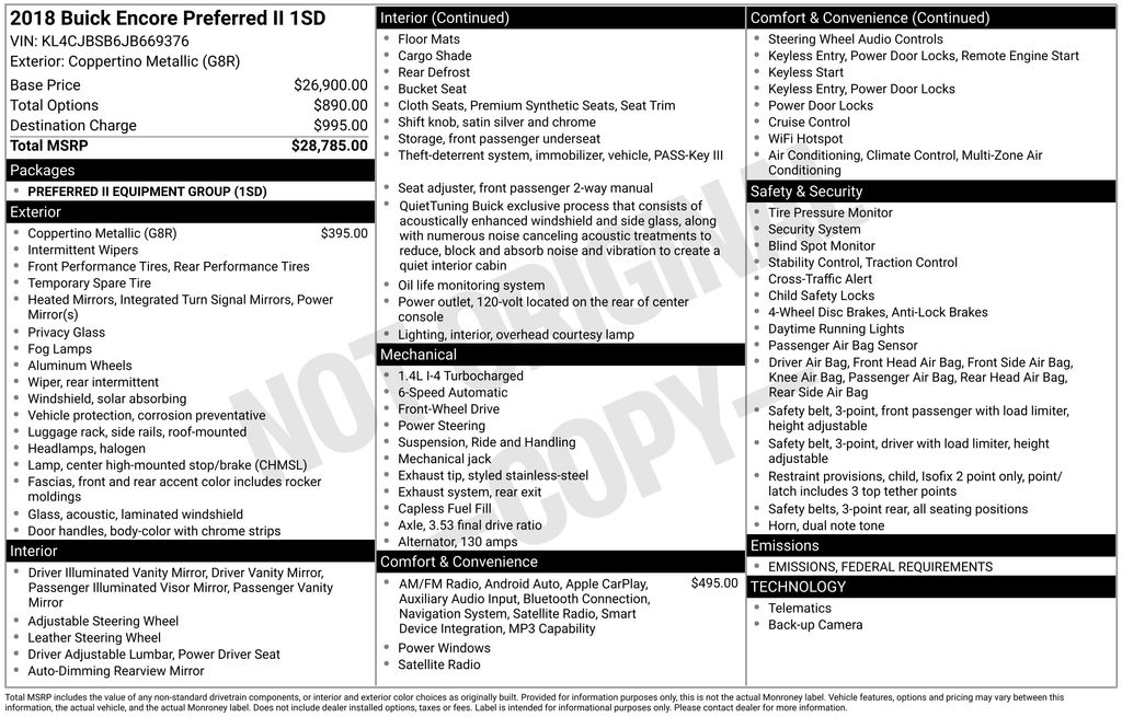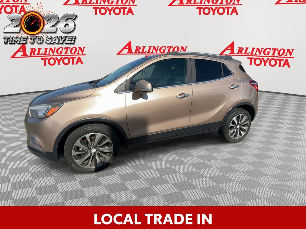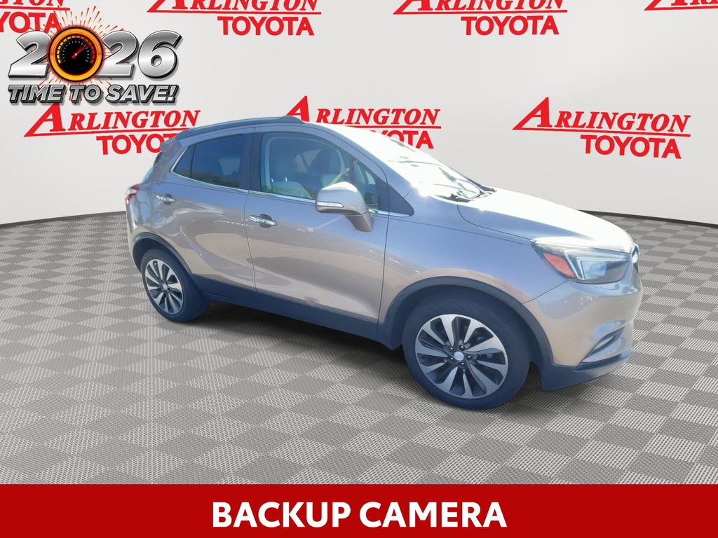 BACKUP CAMERA, BLUETOOTH HANDS FREE, POWER SEATS, LOCAL TRADE IN, PUSH BUTTON START, CRUISE CONTROL, NON SMOKER, Encore Preferred II, 4D Sport Utility, ECOTEC 1.4L I4 SMPI DOHC Turbocharged VVT, 6-Speed Automatic Electronic with Overdrive, FWD, Coppertino Metallic, Shale Cloth, ABS brakes, Electronic Stability Control, Front dual zone A/C, Fully automatic headlights, Low tire pressure warning, Remote Vehicle Starter System, Steering wheel mounted audio controls, 120-Volt Power Outlet, 18" Aluminum Wheels, 2-Way Manual Front Passenger Seat Adjuster, 3.53 Final Drive Axle Ratio, 4-Wheel Disc Brakes, 6 Speakers, 6-Speaker Audio System, 6-Way Power Driver Seat Adjuster, Air Conditioning, Alloy wheels, AM/FM radio: SiriusXM, Apple CarPlay/Android Auto, Auto-Dimming Inside Rear-View Mirror, Auto-dimming Rear-View mirror, Automatic temperature control, Brake assist, Bumpers: body-color, Cloth w/Leatherette Seat Trim, Compass, Delay-off headlights, Driver door bin, Driver vanity mirror, Driver's Seat Mounted Armrest, Dual front impact airbags, Dual front side impact airbags, Exterior Parking Camera Rear, Front anti-roll bar, Front Bucket Seats, Front Fog Lamps, Front fog lights, Front reading lights, Front wheel independent suspension, Heated door mirrors, Illuminated entry, Knee airbag, Occupant sensing airbag, Outside temperature display, Overhead airbag, Panic alarm, Passenger door bin, Passenger vanity mirror, Power door mirrors, Power driver seat, Power steering, Power windows, Preferred Equipment Group 1SD, Radio data system, Radio: Buick Infotainment System AM/FM Stereo, Radio: Buick Infotainment System AM/FM w/Nav, Rear Cross-Traffic Alert, Rear seat center armrest, Rear side impact airbag, Rear window defroster, Rear window wiper, Remote keyless entry, Ride & Handling Suspension, Roof rack: rails only, Security system, Side Blind Zone Alert, SiriusXM Satellite Radio, Speed control, Speed-sensing steering, Split folding rear seat, Spoiler, Tachometer, Telescoping steering wheel, Tilt steering wheel, Traction control, Trip computer, Turn signal indicator mirrors, Variably intermittent wipers, Encore Preferred II, 4D Sport Utility, ECOTEC 1.4L I4 SMPI DOHC Turbocharged VVT, 6-Speed Automatic Electronic with Overdrive, FWD, Coppertino Metallic, Shale Cloth, ABS brakes, Electronic Stability Control, Front dual zone A/C, Fully automatic headlights, Low tire pressure warning, Remote Vehicle Starter System, Steering wheel mounted audio controls.