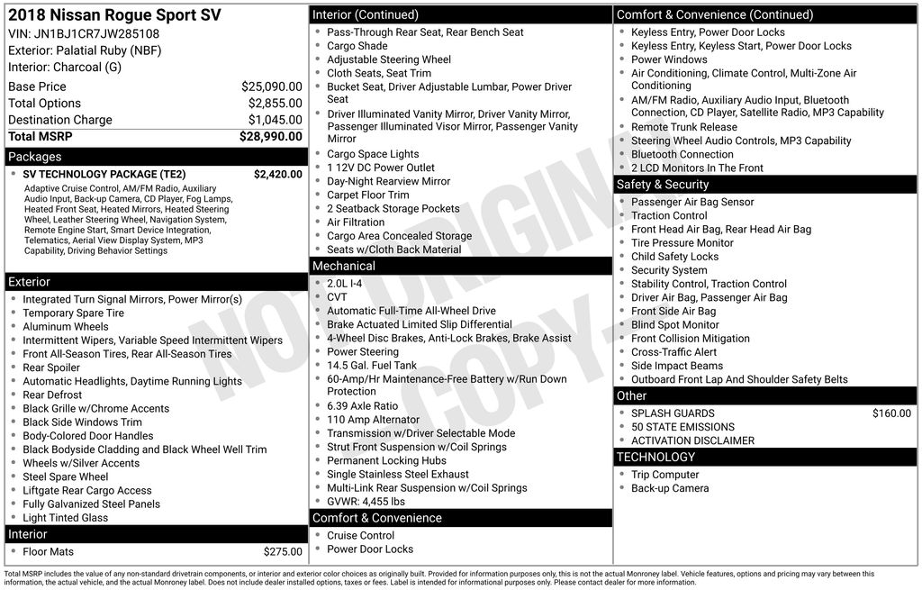 BACKUP CAMERA, BLUETOOTH HANDS FREE, BLIND SPOT MONITORING, AWD/ALLWHEEL DRIVE, POWER SEATS, LOCAL TRADE IN, LOW MILES, NAVIGATION SYSTEM, CRUISE CONTROL, NON SMOKER, Rogue Sport SV AWD, 4D Sport Utility, 2.0L DOHC, CVT with Xtronic, AWD, Palatial Ruby, Charcoal Cloth, ABS brakes, Electronic Stability Control, Fog Lights (X01), Four wheel independent suspension, Front dual zone A/C, Heated Leather Wrapped Steering Wheel, Heated Outside Mirrors, Intelligent Around View Monitor (I-AVM), Leather-Wrapped Shift Knob, Low tire pressure warning, NissanConnect w/Navigation, Mobile Apps & Services, Quick Comfort Heated Front Bucket Seats, Radio: AM/FM/CD/AUX NissanConnect w/Navigation, Remote Engine Start System, Remote keyless entry, Steering wheel mounted audio controls, SV Technology Package, Turn signal indicator mirrors, 4-Wheel Disc Brakes, 6 Speakers, 6.39 Axle Ratio, Activation Disclaimer, Air Conditioning, Alloy wheels, AM/FM radio: SiriusXM, Automatic temperature control, Blind Spot Warning, Brake assist, Bumpers: body-color, Carpeted Cargo Area Protector & Floor Mats, CD player, Cloth Seat Trim, Delay-off headlights, Driver door bin, Driver vanity mirror, Dual front impact airbags, Dual front side impact airbags, First Aid Kit, Front anti-roll bar, Front Bucket Seats, Front Center Armrest, Front reading lights, Fully automatic headlights, Illuminated entry, Occupant sensing airbag, Outside temperature display, Overhead airbag, Overhead console, Panic alarm, Passenger door bin, Passenger vanity mirror, Power door mirrors, Power driver seat, Power steering, Power windows, Radio data system, Radio: AM/FM/CD/AUX, Rear anti-roll bar, Rear seat center armrest, Rear window defroster, Rear window wiper, Roof rack: rails only, Security system, Speed control, Speed-Sensitive Wipers, Splash Guards, Split folding rear seat, Spoiler, Tachometer, Telescoping steering wheel, Tilt steering wheel, Traction control, Trip computer, Variably intermittent wipers, Wheels: 17" x 7.0" Aluminum Alloy, Rogue Sport SV AWD, 4D Sport Utility, 2.0L DOHC, CVT with Xtronic, AWD, Palatial Ruby, Charcoal Cloth, ABS brakes, Electronic Stability Control, Fog Lights (X01), Four wheel independent suspension, Front dual zone A/C, Heated Leather Wrapped Steering Wheel, Heated Outside Mirrors, Intelligent Around View Monitor (I-AVM), Leather-Wrapped Shift Knob, Low tire pressure warning, NissanConnect w/Navigation, Mobile Apps & Services, Quick Comfort Heated Front Bucket Seats, Radio: AM/FM/CD/AUX NissanConnect w/Navigation, Remote Engine Start System, Remote keyless entry, Steering wheel mounted audio controls, SV Technology Package, Turn signal indicator mirrors.