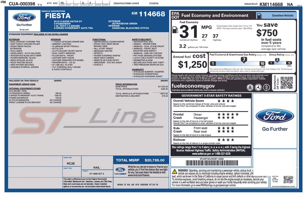 Fiesta ST, 4D Hatchback, 1.6L I4 Ti-VCT, 6-Speed Automatic with Powershift, FWD, Outrageous Green Metallic Tinted Clearcoat, Charcoal Black Bolster With Red Seat Stitching Cloth, ABS brakes, Alloy wheels, Compass, Electronic Stability Control, Illuminated entry, Low tire pressure warning, Remote keyless entry, Traction control.