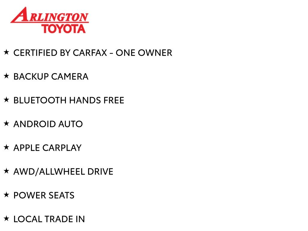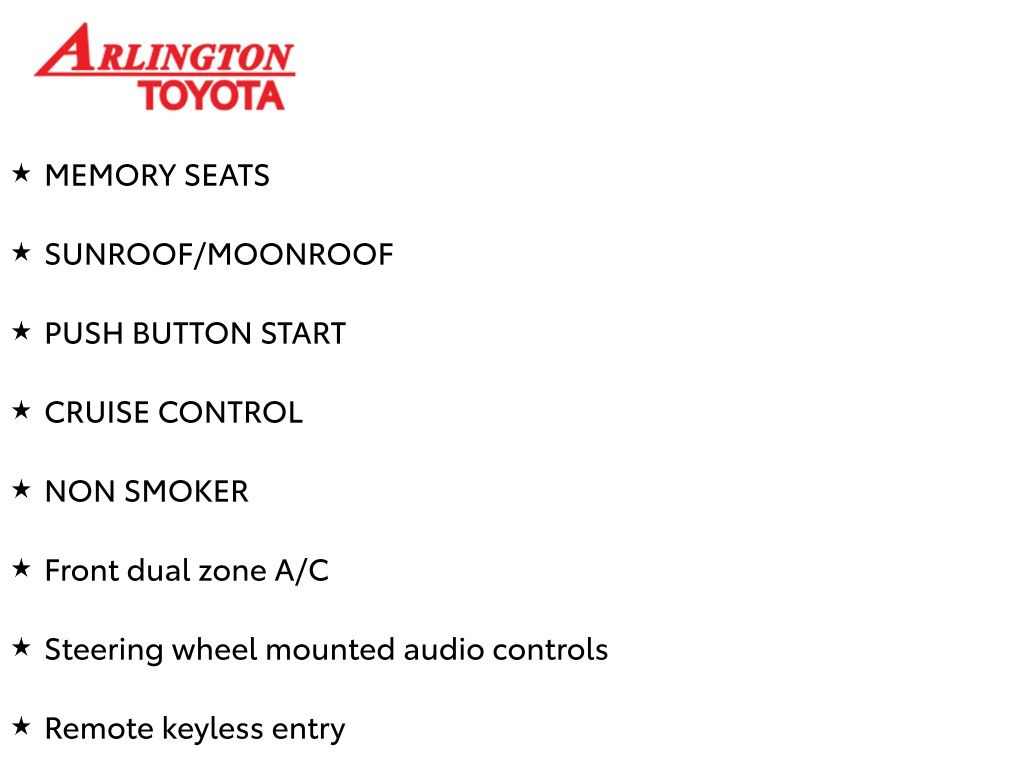 Prices do not include tax, tag, title, a pre-delivery service fee* of $894.00, an electronic registration filing fee* of $199.00 (*these charges represent costs and profits to the dealer for items such as inspecting, cleaning, and preparing documents related to the sale), and an Arlington Toyota Total Value Package of $1,889.00 (*these charges represent costs and profits to the dealer for items such as inspecting, cleaning, and preparing documents related to the sale). The final price is also subject to repair order reconditioning costs. Any price does not include dealer-installed accessories. All offers are mutually exclusive. All vehicles are subject to prior sale. See dealer for complete details.
