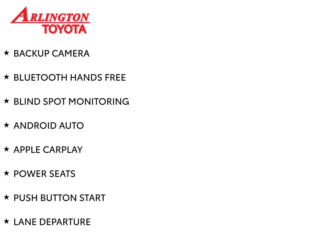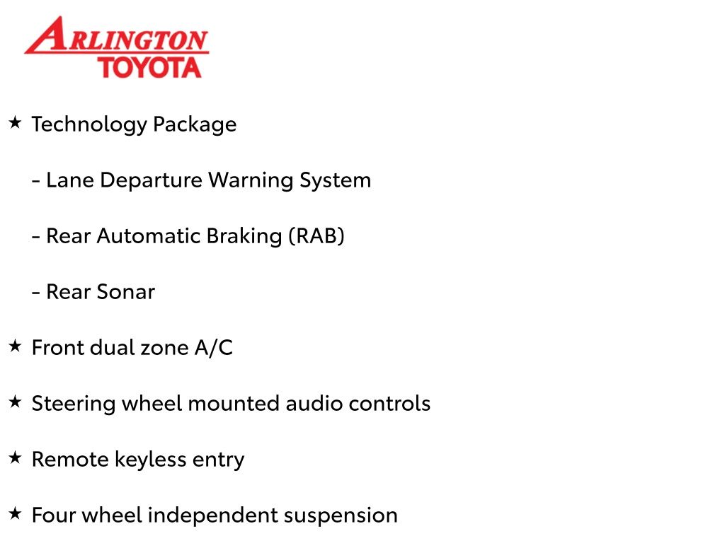 Prices do not include tax, tag, title, a pre-delivery service fee* of $894.00, an electronic registration filing fee* of $199.00 (*these charges represent costs and profits to the dealer for items such as inspecting, cleaning, and preparing documents related to the sale), and an Arlington Toyota Total Value Package of $1,889.00 (*these charges represent costs and profits to the dealer for items such as inspecting, cleaning, and preparing documents related to the sale). The final price is also subject to repair order reconditioning costs. Any price does not include dealer-installed accessories. All offers are mutually exclusive. All vehicles are subject to prior sale. See dealer for complete details.