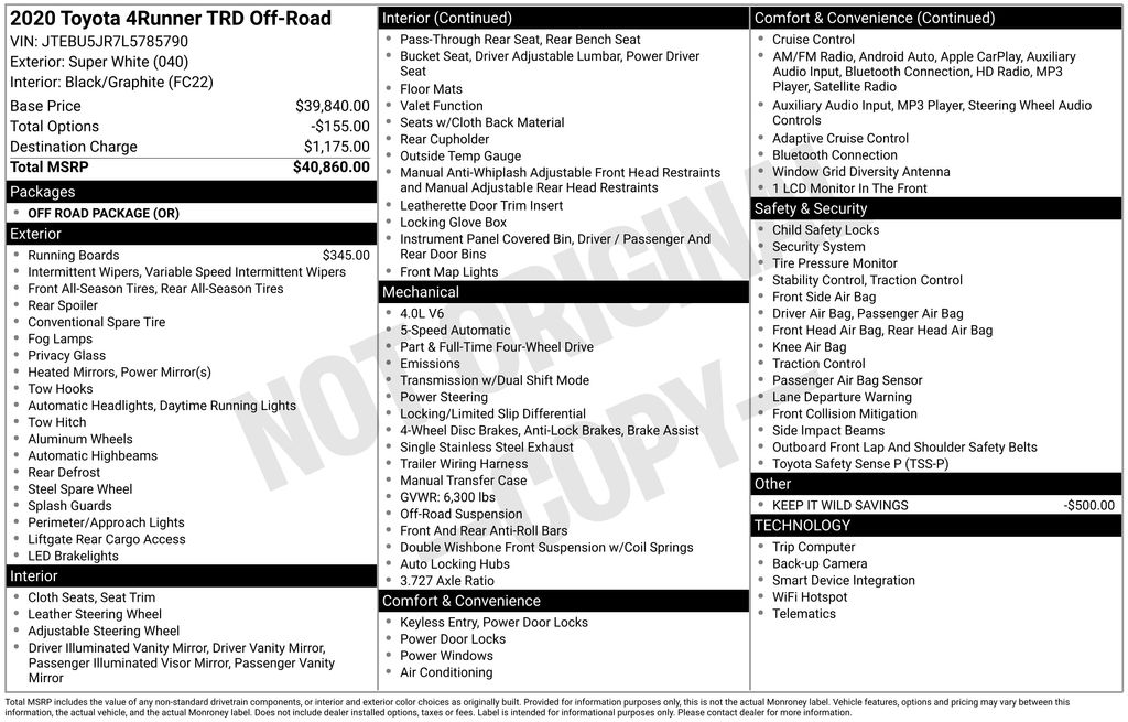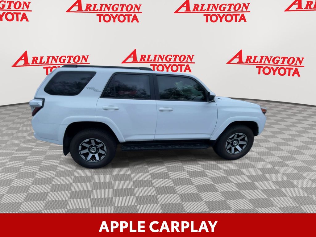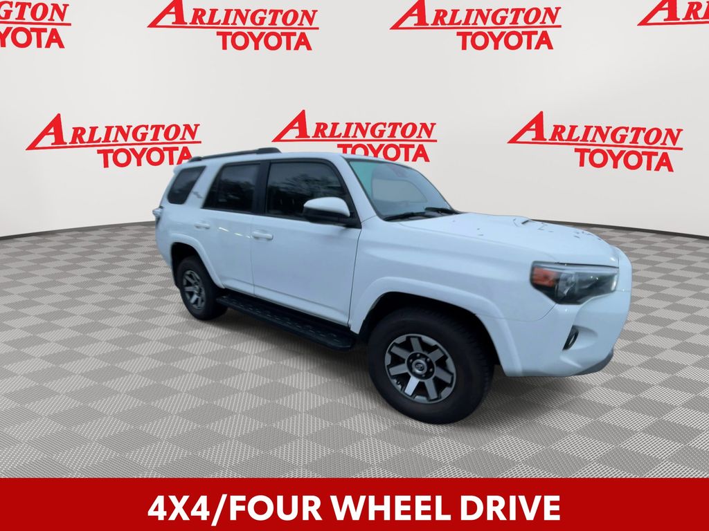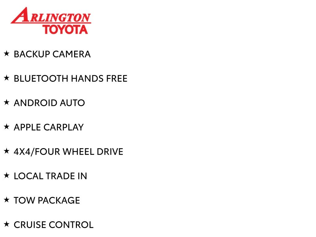 BACKUP CAMERA, BLUETOOTH HANDS FREE, ANDROID AUTO, APPLE CARPLAY, 4X4/FOUR WHEEL DRIVE, LOCAL TRADE IN, TOW PACKAGE, CRUISE CONTROL, NON SMOKER, 4Runner TRD Off-Road 4X4, 4D Sport Utility, 4.0L V6 SMPI DOHC, 5-Speed Automatic with Overdrive, 4WD, Super White, Graphite Cloth, ABS brakes, Electronic Stability Control, Low tire pressure warning, Remote keyless entry, Steering wheel mounted audio controls, 3.727 Axle Ratio, 4-Wheel Disc Brakes, 8 Speakers, Air Conditioning, Alloy wheels, AM/FM radio: SiriusXM, Anti-whiplash front head restraints, Apple CarPlay/Android Auto, Auto High-beam Headlights, Black Roof Rails, Brake assist, Bumpers: body-color, Compass, Driver door bin, Driver vanity mirror, Dual front impact airbags, Dual front side impact airbags, Exterior Parking Camera Rear, Fabric Seat Trim, Front anti-roll bar, Front Bucket Seats, Front Center Armrest, Front fog lights, Front reading lights, Front wheel independent suspension, Heated door mirrors, Illuminated entry, Knee airbag, Leather Shift Knob, Occupant sensing airbag, Outside temperature display, Overhead airbag, Overhead console, Panic alarm, Passenger door bin, Passenger vanity mirror, Power door mirrors, Power driver seat, Power steering, Power windows, Radio: Audio Plus, Radio: Premium Audio w/Dynamic Navigation, Rear anti-roll bar, Rear seat center armrest, Rear window defroster, Rear window wiper, Roof rack: rails only, Security system, Speed control, Speed-sensing steering, Split folding rear seat, Spoiler, Tachometer, Telescoping steering wheel, Tilt steering wheel, Traction control, Trip computer, Variably intermittent wipers, Wheels: 17" x 7.5" 7-Spoke Unique Off-Road Alloy, 4Runner TRD Off-Road 4X4, 4D Sport Utility, 4.0L V6 SMPI DOHC, 5-Speed Automatic with Overdrive, 4WD, Super White, Graphite Cloth, ABS brakes, Electronic Stability Control, Low tire pressure warning, Remote keyless entry, Steering wheel mounted audio controls.