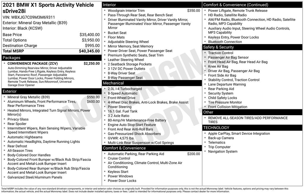 BACKUP CAMERA, BLUETOOTH HANDS FREE, ANDROID AUTO, APPLE CARPLAY, POWER SEATS, MEMORY SEATS, POWER LIFTGATE, TURBOCHARGED, PUSH BUTTON START, CRUISE CONTROL, NON SMOKER, X1 sDrive28i Convenience, 4D Sport Utility, 2.0L 4-Cylinder DOHC 16V TwinPower Turbo, 8-Speed Automatic, FWD, Mineral Gray Metallic, Black w/SensaTec Upholstery, ABS brakes, Auto-Dimming Interior & Exterior Mirrors, Auto-Dimming Rear-View Mirror, Comfort Access Keyless Entry, Convenience Package, Electronic Stability Control, Four wheel independent suspension, Front dual zone A/C, Lights Package, Low tire pressure warning, Lumbar Support, Panoramic Moonroof, Power-Folding Mirrors, Remote keyless entry, Steering wheel mounted audio controls, Turn signal indicator mirrors, Universal Garage-Door Opener, 3.2 Axle Ratio, 4-Wheel Disc Brakes, 7 Speakers, Advanced Real-Time Traffic Information, Air Conditioning, Alloy wheels, AM/FM radio: SiriusXM, Apple CarPlay Compatibility, Auto High-beam Headlights, Automatic temperature control, BMW Assist eCall, BMW TeleServices, Brake assist, Bumpers: body-color, Compass, ConnectedDrive Services, Delay-off headlights, Driver door bin, Driver vanity mirror, Dual front impact airbags, Dual front side impact airbags, DVD Area Coding (North America), Exterior Parking Camera Rear, Fine Wood Fineline Trim w/Pearl Chrome Accent, Front anti-roll bar, Front Bucket Seats, Front Center Armrest, Front reading lights, Heated door mirrors, Hi-Fi Sound System, Illuminated entry, Knee airbag, Leather Shift Knob, Memory seat, Navigation Business, Navigation System, Occupant sensing airbag, Outside temperature display, Overhead airbag, Panic alarm, Parking Assistant, Passenger door bin, Passenger vanity mirror, Power door mirrors, Power driver seat, Power Front Seats, Power Liftgate, Power passenger seat, Power steering, Power windows, Radio Control US, Radio data system, Radio: Professional w/Bluetooth/USB, Rain sensing wipers, Rear anti-roll bar, Rear reading lights, Rear seat center armrest, Rear window defroster, Rear window wiper, Remote Services, Roof rack: rails only, Security system, SensaTec Upholstery, SiriusXM Satellite Radio, Speed control, Speed-sensing steering, Speed-Sensitive Wipers, Split folding rear seat, Spoiler, Sport steering wheel, Tachometer, Telescoping steering wheel, Tilt steering wheel, Traction control, Trip computer, Variably intermittent wipers, Wheels: 18" x 7.5" Y-Spoke Bi-Color, Wheels: 19" x 8.0" Y-Spoke Bi-Color, X1 sDrive28i Convenience, 4D Sport Utility, 2.0L 4-Cylinder DOHC 16V TwinPower Turbo, 8-Speed Automatic, FWD, Mineral Gray Metallic, Black w/SensaTec Upholstery, ABS brakes, Auto-Dimming Interior & Exterior Mirrors, Auto-Dimming Rear-View Mirror, Comfort Access Keyless Entry, Convenience Package, Electronic Stability Control, Four wheel independent suspension, Front dual zone A/C, Lights Package, Low tire pressure warning, Lumbar Support, Panoramic Moonroof, Power-Folding Mirrors, Remote keyless entry, Steering wheel mounted audio controls, Turn signal indicator mirrors, Universal Garage-Door Opener.