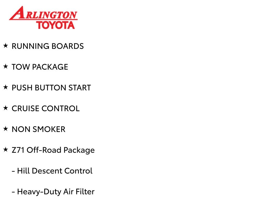 Prices do not include tax, tag, title, a pre-delivery service fee* of $894.00, an electronic registration filing fee* of $199.00 (*these charges represent costs and profits to the dealer for items such as inspecting, cleaning, and preparing documents related to the sale), and an Arlington Toyota Total Value Package of $1,889.00 (*these charges represent costs and profits to the dealer for items such as inspecting, cleaning, and preparing documents related to the sale). The final price is also subject to repair order reconditioning costs. Any price does not include dealer-installed accessories. All offers are mutually exclusive. All vehicles are subject to prior sale. See dealer for complete details.
