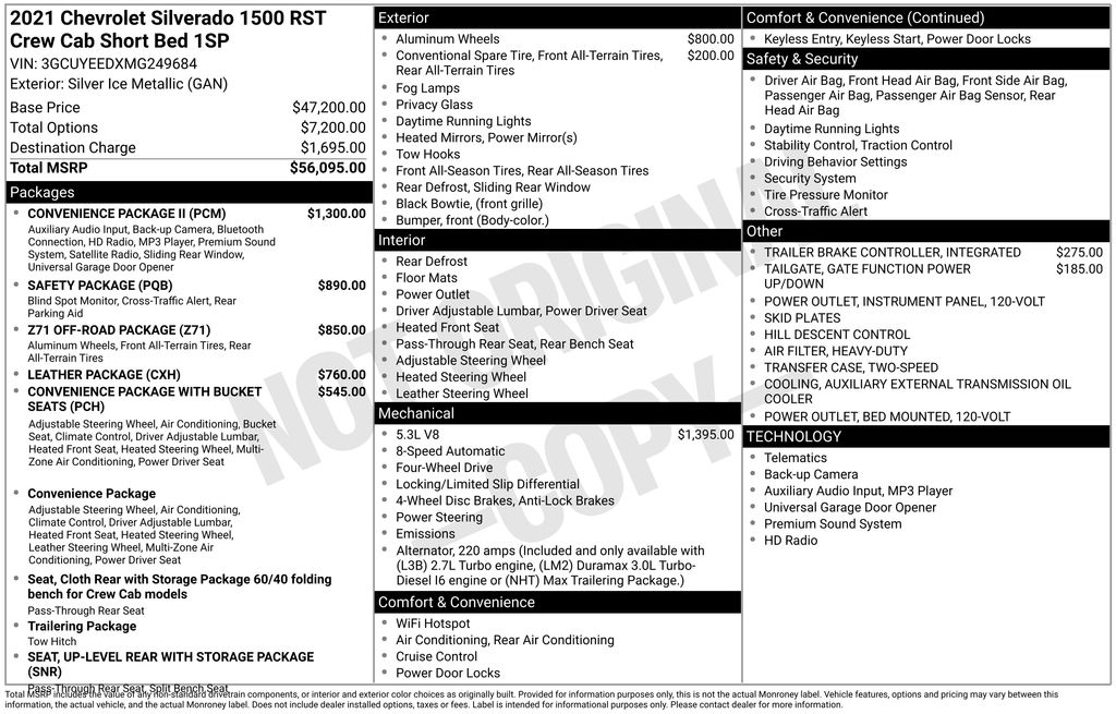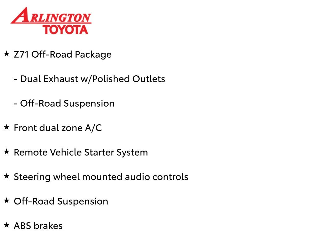 CERTIFIED BY CARFAX - ONE OWNER, BACKUP CAMERA, BLUETOOTH HANDS FREE, ANDROID AUTO, APPLE CARPLAY, 4X4/FOUR WHEEL DRIVE, POWER SEATS, LOCAL TRADE IN, RUNNING BOARDS, TOW PACKAGE, PUSH BUTTON START, CRUISE CONTROL, NON SMOKER, Silverado 1500 RST 4X4, 4D Crew Cab, EcoTec3 5.3L V8, 8-Speed Automatic, 4WD, Silver Ice Metallic, Black Leather, ABS brakes, Dual Exhaust w/Polished Outlets, Electronic Stability Control, Front dual zone A/C, Fully automatic headlights, Heavy-Duty Air Filter, Hill Descent Control, Low tire pressure warning, Off-Road Suspension, Remote Vehicle Starter System, Steering wheel mounted audio controls, Z71 Off-Road Package, 10-Way Power Driver Seat w/Lumbar, 12-Volt Rear Auxiliary Power Outlet, 120-Volt Bed Mounted Power Outlet, 120-Volt Instrument Panel Power Outlet, 170 Amp Alternator, 2 USB Ports, 2 USB Ports (First Row), 220 Amp Alternator, 3.23 Rear Axle Ratio, 4-Wheel Disc Brakes, 4.2" Diagonal Color Display Driver Info Center, 40/20/40 Front Split-Bench Seat, 4G LTE Wi-Fi Hot Spot Capable, 6 Speakers, 6-Speaker Audio System, Air Conditioning, All-Star Edition, Alloy wheels, AM/FM radio: SiriusXM, Apple CarPlay/Android Auto, Auto-Locking Rear Differential, Automatic temperature control, Auxiliary External Transmission Oil Cooler, Bluetooth® For Phone, Body Color Grille, Brake assist, Bumpers: body-color, Chevrolet Connected Access Capable, Cloth Rear Seat w/Storage Package, Cloth Seat Trim, Color-Keyed Carpeting Floor Covering, Compass, Convenience Package, Convenience Package II, Convenience Package w/Buckets Seats, Deep-Tinted Glass, Delay-off headlights, Driver door bin, Driver vanity mirror, Dual front impact airbags, Dual front side impact airbags, Dual-Zone Automatic Climate Control, Electric Rear-Window Defogger, Electrical Lock Control Steering Column, Electronic Cruise Control, External Engine Oil Cooler, EZ Lift Power Lock & Release Tailgate, Floor Mounted Center Console, Front anti-roll bar, Front Bucket Seats, Front Center Armrest w/Storage, Front fog lights, Front Frame-Mounted Black Recovery Hooks, Front LED Fog Lamps, Front reading lights, Front Rubberized Vinyl Floor Mats, Front wheel independent suspension, HD Radio, HD Rear Vision Camera, Heated door mirrors, Heated Driver & Front Outboard Passenger Seats, Heated front seats, Heated Steering Wheel, Heated steering wheel, Heavy Duty Suspension, High Gloss Black Mirror Caps, Hitch Guidance, Illuminated entry, Integrated Trailer Brake Controller, Keyless Open & Start, Lane Change Alert w/Side Blind Zone Alert, Leather Package, Leather Wrapped Steering Wheel, Leather-Appointed Front Seat Trim, LED Cargo Area Lighting, Manual Tilt/Telescoping Steering Column, Occupant sensing airbag, OnStar & Chevrolet Connected Services Capable, Outside temperature display, Overhead airbag, Overhead console, Panic alarm, Passenger door bin, Passenger vanity mirror, Power Door Locks, Power door mirrors, Power driver seat, Power Front Windows w/Driver Express Up/Down, Power Front Windows w/Passenger Express Down, Power Rear Windows w/Express Down, Power Sliding Rear Window w/Rear Defogger, Power steering, Power Tailgate, Power windows, Preferred Equipment Group 1SP, Premium audio system: Chevrolet Infotainment 3, Premium Bose 7-Speaker Sound System, Radio data system, Radio: Chevrolet Infotainment 3 Plus System, Radio: Chevrolet Infotainment 3 System, Rear 60/40 Folding Bench Seat (Folds Up), Rear Cross Traffic Alert, Rear Dual USB Charging-Only Ports, Rear reading lights, Rear Rubberized-Vinyl Floor Mats, Rear seat center armrest, Rear step bumper, Rear Vision Camera, Rear window defroster, Remote keyless entry, Safety Package, Security system, SiriusXM Radio, Speed control, Speed-sensing steering, Split folding rear seat, Standard Tailgate, Steering Wheel Audio Controls, Tachometer, Telescoping steering wheel, Theft Deterrent System (Unauthorized Entry), Tilt steering wheel, Traction