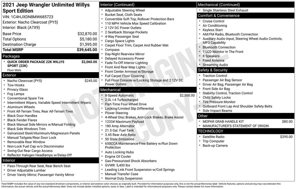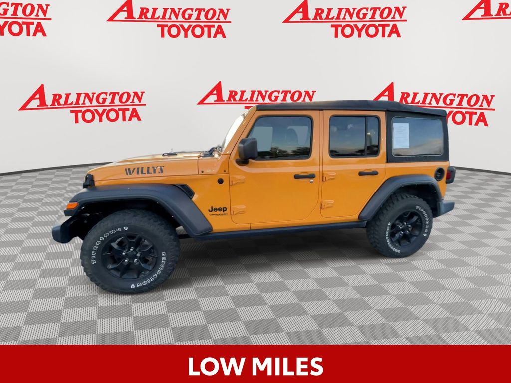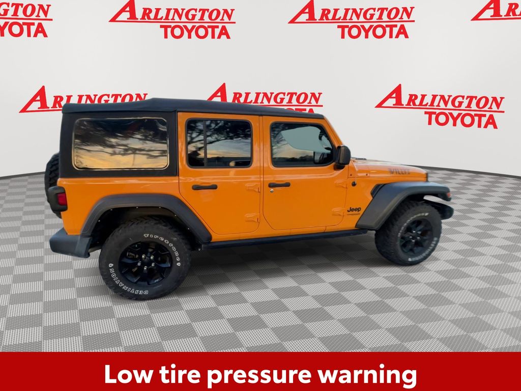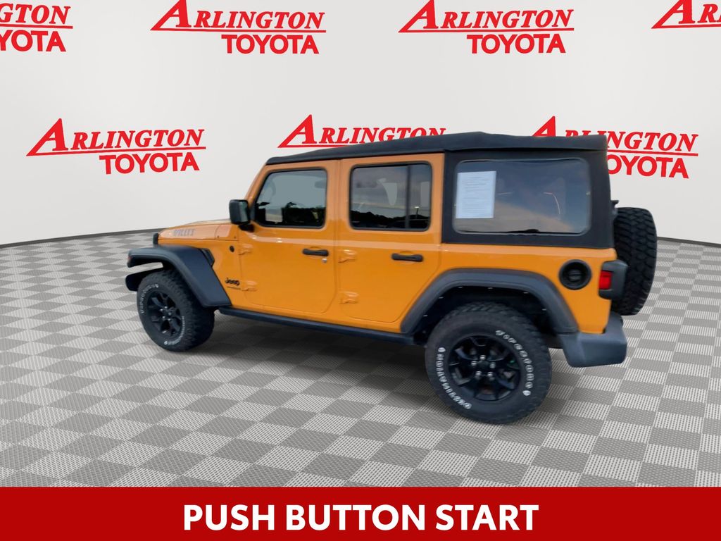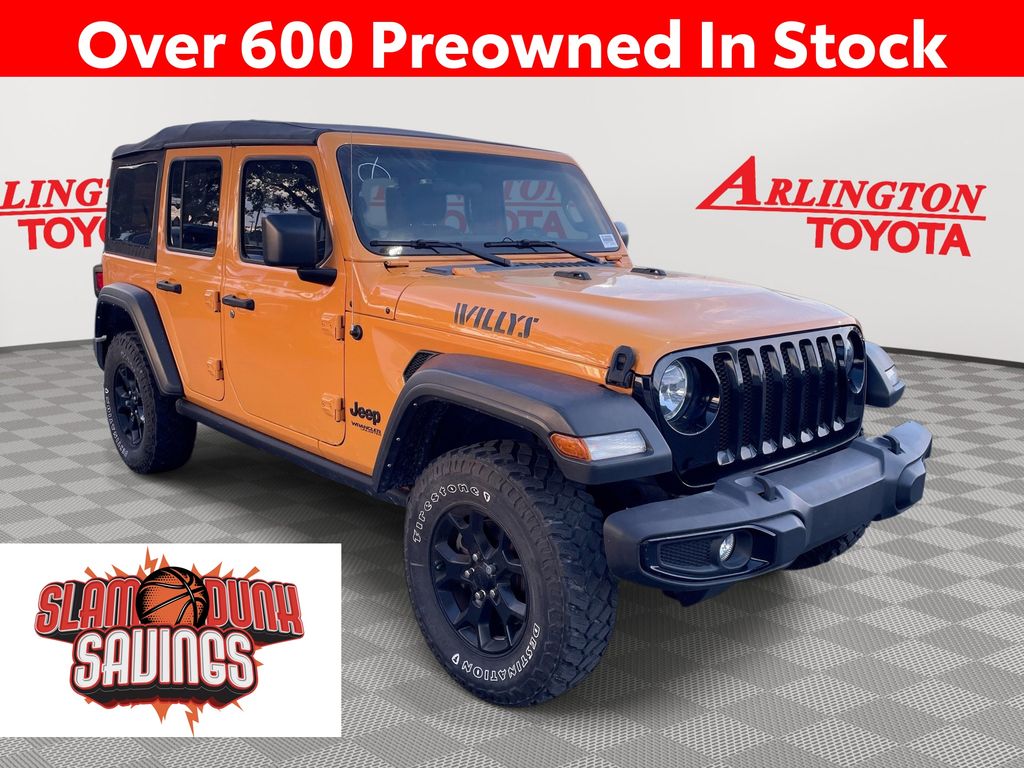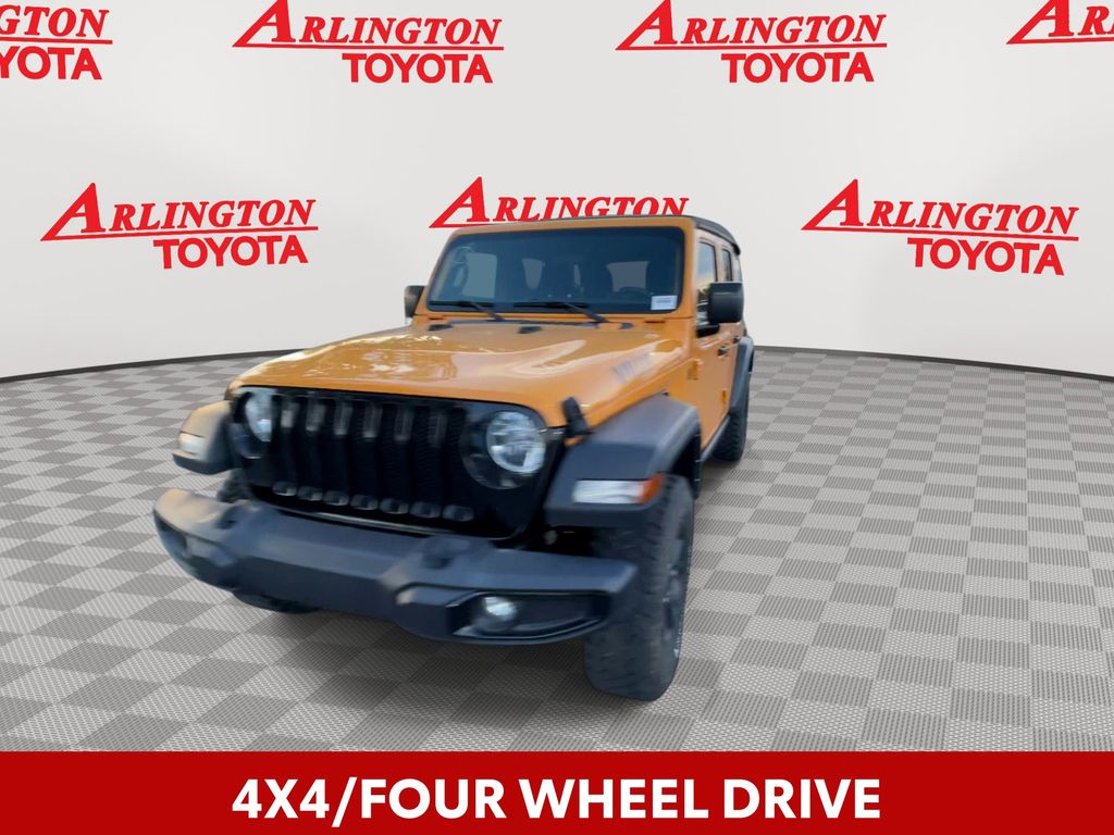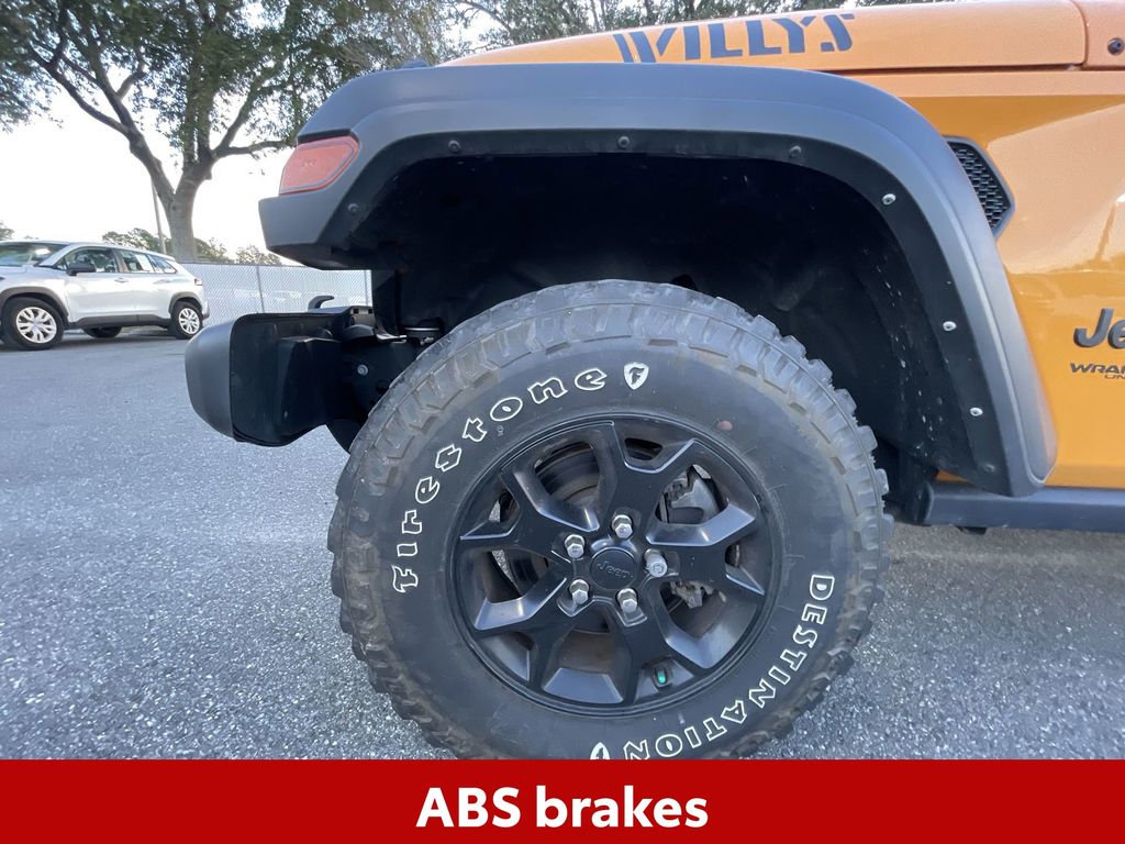 BACKUP CAMERA, BLUETOOTH HANDS FREE, 4X4/FOUR WHEEL DRIVE, LOW MILES, PUSH BUTTON START, CRUISE CONTROL, NON SMOKER, Wrangler Unlimited Willys 4x4, 4D Sport Utility, 2.0L I4 DOHC, 8-Speed Automatic, 4WD, Nacho Clearcoat, Black Cloth, ABS brakes, Electronic Stability Control, Low tire pressure warning, 3.45 Rear Axle Ratio, 4-Wheel Disc Brakes, 4-Wheel Drive Swing Gate Decal, 8 Speakers, Air Conditioning, AM/FM radio, Anti-Spin Differential Rear Axle, Aux Battery, Black Grille, Black Trail Rated Badge, Brake assist, Cloth Low-Back Bucket Seats, Compass, Deep Tint Sunscreen Windows, Delay-off headlights, Driver door bin, Driver vanity mirror, Dual front impact airbags, Dual front side impact airbags, For More Info, Call 800-643-2112, Front anti-roll bar, Front Bucket Seats, Front Center Armrest w/Storage, Front fog lights, Front reading lights, Integrated roll-over protection, Manufacturer's Statement of Origin, Matte Black Jeep Badge, Mold In Color Bumper w/Gloss Black, MOPAR All-Weather Floor Mats (DISC), MOPAR Grab Handle Kit, Non-Lock Fuel Cap w/o Discriminator, Normal Duty Suspension, Occupant sensing airbag, Outside temperature display, ParkView Rear Back-Up Camera, Passenger door bin, Passenger vanity mirror, Power steering, Quick Order Package 22K Willys Sport, Quick Order Package 23K Willys Sport, Radio data system, Radio: Uconnect 3 w/5" Display, Rear anti-roll bar, Rear reading lights, SiriusXM Radio Service, SiriusXM Satellite Radio, Speed control, Split folding rear seat, Steering wheel mounted audio controls, Stop-Start Dual Battery System, Tachometer, Telescoping steering wheel, Tilt steering wheel, Traction control, Trip computer, Variably intermittent wipers, Wheels: 17" x 7.5" Black Steel Styled, Wheels: 17" x 7.5" Moab Black Aluminum, Willys, Willys Hood Decal, Wrangler Decal, Wrangler Unlimited Willys 4x4, 4D Sport Utility, 2.0L I4 DOHC, 8-Speed Automatic, 4WD, Nacho Clearcoat, Black Cloth, ABS brakes, Electronic Stability Control, Low tire pressure warning.