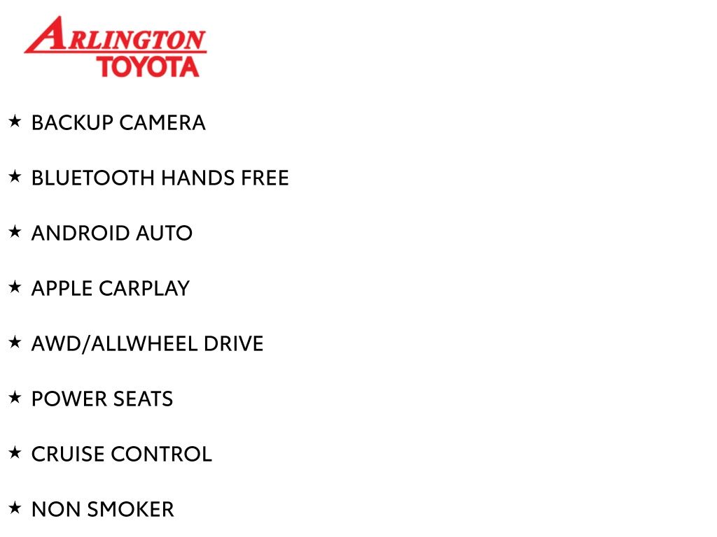 Prices do not include tax, tag, title, a pre-delivery service fee* of $894.00, an electronic registration filing fee* of $199.00 (*these charges represent costs and profits to the dealer for items such as inspecting, cleaning, and preparing documents related to the sale), and an Arlington Toyota Total Value Package of $1,889.00 (*these charges represent costs and profits to the dealer for items such as inspecting, cleaning, and preparing documents related to the sale). The final price is also subject to repair order reconditioning costs. Any price does not include dealer-installed accessories. All offers are mutually exclusive. All vehicles are subject to prior sale. See dealer for complete details.