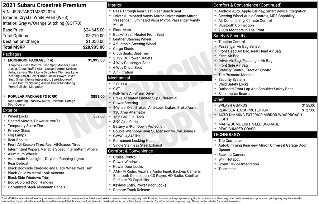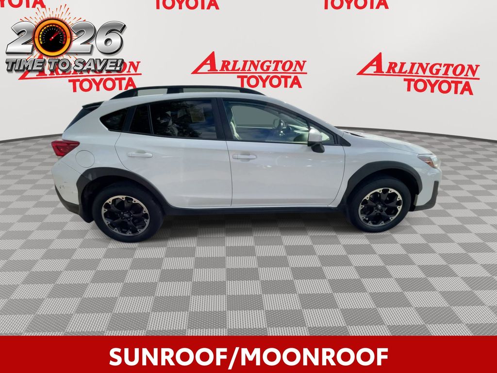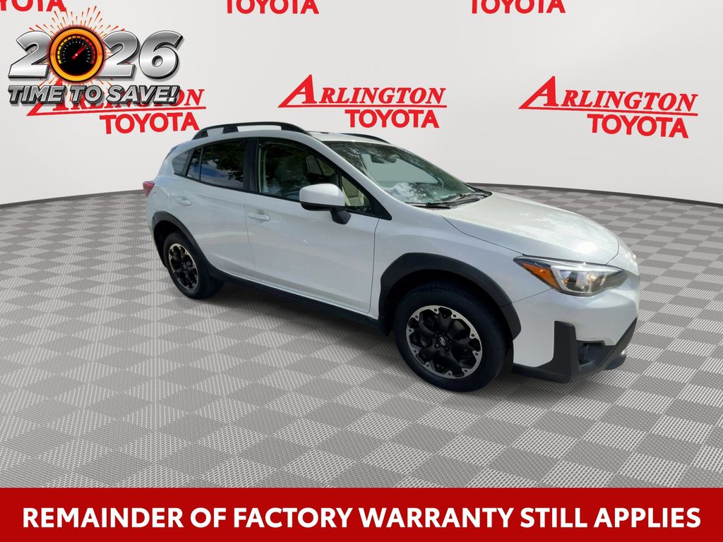 REMAINDER OF FACTORY WARRANTY STILL APPLIES, BACKUP CAMERA, BLUETOOTH HANDS FREE, ANDROID AUTO, APPLE CARPLAY, AWD/ALLWHEEL DRIVE, POWER SEATS, SUNROOF/MOONROOF, CRUISE CONTROL, NON SMOKER, Crosstrek Premium AWD, 4D Sport Utility, 2.0L DOHC, Lineartronic CVT, AWD, Crystal White Pearl, Gray W/Orange Stitching Cloth, ABS brakes, Electronic Stability Control, Four wheel independent suspension, Fully automatic headlights, Low tire pressure warning, Steering wheel mounted audio controls, 17" Alloy Wheels, 3.90 Axle Ratio, 4-Wheel Disc Brakes, 6 Speakers, 6-Way Power Driver's Seat, Air Conditioning, Alloy wheels, AM/FM radio: SiriusXM, Anti-whiplash front head restraints, Auto-Dimming Exterior Mirror w/Approach Light, Auto-Dimming Mirror w/Compass & HomeLink, Automatic temperature control, Blind Spot Detection (BSD), Brake assist, Bumpers: body-color, CD player, Cloth Upholstery, Driver door bin, Driver vanity mirror, Dual front impact airbags, Dual front side impact airbags, Exterior Parking Camera Rear, EyeSight System, Front anti-roll bar, Front Bucket Seats, Front Center Armrest, Front fog lights, Front reading lights, Heated door mirrors, Heated Front Bucket Seats, Heated front seats, Illuminated entry, Keyless Access w/Push-Button Start, Knee airbag, Leather Shift Knob, Map & Dome Lights LED Upgrade, Moonroof Package, Occupant sensing airbag, Outside temperature display, Overhead airbag, Overhead console, Panic alarm, Passenger door bin, Passenger vanity mirror, Popular Package #3, Power door mirrors, Power Moonroof, Power steering, Power windows, Radio data system, Radio: Subaru STARLINK 6.5" Multimedia Plus System, Rear anti-roll bar, Rear Bumper Cover, Rear Seatback Protector, Rear window defroster, Rear window wiper, Remote keyless entry, Security system, Speed control, Speed-sensing steering, Splash Guards, Split folding rear seat, Spoiler, STARLINK/Apple CarPlay/Android Auto, Subaru STARLINK Smartphone Integration, Tachometer, Telescoping steering wheel, Tilt steering wheel, Traction control, Trip computer, Variably intermittent wipers, Wheel Locks - Alloy, Crosstrek Premium AWD, 4D Sport Utility, 2.0L DOHC, Lineartronic CVT, AWD, Crystal White Pearl, Gray W/Orange Stitching Cloth, ABS brakes, Electronic Stability Control, Four wheel independent suspension, Fully automatic headlights, Low tire pressure warning, Steering wheel mounted audio controls.