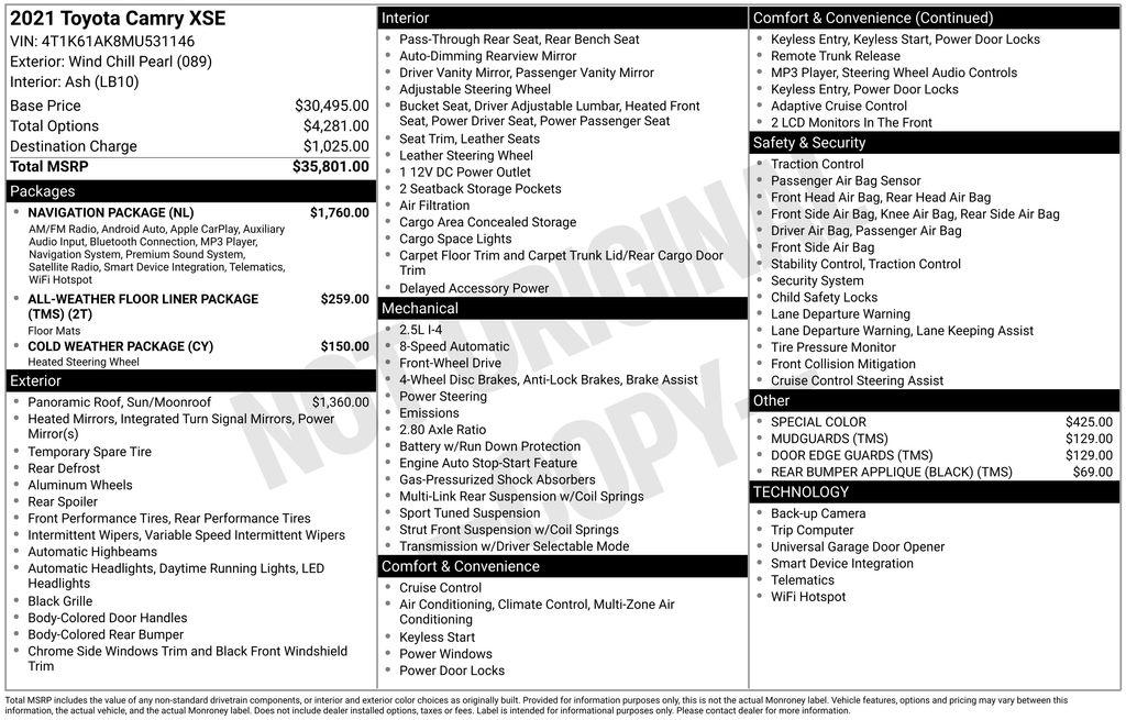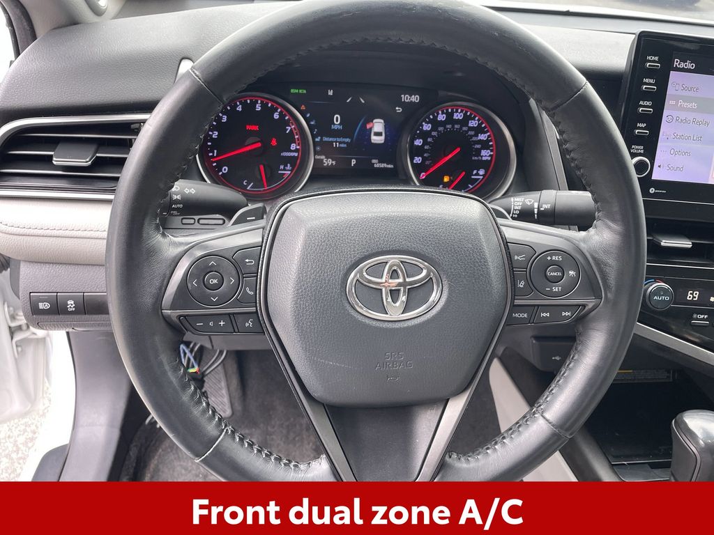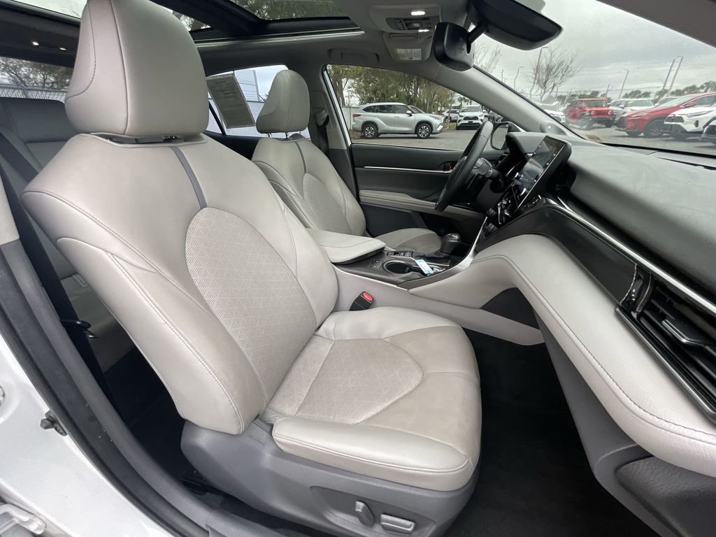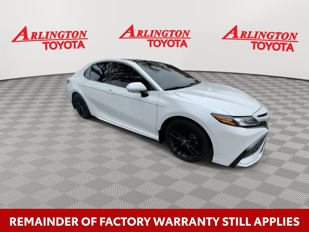 REMAINDER OF FACTORY WARRANTY STILL APPLIES, BACKUP CAMERA, BLUETOOTH HANDS FREE, ANDROID AUTO, APPLE CARPLAY, POWER SEATS, NAVIGATION SYSTEM, PANORAMIC MOONROOF, PUSH BUTTON START, LANE DEPARTURE, ADAPTIVE CRUISE CONTROL, NON SMOKER, Camry XSE, 4D Sedan, 2.5L I4 DOHC 16V, 8-Speed Automatic, FWD, Wind Chill Pearl, Ash w/Perforated Leather Seat Trim, ABS brakes, Electronic Stability Control, Four wheel independent suspension, Front dual zone A/C, Fully automatic headlights, Low tire pressure warning, Remote keyless entry, Steering wheel mounted audio controls, 4-Wheel Disc Brakes, 6 Speakers, Air Conditioning, All-Weather Floor Liner Package (TMS), Alloy wheels, AM/FM radio: SiriusXM, Apple CarPlay/Android Auto, Auto High-beam Headlights, Auto-dimming Rear-View mirror, Automatic temperature control, Brake assist, Bumpers: body-color, Cold Weather Package, Delay-off headlights, Door Edge Guards (TMS), Driver door bin, Driver vanity mirror, Dual front impact airbags, Dual front side impact airbags, Exterior Parking Camera Rear, Front anti-roll bar, Front Bucket Seats, Front Center Armrest, Front reading lights, Garage door transmitter: HomeLink, Heated door mirrors, Heated front seats, Heated Steering Wheel, Illuminated entry, Knee airbag, Mudguards (TMS), Multi-Stage Heated Front Bucket Seats, Navigation Package, Occupant sensing airbag, Outside temperature display, Overhead airbag, Overhead console, Panic alarm, Panoramic Glass Roof, Passenger door bin, Passenger vanity mirror, Perforated Leather Seat Trim, Power door mirrors, Power driver seat, Power passenger seat, Power steering, Power windows, Radio data system, Radio: AM/FM/HD Audio Plus, Radio: AM/FM/HD Premium Audio w/JBL w/Clari-Fi, Rear anti-roll bar, Rear Bumper Applique (Black) (TMS), Rear reading lights, Rear seat center armrest, Rear side impact airbag, Rear window defroster, Security system, Speed control, Speed-sensing steering, Split folding rear seat, Spoiler, Tachometer, Telescoping steering wheel, Tilt steering wheel, Traction control, Trip computer, Turn signal indicator mirrors, Variably intermittent wipers, Wheels: 8.0J x 19" Black Machined-Finish Alloy, Camry XSE, 4D Sedan, 2.5L I4 DOHC 16V, 8-Speed Automatic, FWD, Wind Chill Pearl, Ash w/Perforated Leather Seat Trim, ABS brakes, Electronic Stability Control, Four wheel independent suspension, Front dual zone A/C, Fully automatic headlights, Low tire pressure warning, Remote keyless entry, Steering wheel mounted audio controls.