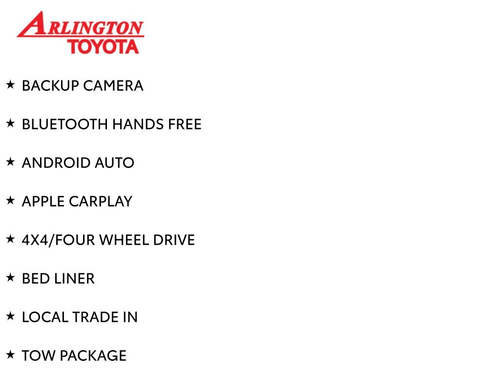 BACKUP CAMERA, BLUETOOTH HANDS FREE, ANDROID AUTO, APPLE CARPLAY, 4X4/FOUR WHEEL DRIVE, BED LINER, LOCAL TRADE IN, TOW PACKAGE, LANE DEPARTURE, ADAPTIVE CRUISE CONTROL, NON SMOKER, Tacoma TRD Sport 4X4, 4D Double Cab, 3.5L V6 PDI DOHC 24V LEV3-ULEV70 278hp, 6-Speed Automatic, 4WD, Magnetic Gray Metallic, Cement w/Fabric Seat Trim (FD), 120V/400W Deck Mounted AC Power, 6 Speakers, ABS brakes, Air Conditioning, Alloy wheels, AM/FM radio: SiriusXM, Anti-whiplash front head restraints, Apple CarPlay/Android Auto, Auto High-beam Headlights, Auto-dimming Rear-View mirror, Auto-Dimming Rearview Mirror w/HomeLink, Automatic temperature control, Axle Ratio: 3.91, Brake assist, Bumpers: body-color, Color-Keyed Rear Bumper, Driver door bin, Dual front impact airbags, Dual front side impact airbags, Electronic Stability Control, Emergency communication system: Safety Connect with 1-year trial, Engine Immobilizer, Exterior Parking Camera Rear, Fabric Seat Trim (FD), Front anti-roll bar, Front Bucket Seats, Front Center Armrest, Front dual zone A/C, Front fog lights, Front reading lights, Front Seats, Front wheel independent suspension, Heated door mirrors, Illuminated entry, Knee airbag, Leather Seat Trim, Leather Shift Knob, LED Daytime Running Lights & Fog Lights, Low tire pressure warning, Occupant sensing airbag, Outside temperature display, Overhead airbag, Overhead console, Panic alarm, Passenger door bin, Power Color Turn Mirror, Power door mirrors, Power driver seat, Power steering, Power windows, Radio: AM/FM Radio, Rear step bumper, Remote keyless entry, Security system, Smart Key w/Push Button Start, Speed control, Speed-sensing steering, Split folding rear seat, Steering wheel mounted audio controls, Tachometer, Telescoping steering wheel, Tilt steering wheel, Traction control, TRD Sport Package, Trip computer, Turn signal indicator mirrors, Variably intermittent wipers, Wheels: 17" x 7.5J Machined Alloy, Tacoma TRD Sport 4X4, 4D Double Cab, 3.5L V6 PDI DOHC 24V LEV3-ULEV70 278hp, 6-Speed Automatic, 4WD, Magnetic Gray Metallic, Cement w/Fabric Seat Trim (FD).
