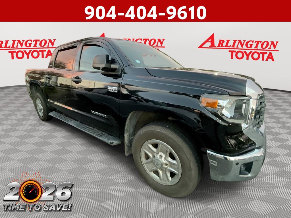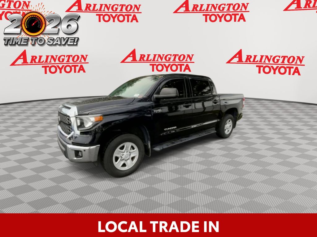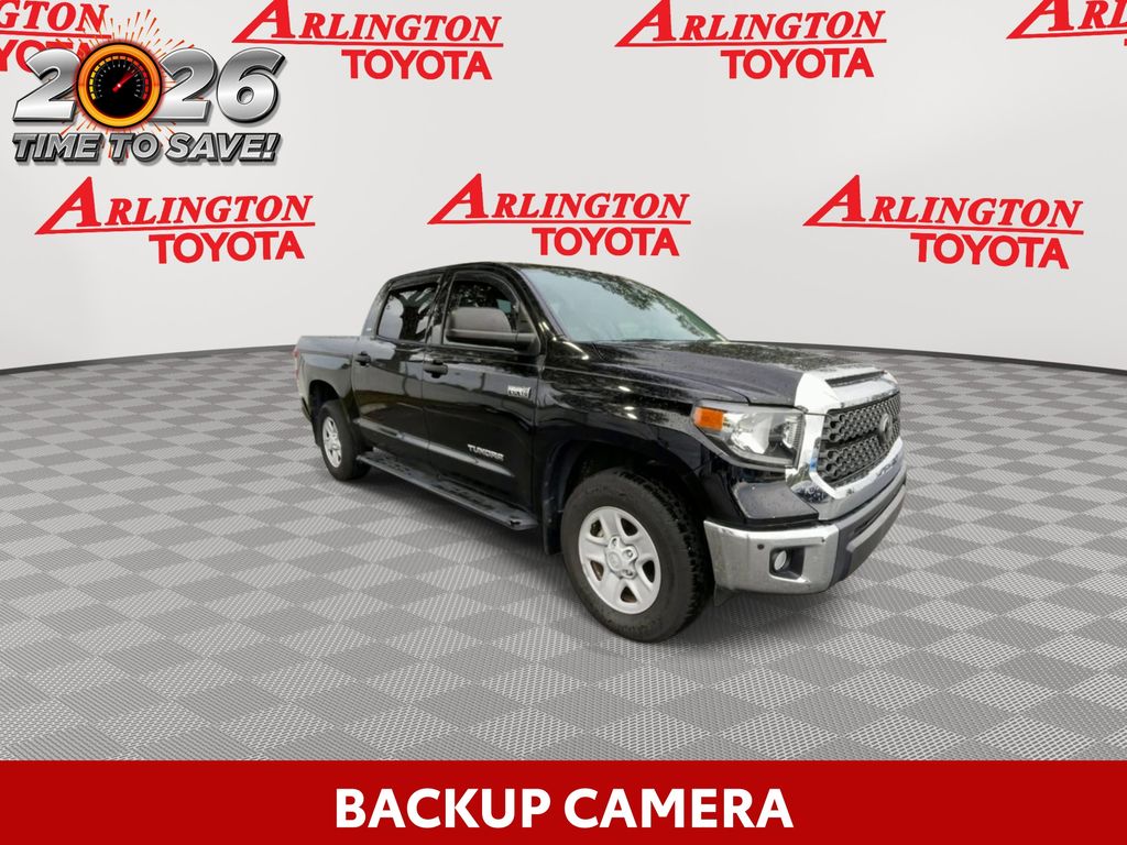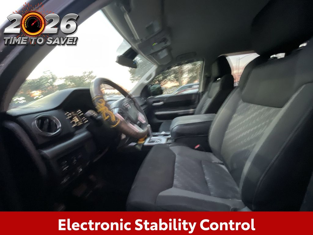 BACKUP CAMERA, BLUETOOTH HANDS FREE, LOCAL TRADE IN, RUNNING BOARDS, TOW PACKAGE, CRUISE CONTROL, NON SMOKER, Tundra SR5, 4D CrewMax, i-Force 5.7L V8 DOHC 32V LEV, 6-Speed Automatic Electronic with Overdrive, RWD, Midnight Black Metallic, Black w/Fabric Seat Trim or Fabric Seat Trim w/TRD Off Road/TRD Sport Packages, ABS brakes, Blind Spot Monitor w/Rear Cross Traffic Alert, Convenience Package, Electronic Stability Control, Front & Rear Clearance Backup Sonar, Fully automatic headlights, Low tire pressure warning, Steering wheel mounted audio controls, 18" x 8J Styled Steel Wheels, 3-Passenger Front Bench Seat, 4-Wheel Disc Brakes, 4.30 Axle Ratio, 9 Speakers, Air Conditioning, AM/FM radio: SiriusXM, Apple CarPlay/Android Auto, Auto High-beam Headlights, Auto-dimming Rear-View mirror, Brake assist, Compass, Delay-off headlights, Driver door bin, Driver vanity mirror, Dual front impact airbags, Dual front side impact airbags, Exterior Parking Camera Rear, Fabric Seat Trim, Front anti-roll bar, Front Center Armrest w/Storage, Front fog lights, Front reading lights, Front wheel independent suspension, Garage door transmitter: HomeLink, Heated door mirrors, Illuminated entry, Knee airbag, Occupant sensing airbag, Outside temperature display, Overhead airbag, Overhead console, Panic alarm, Passenger door bin, Passenger vanity mirror, Power door mirrors, Power steering, Power windows, Radio data system, Radio: Audio Plus AM/FM/HD Radio, Rear reading lights, Rear seat center armrest, Rear step bumper, Rear window defroster, Remote keyless entry, Safety Connect, SiriusXM Radio, Speed control, Speed-sensing steering, Split folding rear seat, Tachometer, Tilt steering wheel, Traction control, Trip computer, Variably intermittent wipers, Voltmeter, Tundra SR5, 4D CrewMax, i-Force 5.7L V8 DOHC 32V LEV, 6-Speed Automatic Electronic with Overdrive, RWD, Midnight Black Metallic, Black w/Fabric Seat Trim or Fabric Seat Trim w/TRD Off Road/TRD Sport Packages, ABS brakes, Blind Spot Monitor w/Rear Cross Traffic Alert, Convenience Package, Electronic Stability Control, Front & Rear Clearance Backup Sonar, Fully automatic headlights, Low tire pressure warning, Steering wheel mounted audio controls.