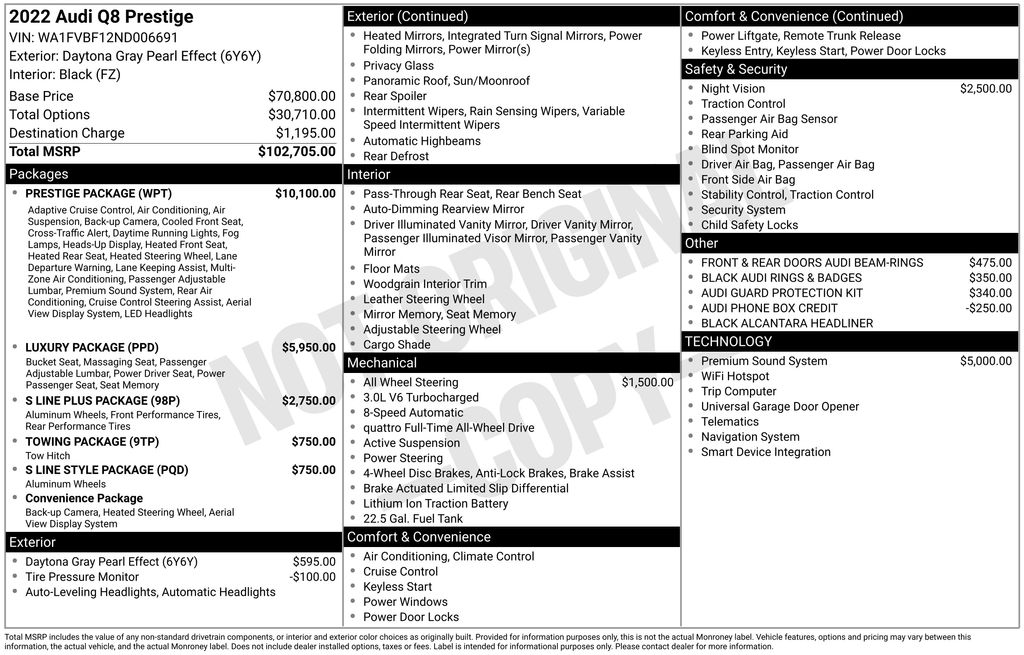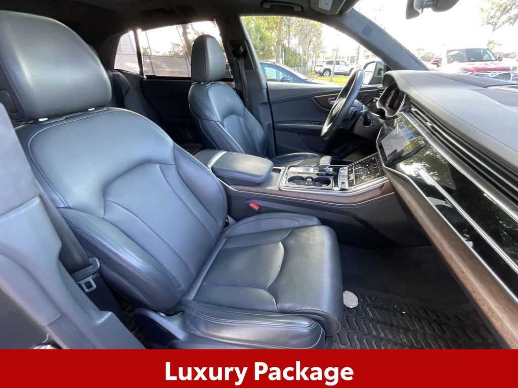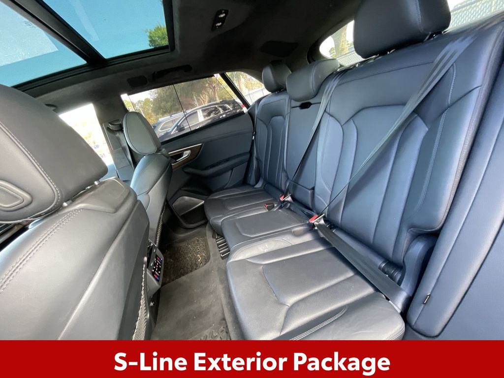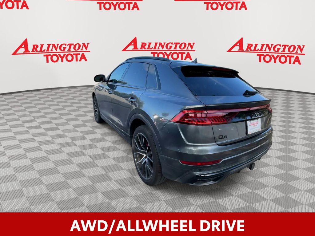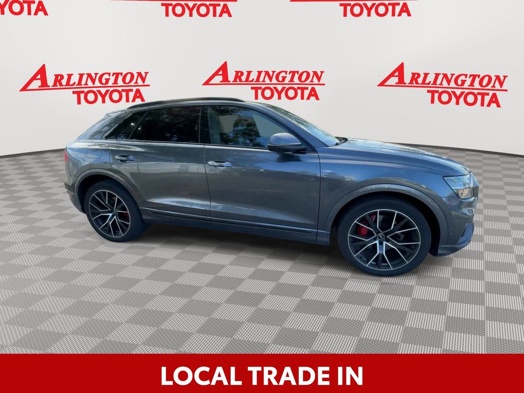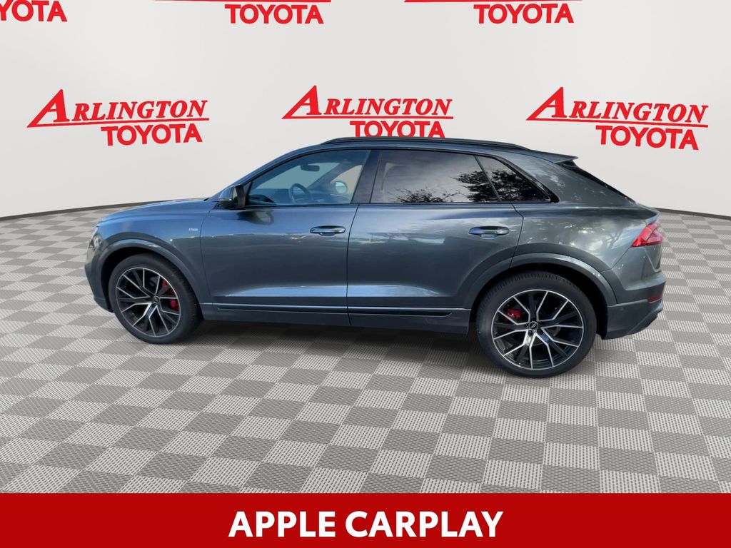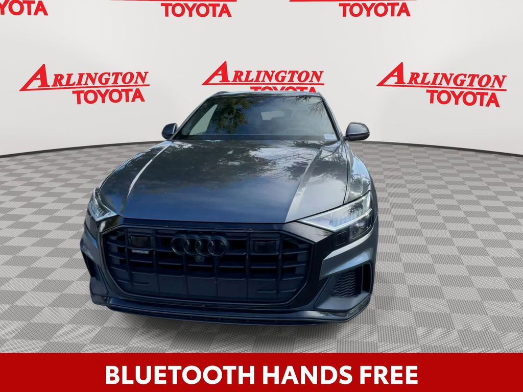 BACKUP CAMERA, BLUETOOTH HANDS FREE, ANDROID AUTO, APPLE CARPLAY, AWD/ALLWHEEL DRIVE, HEATED LEATHER SEATS, POWER SEATS, LOCAL TRADE IN, MEMORY SEATS, NAVIGATION SYSTEM, POWER LIFTGATE, SUNROOF/MOONROOF, PREMIUM SOUND, TURBOCHARGED, PUSH BUTTON START, CRUISE CONTROL, NON SMOKER, Q8 55 Prestige quattro, 4D Sport Utility, 3.0L V6 Turbocharged DOHC 24V LEV3-ULEV70 335hp, 8-Speed Automatic with Tiptronic, quattro, Daytona Gray Pearl, Black Leather, 4-Zone Climate Control, Adaptive Cruise Assist w/Lane Guidance, Armrests Leather Package, Audi Phone Box w/Wireless Charging, Bang & Olufsen 3D Premium Sound System, Comfort Adaptive Air Suspension, Contour/Ambient LED Interior Lighting Package, Convenience Package, Driver & Passenger Front Seats w/Ventilation, Dual Pane Acoustic Glass, Electric Sun Blinds for Rear Side Windows, Executive Package, Extended Leather Package, Front dual zone A/C, HD Matrix-Design LED Headlights, Head-Up Display, Headlight Washers, Heated Rear Seats, Heated Steering Wheel, Illuminated Door Sills, Individual Contour Front Seats, Intersection Assist, LED DRL & Taillights, Light Alcantara Headliner, Luxury Package, Power Soft-Closing Doors, Prestige Package, Red Painted Brake Calipers, S Line Fender Badges, S Line Front & Rear Bumpers, S Line Illuminated Door Sills, S Line Plus Package, S Line Side Sills, S Line Style Package, S-Line Exterior Package, Steering wheel memory, Steering wheel mounted audio controls, Sunshades for Rear Doors, Top View Camera System, Traffic Sign Recognition, Upper Dashboard in Leather w/Contrast Stitching, Valcona Leather Seat Trim, Wheels: 21" Bi-Color 5-W-Spoke-Design, Wheels: 22" Audi Sport 5-V-Spoke-Star-Design, 10 Speakers, 21" 5-Segment-Spoke-Design Wheels, 4-Wheel Disc Brakes, ABS brakes, Adaptive suspension, Air Conditioning, All-Wheel Steering, Alloy wheels, AM/FM radio: SiriusXM, Audi Guard Protection Kit, Audi Phone Box Credit, Audi smartphone interface (Apple CarPlay/Android Auto), Auto High-beam Headlights, Auto-dimming door mirrors, Auto-dimming Rear-View mirror, Automatic temperature control, Axle Ratio: TBD, Bang & Olufsen 3D Advanced Sound System, Black Alcantara Headliner, Black Audi Rings & Badges, Black Front & Rear Bumpers, Black Roof Rails & Mask, Brake assist, Bumpers: body-color, Compass, Delay-off headlights, Direct TPMS Credit (DISC), Driver door bin, Driver vanity mirror, Dual front impact airbags, Dual front side impact airbags, Electronic Stability Control, Emergency communication system: Audi connect CARE, PRIME & PLUS, Exterior Parking Camera Rear, Four wheel independent suspension, Front & Rear Doors Audi Beam-Rings, Front anti-roll bar, Front Bucket Seats, Front Center Armrest, Front fog lights, Front reading lights, Fully automatic headlights, Garage door transmitter: HomeLink, Genuine wood door panel insert, Heated door mirrors, Heated Front Bucket Seats, Heated front seats, Illuminated entry, Lava Brown Eucalyptus Natural Wood Inlays, Leather Seating Surfaces, Leather Shift Knob, Leather steering wheel, Low tire pressure warning, Memory seat, Navigation system: Audi MMI Navigation plus with Touch Response, Night Vision Assistant, Occupant sensing airbag, Outside temperature display, Overhead airbag, Overhead console, Panic alarm, Passenger door bin, Passenger vanity mirror, Power door mirrors, Power driver seat, Power Liftgate, Power moonroof: Panoramic, Power passenger seat, Power steering, Power windows, Radio data system, Radio: MMI Nav Plus w/MMI Touch Response, Rain sensing wipers, Rear air conditioning, Rear anti-roll bar, Rear fog lights, Rear reading lights, Rear seat center armrest, Rear side impact airbag, Rear window defroster, Rear window wiper, Remote keyless entry, Roof rack: rails only, Security system, Speed control, Speed-sensing steering, Split folding rear seat, Spoiler, Tachometer, Telescoping steering wheel, Tilt steering wheel, Tow Hitch Receiver, Towing 7 Pin Connector, Towing Package, Traction control, Trip computer, Turn