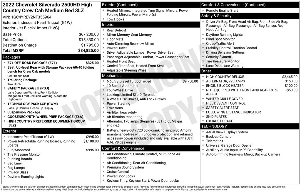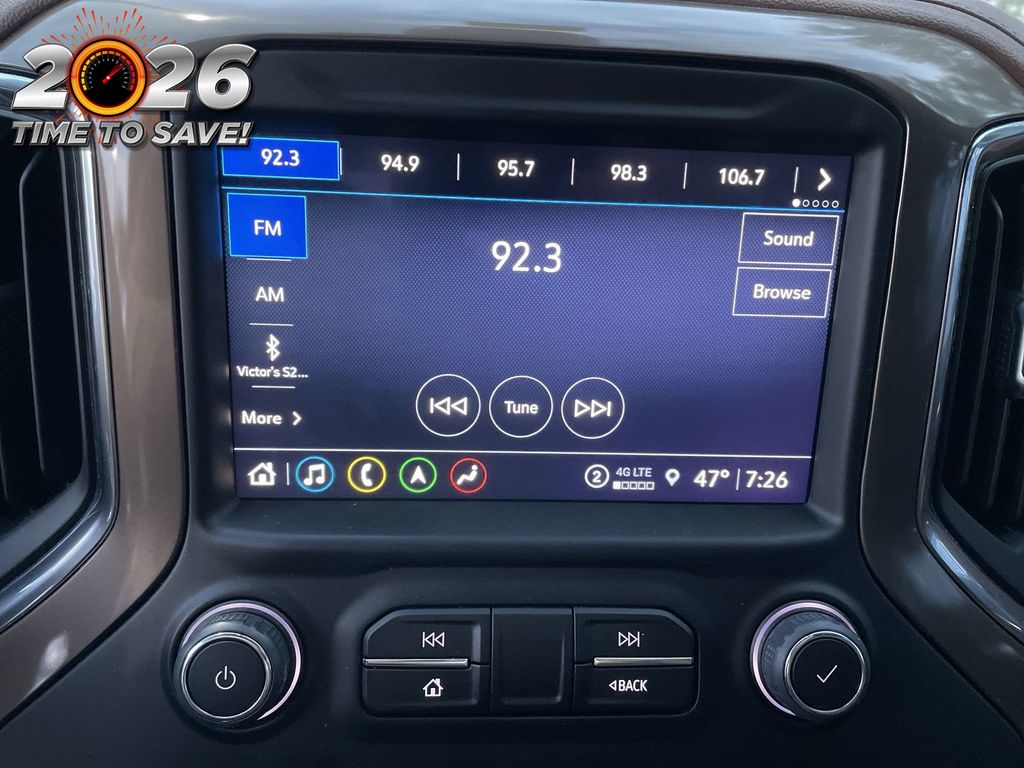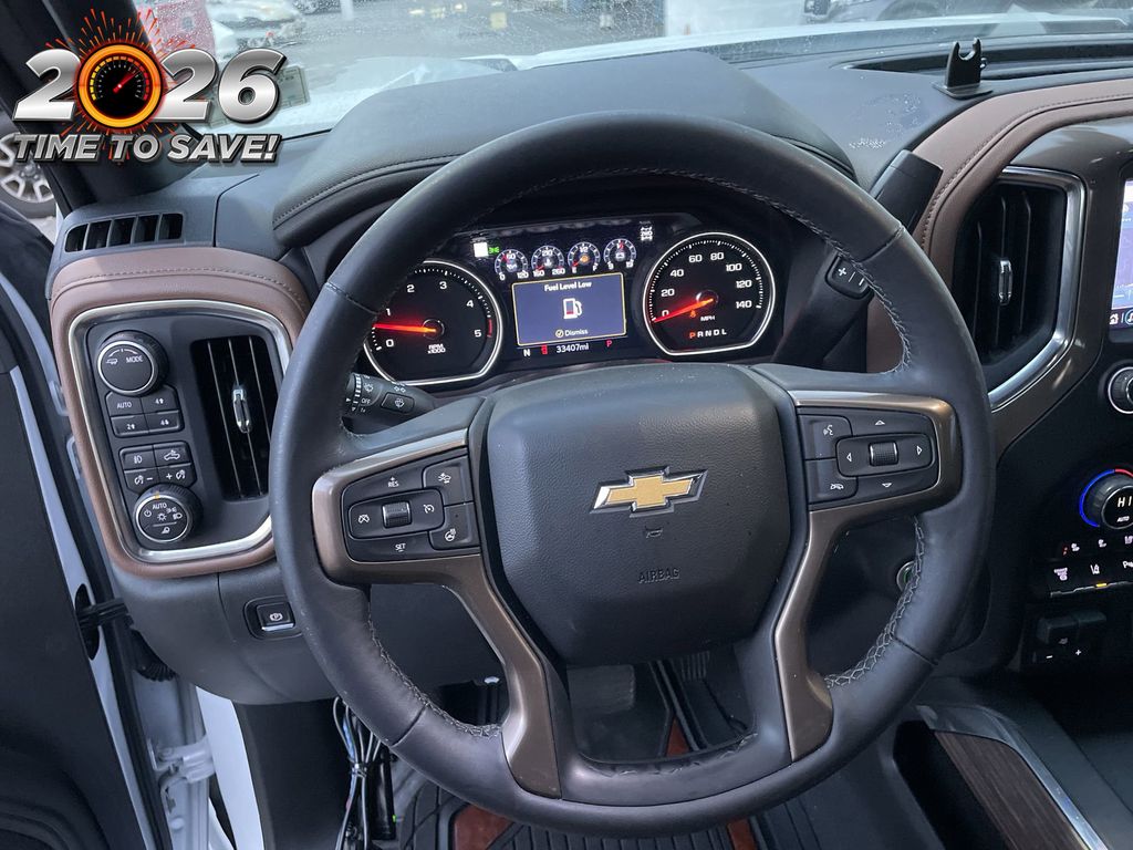 10-Way Power Driver Seat Adjuster w/Lumbar, 10-Way Power Passenger Seat Adjuster w/Lumbar, 12-Volt Rear Auxiliary Power Outlet, 120-Volt Bed Mounted Power Outlet, 120-Volt Instrument Panel Power Outlet, 15" Diagonal Multicolor Head-Up Display, 170 Amp Alternator, 220 Amp Alternator, 4-Wheel Disc Brakes, 6" Rectangular Chromed Tubular Assist Steps, 7 Speakers, 720 Cold-Cranking Amps Heavy-Duty Battery, 8" Driver Information Center, ABS brakes, Advanced Trailering System, Air Conditioning, Alloy wheels, AM/FM radio: SiriusXM with 360L, Auto-dimming door mirrors, Auto-Dimming Inside Rear-View Mirror, Auto-dimming Rear-View mirror, Automatic Emergency Braking, Automatic temperature control, Bed View Camera w/2 Trailer Camera Provisions, Black Chevytec Spray-On Bedliner w/Chevrolet Logo, Bluetooth® For Phone, BOSE Premium 7-Speaker Sound System, Brake assist, Bumpers: body-color, Chevrolet Connected Access Capable, Chrome Front Grille, Chrome Mirror Caps, Color-Keyed Carpeting Floor Covering, Compass, Deep-Tinted Glass, Delay-off headlights, Driver door bin, Driver Memory, Driver vanity mirror, Dual Charge-Only USB Ports (2nd Row), Dual front impact airbags, Dual front side impact airbags, Electric Rear-Window Defogger, Electrical Lock Control Steering Column, Electronic Cruise Control w/Set & Resume Speed, Electronic Stability Control, Engine Block Heater, Exhaust Brake, Exterior Parking Camera Rear, Floor-Mounted Center Console, Following Distance Indicator, Forward Collision Alert, Front anti-roll bar, Front Bucket Seats, Front Carpeted Floor Mats, Front Center Armrest, Front Chrome Recovery Hooks, Front dual zone A/C, Front fog lights, Front LED Fog Lamps, Front reading lights, Front wheel independent suspension, Fully automatic headlights, Garage door transmitter, Gooseneck/5th Wheel Prep Package, HD Surround Vision w/2 Trailer View Camera Provisions, Heated & Auto-Dim Pwr Vertical Trailering Mirrors, Heated 2nd Row Outboard Seats, Heated door mirrors, Heated Driver & Front Outboard Passenger Seating, Heated front seats, Heated Steering Wheel, Heated steering wheel, High Country Deluxe, Hill Descent Control, Hitch Guidance w/Hitch View, Illuminated entry, Integrated Trailer Brake Controller, IntelliBeam Automatic High Beam On/Off, Keyless Open & Start, Lane Change Alert w/Side Blind Zone Alert, Lane Departure Warning System, Leather-Wrapped Steering Wheel, LED Cargo Area Lighting, Low tire pressure warning, Manual Tilt & Telescoping Steering Column, Memory seat, Navigation System, Not Equipped w/Front & Rear Park Assist, Occupant sensing airbag, OnStar & Chevrolet Connected Services Capable, Outside temperature display, Overhead airbag, Overhead console, Panic alarm, Passenger door bin, Passenger vanity mirror, Perforated Leather-Appointed Seat Trim, Polished Exhaust Tip, Power Door Locks, Power door mirrors, Power driver seat, Power Front Windows w/Driver Express Up/Down, Power Front Windows w/Passenger Express Up/Down, Power passenger seat, Power Rear Windows w/Express Down, Power Sliding Rear Window w/Defogger, Power steering, Power Sunroof, Power windows, Power-Retractable Assist Steps, Preferred Equipment Group 3LZ, Premium audio system: Chevrolet Infotainment 3 Premium, Radio: Chevrolet Infotainment 3 Premium System, Rear Camera Mirror, Rear Carpeted Floor Mats, Rear Cross Traffic Alert, Rear reading lights, Rear seat center armrest, Rear step bumper, Rear Wheelhouse Liners, Rear window defroster, Remote keyless entry, Remote Vehicle Starter System, Safety Alert Seat, Safety Package II, Security system, SiriusXM w/360L, Speed control, Speed-sensing steering, Split folding rear seat, Standard Tailgate, Steering Wheel Audio Controls, Steering wheel mounted audio controls, Suspension Package, Tachometer, Technology Package, Telescoping steering wheel, Tilt steering wheel, Traction control, Trip computer, Turn signal indicator mirrors, Ultrasonic Front