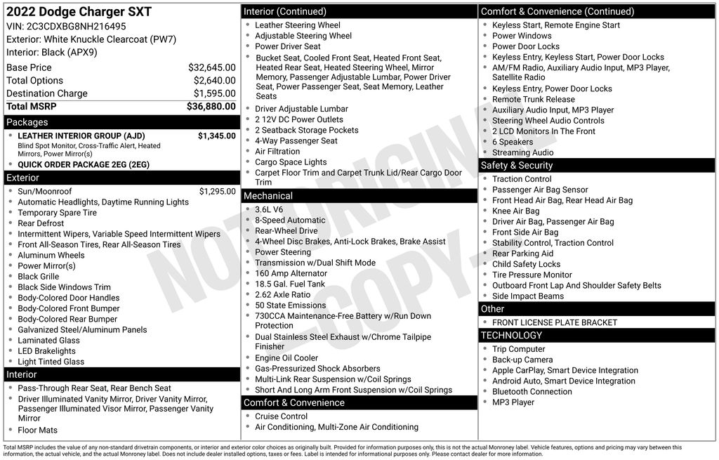 BACKUP CAMERA, BLUETOOTH HANDS FREE, ANDROID AUTO, APPLE CARPLAY, POWER SEATS, PUSH BUTTON START, CRUISE CONTROL, NON SMOKER, Charger SXT, 4D Sedan, 3.6L V6 SMPI DOHC 24V LEV II 292hp, 8-Speed Automatic, RWD, White Knuckle Clearcoat, Black Leather, ABS brakes, Electronic Stability Control, Four wheel independent suspension, Front dual zone A/C, Fully automatic headlights, Low tire pressure warning, Steering wheel mounted audio controls, 4-Wheel Disc Brakes, 6 Speakers, Air Conditioning, Alloy wheels, AM/FM radio: SiriusXM, Anti-whiplash front head restraints, Apple CarPlay, Apple CarPlay/Android Auto, Body Color Exterior Mirrors, Brake assist, Bumpers: body-color, Cloth Sport Seat, Compass, Delay-off headlights, Driver door bin, Driver vanity mirror, Dual front impact airbags, Dual front side impact airbags, Front anti-roll bar, Front Bucket Seats, Front Center Armrest, Front License Plate Bracket, Front reading lights, Google Android Auto, GPS Antenna Input, Illuminated entry, Integrated Center Stack Radio, Integrated Voice Command w/Bluetooth, Knee airbag, Leather Shift Knob, Media Hub (2 USB, AUX), Occupant sensing airbag, Outside temperature display, Overhead airbag, Overhead console, Panic alarm, ParkView Rear Back-Up Camera, Passenger door bin, Passenger vanity mirror, Power 2-Way Driver Lumbar Adjust, Power 8-Way Driver Seat, Power door mirrors, Power driver seat, Power steering, Power Sunroof, Power windows, Quick Order Package 2EG, Radio: Uconnect 4 w/7" Display, Rear anti-roll bar, Rear Armrest w/Cupholder Seat, Rear reading lights, Rear seat center armrest, Rear window defroster, Remote keyless entry, Speed control, Speed-Sensitive Wipers, Split folding rear seat, Tachometer, Telescoping steering wheel, Tilt steering wheel, Traction control, Trip computer, USB Host Flip, Variably intermittent wipers, Wheels: 17" x 7" Painted Cast Aluminum, Charger SXT, 4D Sedan, 3.6L V6 SMPI DOHC 24V LEV II 292hp, 8-Speed Automatic, RWD, White Knuckle Clearcoat, Black Leather, ABS brakes, Electronic Stability Control, Four wheel independent suspension, Front dual zone A/C, Fully automatic headlights, Low tire pressure warning, Steering wheel mounted audio controls.