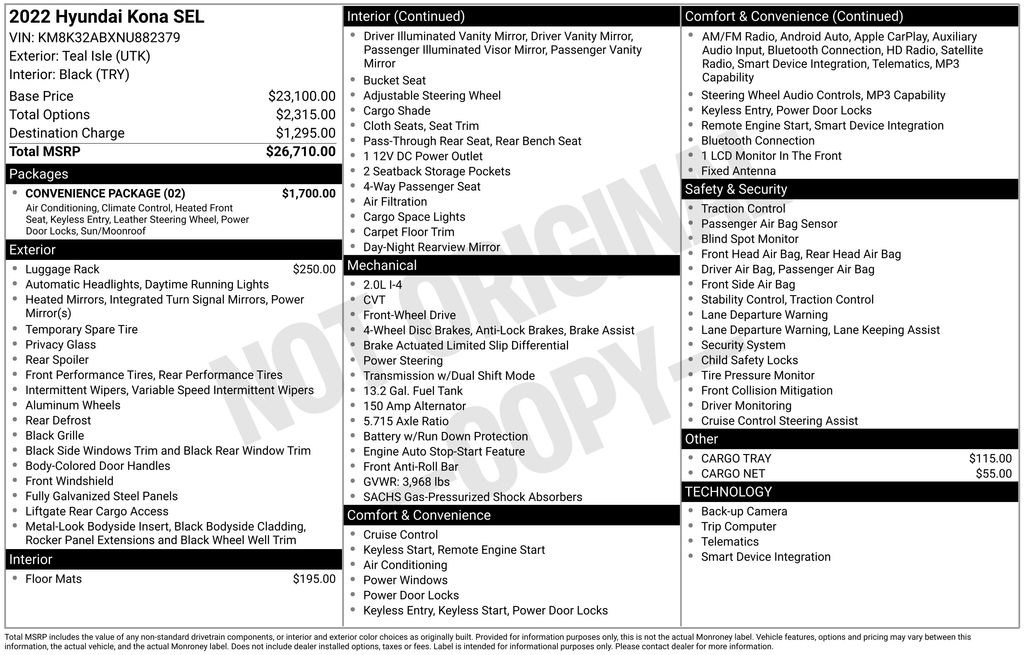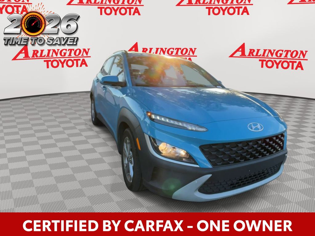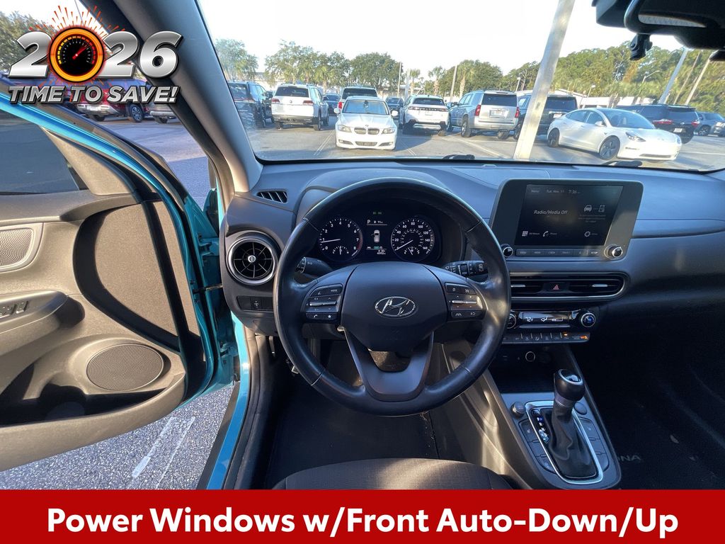 CERTIFIED BY CARFAX - ONE OWNER, REMAINDER OF FACTORY WARRANTY STILL APPLIES, BACKUP CAMERA, BLUETOOTH HANDS FREE, ANDROID AUTO, APPLE CARPLAY, LOCAL TRADE IN, CRUISE CONTROL, NON SMOKER, Kona SEL CONVENIENCE, 4D Sport Utility, 2.0L I4 MPI DOHC 16V LEV3-ULEV70 147hp, CVT, FWD, Teal Isle, Black Cloth, Automatic Temperature Control, Convenience Package, Electronic Stability Control, Fully automatic headlights, Heated Front Seats, Hidden Cargo-Area Storage Compartment, Leather-Wrapped Shift Knob, Leather-Wrapped Steering Wheel, NFC Digital Key, Option Group 02, Power Tilt-and-Slide Sunroof, Power Windows w/Front Auto-Down/Up, Premium Dark Grey Body Cladding, Wireless Device Charging, 4-Wheel Disc Brakes, 5.715 Axle Ratio, 6 Speakers, ABS brakes, Air Conditioning, Alloy wheels, AM/FM radio: SiriusXM, Apple CarPlay & Android Auto, Brake assist, Bumpers: body-color, Cargo Net, Cargo Tray, Carpeted Floor Mats, Cloth Seat Trim, Delay-off headlights, Driver door bin, Driver vanity mirror, Dual front impact airbags, Dual front side impact airbags, Emergency communication system: Blue Link Connected Car Service (3-year complimentary subscription), Exterior Parking Camera Rear, Front anti-roll bar, Front Bucket Seats, Front Center Armrest, Front reading lights, Front wheel independent suspension, Heated door mirrors, Illuminated entry, Low tire pressure warning, Occupant sensing airbag, Overhead airbag, Overhead console, Panic alarm, Passenger door bin, Passenger vanity mirror, Power door mirrors, Power steering, Power windows, Radio: AM/FM/HD Radio/SiriusXM Audio System, Rear seat center armrest, Rear window defroster, Rear window wiper, Remote keyless entry, Roof Rack Cross Rails, Security system, Speed control, Speed-sensing steering, Split folding rear seat, Spoiler, Steering wheel mounted audio controls, Tachometer, Telescoping steering wheel, Tilt steering wheel, Traction control, Trip computer, Turn signal indicator mirrors, Variably intermittent wipers, Wheels: 17 x 7.0J Alloy, Kona SEL CONVENIENCE, 4D Sport Utility, 2.0L I4 MPI DOHC 16V LEV3-ULEV70 147hp, CVT, FWD, Teal Isle, Black Cloth, Automatic Temperature Control, Convenience Package, Electronic Stability Control, Fully automatic headlights, Heated Front Seats, Hidden Cargo-Area Storage Compartment, Leather-Wrapped Shift Knob, Leather-Wrapped Steering Wheel, NFC Digital Key, Option Group 02, Power Tilt-and-Slide Sunroof, Power Windows w/Front Auto-Down/Up, Premium Dark Grey Body Cladding, Wireless Device Charging.