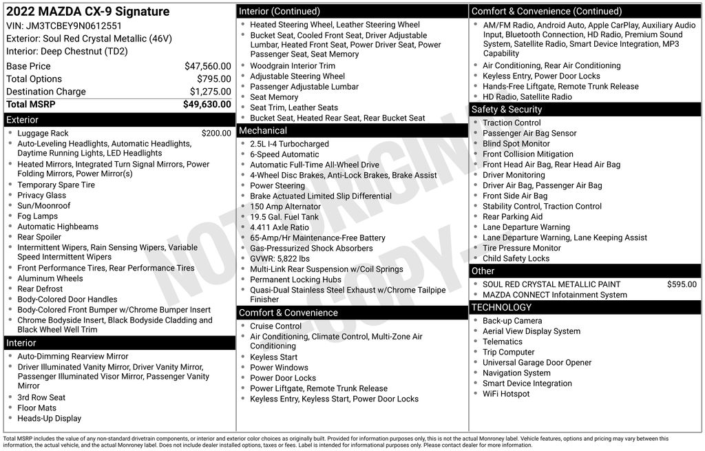 CERTIFIED BY CARFAX - ONE OWNER, BACKUP CAMERA, BLUETOOTH HANDS FREE, ANDROID AUTO, APPLE CARPLAY, POWER SEATS, MEMORY SEATS, POWER LIFTGATE, SUNROOF/MOONROOF, PUSH BUTTON START, CRUISE CONTROL, NON SMOKER, CX-9 Signature AWD, 4D Sport Utility, 2.5L 4-Cylinder, 6-Speed Automatic, AWD, Soul Red Crystal Metallic, Deep Chestnut Leather, ABS brakes, Electronic Stability Control, Four wheel independent suspension, Front dual zone A/C, Fully automatic headlights, Low tire pressure warning, Remote keyless entry, Steering wheel mounted audio controls, Turn signal indicator mirrors, 12 Speakers, 3rd row seats: bench, 4-Wheel Disc Brakes, 4.411 Axle Ratio, Air Conditioning, Alloy wheels, AM/FM radio: SiriusXM, AppLink/Apple CarPlay and Android Auto, Auto High-beam Headlights, Auto-dimming Rear-View mirror, Automatic temperature control, Brake assist, Bumpers: body-color, Compass, Delay-off headlights, Driver door bin, Driver vanity mirror, Dual front impact airbags, Dual front side impact airbags, E911 Automatic Emergency Notification, Front anti-roll bar, Front Bucket Seats, Front Center Armrest, Front fog lights, Front reading lights, Garage door transmitter: HomeLink, Genuine wood door panel insert, Heads-Up Display, Heated door mirrors, Heated front seats, Heated rear seats, Heated steering wheel, Heated/Ventilated Front Bucket Seats, Illuminated entry, Infotainment System Voice Command, Leather Shift Knob, Leather steering wheel, Mazda Connected Services, Mazda Navigation System, Memory seat, Nappa Leather Seat Trim, Navigation System, Occupant sensing airbag, Outside temperature display, Overhead airbag, Overhead console, Pandora Internet Radio Integration, Panic alarm, Passenger door bin, Passenger vanity mirror, Power door mirrors, Power driver seat, Power Liftgate, Power moonroof, Power passenger seat, Power steering, Power windows, Radio Broadcast Data System Program Information, Radio data system, Radio: AM/FM Sound System w/Bose Audio, Rain sensing wipers, Rear air conditioning, Rear anti-roll bar, Rear reading lights, Rear seat center armrest, Rear window defroster, Rear window wiper, Roof Rack & Cross Bars, Roof rack: rails only, SiriusXM Satellite Radio, SMS Text Msg Audio Delivery & Reply, Soul Red Crystal Metallic Paint, Speed control, Speed-sensing steering, Split folding rear seat, Spoiler, Tachometer, Telescoping steering wheel, Tilt steering wheel, Traction control, Trip computer, Variably intermittent wipers, Ventilated front seats, Wheels: 20" x 8.5J Aluminum Alloy, CX-9 Signature AWD, 4D Sport Utility, 2.5L 4-Cylinder, 6-Speed Automatic, AWD, Soul Red Crystal Metallic, Deep Chestnut Leather, ABS brakes, Electronic Stability Control, Four wheel independent suspension, Front dual zone A/C, Fully automatic headlights, Low tire pressure warning, Remote keyless entry, Steering wheel mounted audio controls, Turn signal indicator mirrors.