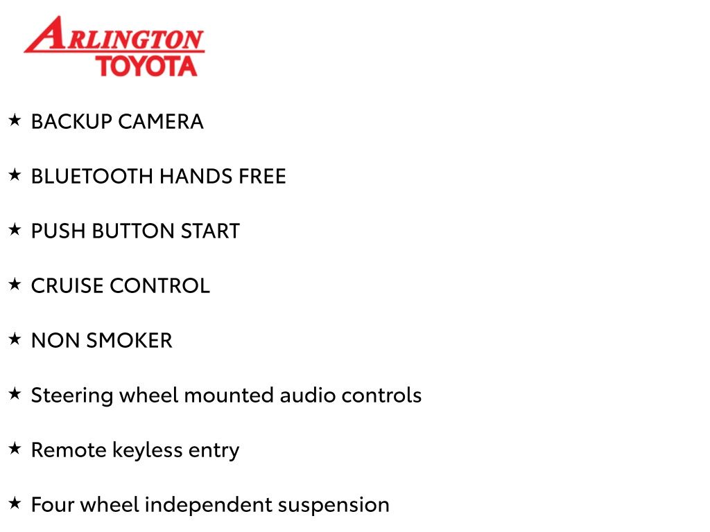 Prices do not include tax, tag, title, a pre-delivery service fee* of $894.00, an electronic registration filing fee* of $199.00 (*these charges represent costs and profits to the dealer for items such as inspecting, cleaning, and preparing documents related to the sale), and an Arlington Toyota Total Value Package of $1,889.00 (*these charges represent costs and profits to the dealer for items such as inspecting, cleaning, and preparing documents related to the sale). The final price is also subject to repair order reconditioning costs. Any price does not include dealer-installed accessories. All offers are mutually exclusive. All vehicles are subject to prior sale. See dealer for complete details.