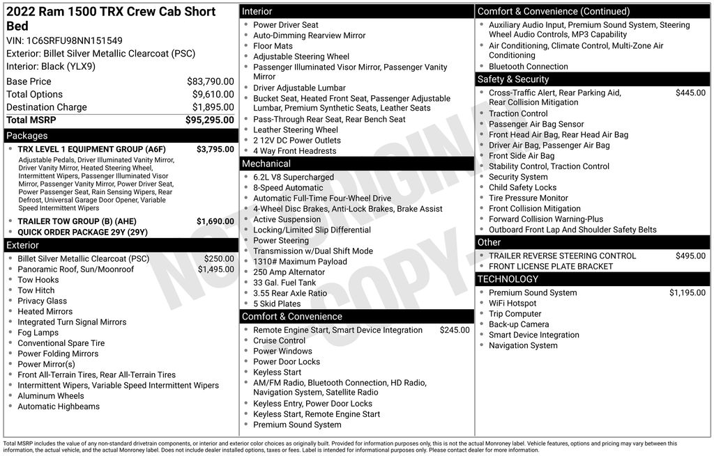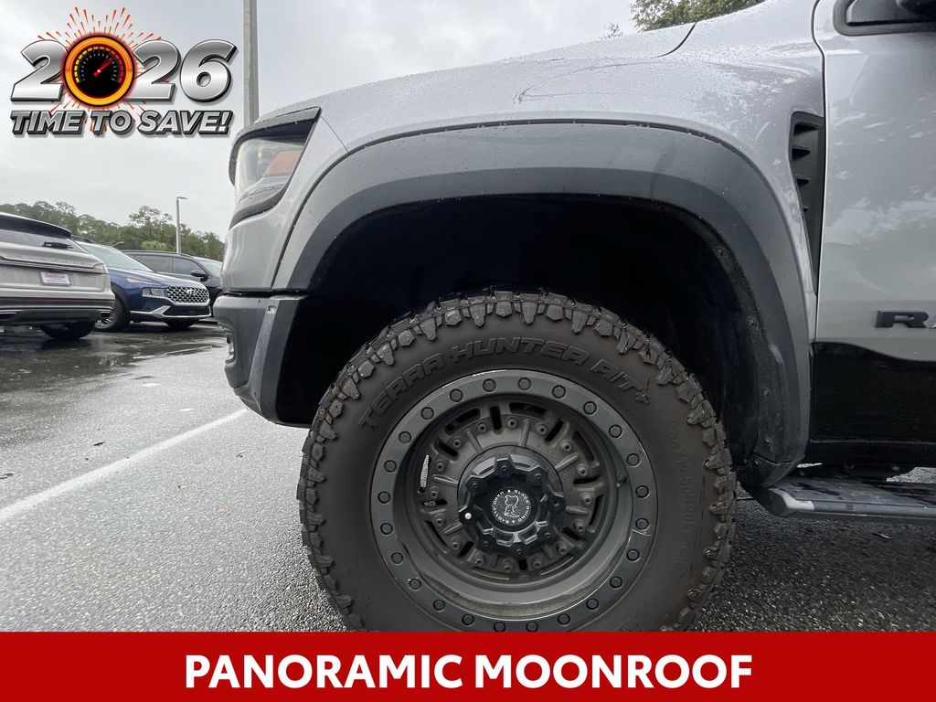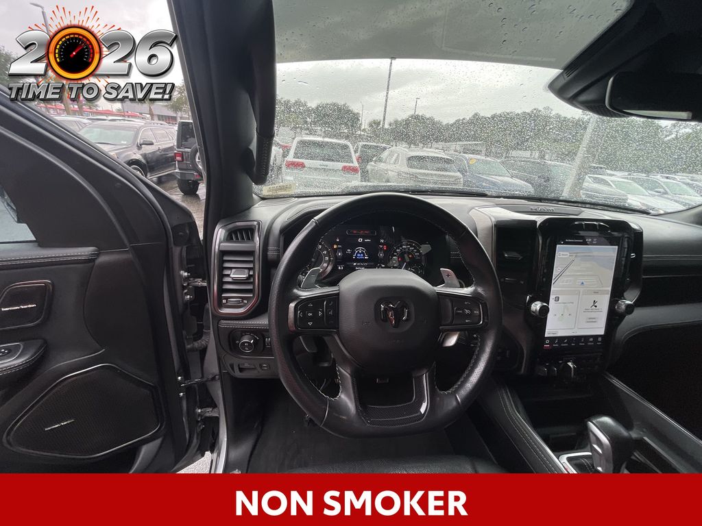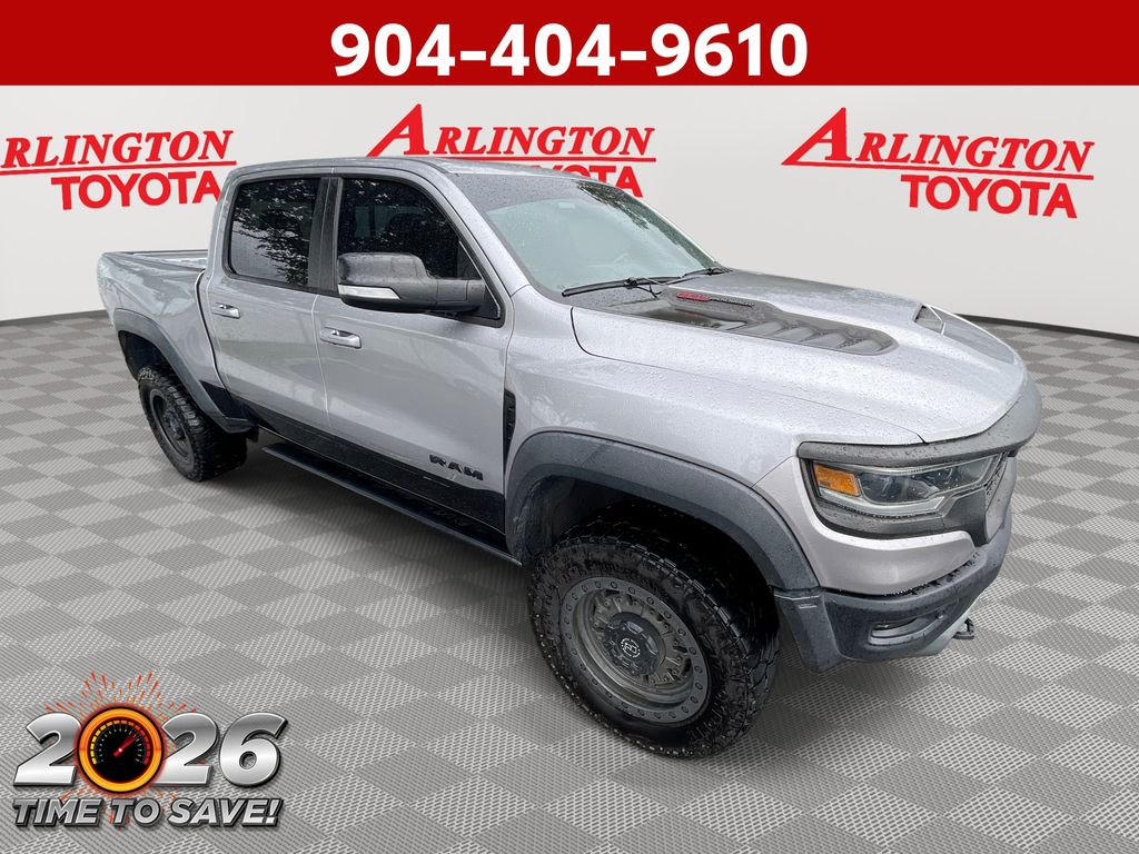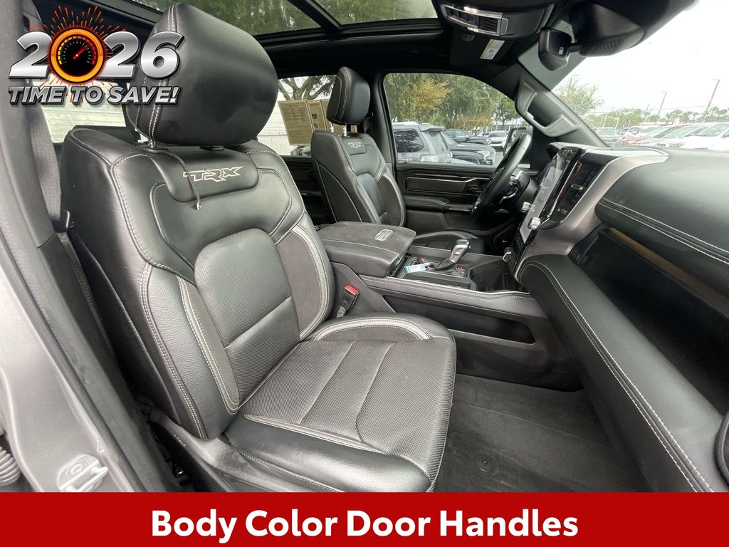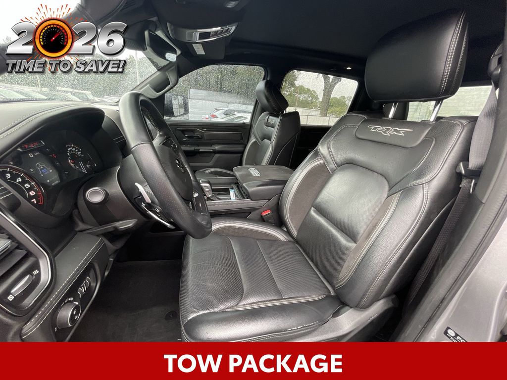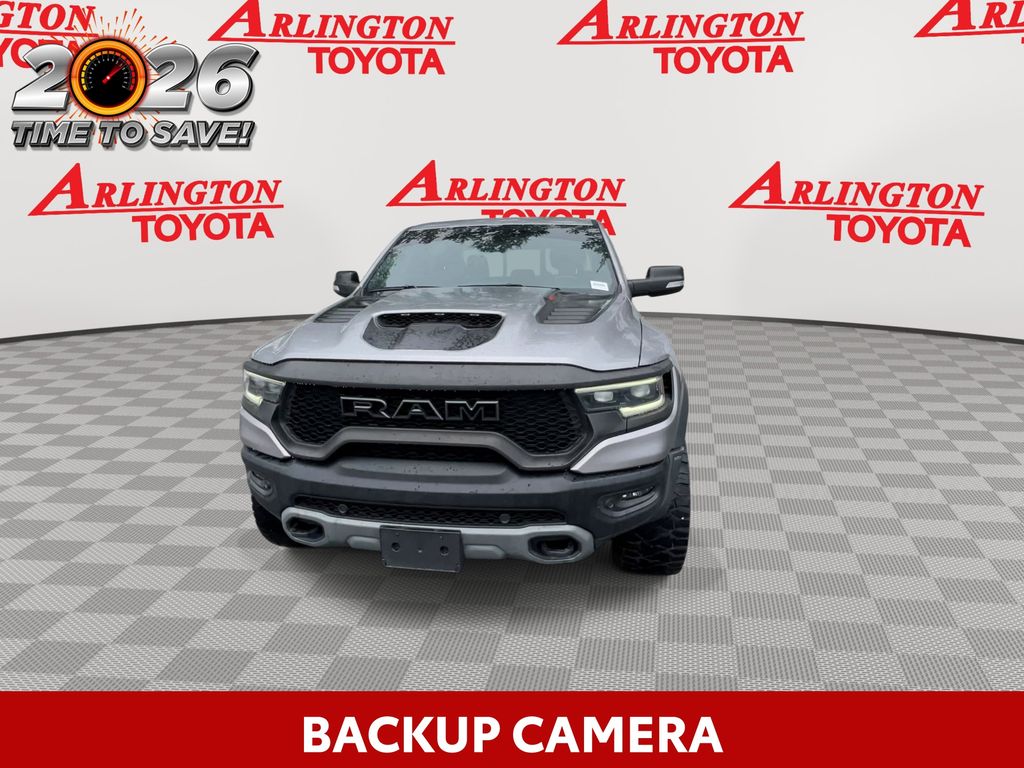 REMAINDER OF FACTORY WARRANTY STILL APPLIES, BACKUP CAMERA, BLUETOOTH HANDS FREE, ANDROID AUTO, APPLE CARPLAY, 4X4/FOUR WHEEL DRIVE, POWER SEATS, NAVIGATION SYSTEM, PANORAMIC MOONROOF, TOW PACKAGE, PUSH BUTTON START, CRUISE CONTROL, NON SMOKER, 1500 TRX 4X4, 4D Crew Cab, 6.2L Supercharged HEMI V8 SRT, 8-Speed Automatic, 4WD, Billet Silver Metallic Clearcoat, Black Leather, #2 Seat Foam Cushion, 4 Way Front Headrests, ABS brakes, Body Color Door Handles, Bucket Seats, Center Console Parts Module, Driver/Passenger Wrapped Assist Handles, Electronic Stability Control, Front Door Accent Lighting, Front dual zone A/C, Front Seat Back Map Pockets, Full Length Premium Upgraded Floor Console, Fully automatic headlights, Heated Front Seats, Heated Steering Wheel, IP LED Ambient Light Pipe, Leather Trimmed Bucket Seats, Low tire pressure warning, Luxury Front Door Trim Panel, MOPAR Bright Pedal Kit, Pick-Up Box Lighting, Power 4-Way Driver Lumbar Adjust, Power 4-Way Passenger Lumbar Adjust, Power 8-Way Driver & Passenger Seats, Power Adjustable Pedals, Premium Wrapped IP Bezel, Rain Sensitive Windshield Wipers, Rear 60/40 Folding Seat, Rear Door Accent Lighting, Rear Underseat Compartment Storage, Rear Window Defroster, Sun Visors w/Illuminated Vanity Mirrors, TRX Level 1 Equipment Group, Turn signal indicator mirrors, Universal Garage Door Opener, 10 Speakers, 3.55 Rear Axle Ratio, 4-Wheel Disc Brakes, Adaptive suspension, Air Conditioning, Alloy wheels, AM/FM radio: SiriusXM with 360L, Apple CarPlay/Android Auto, Auto High-beam Headlights, Auto-dimming door mirrors, Auto-dimming Rear-View mirror, Automatic temperature control, Black Exterior Mirrors, Brake assist, Cloth/Vinyl Bucket Seats, Compass, Delay-off headlights, Dome Dual LED Reading Lamp, Driver door bin, Dual front impact airbags, Dual front side impact airbags, Dual-Pane Panoramic Sunroof, Exterior Mirrors Courtesy Lamps, Exterior Mirrors w/Heating Element, Exterior Mirrors w/Supplemental Signals, Front anti-roll bar, Front Bucket Seats, Front Center Armrest w/Storage, Front fog lights, Front License Plate Bracket, Front reading lights, Front wheel independent suspension, harman/kardon 19 Speaker Premium Sound, Heated door mirrors, Illuminated entry, Leather Shift Knob, Leather steering wheel, Navigation System, Occupant sensing airbag, Outside temperature display, Overhead airbag, Overhead console, Panic alarm, ParkSense Front/Rear Park Assist w/Stop, ParkView Rear Back-Up Camera, Passenger door bin, Passenger vanity mirror, Power door mirrors, Power driver seat, Power steering, Power windows, Power-Folding Mirrors, Quick Order Package 29Y, Radio data system, Radio: Uconnect 5 Nav w/12.0" Display, Rear seat center armrest, Rear step bumper, Remote keyless entry, Security system, Speed control, Split folding rear seat, Sport steering wheel, Steering wheel mounted audio controls, Tachometer, Telescoping steering wheel, Tilt steering wheel, Traction control, Trailer Brake Control, Trailer Light Check, Trailer Reverse Steering Control, Trailer Tow Group (B) (DISC), Trip computer, Variably intermittent wipers, Voltmeter, Wheels: 18" x 9" Black Paint/Polish Aluminum, 1500 TRX 4X4, 4D Crew Cab, 6.2L Supercharged HEMI V8 SRT, 8-Speed Automatic, 4WD, Billet Silver Metallic Clearcoat, Black Leather, #2 Seat Foam Cushion, 4 Way Front Headrests, ABS brakes, Body Color Door Handles, Bucket Seats, Center Console Parts Module, Driver/Passenger Wrapped Assist Handles, Electronic Stability Control, Front Door Accent Lighting, Front dual zone A/C, Front Seat Back Map Pockets, Full Length Premium Upgraded Floor Console, Fully automatic headlights, Heated Front Seats, Heated Steering Wheel, IP LED Ambient Light Pipe, Leather Trimmed Bucket Seats, Low tire pressure warning, Luxury Front Door Trim Panel, MOPAR Bright Pedal Kit, Pick-Up Box Lighting, Power 4-Way Driver Lumbar Adjust, Power 4-Way Passenger Lumbar Adjust, Power 8-Way Driver &