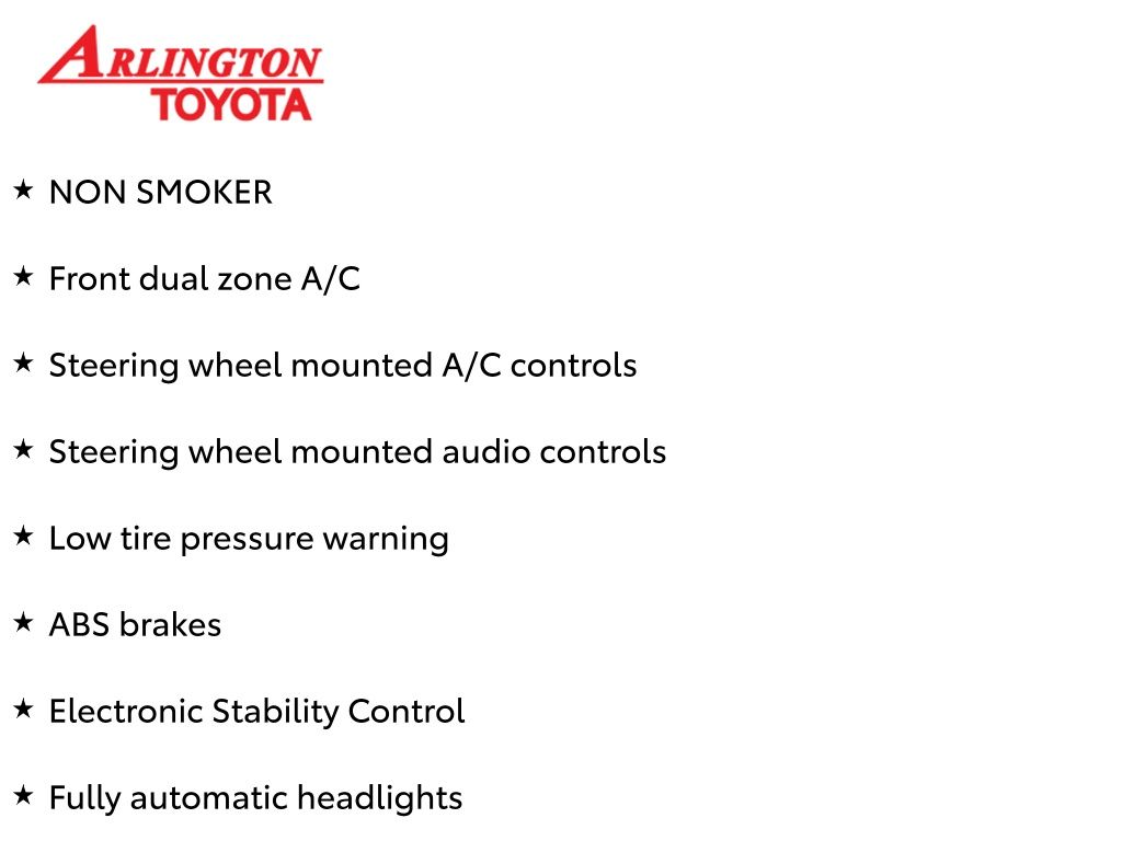 Prices do not include tax, tag, title, a pre-delivery service fee* of $894.00, an electronic registration filing fee* of $199.00 (*these charges represent costs and profits to the dealer for items such as inspecting, cleaning, and preparing documents related to the sale), and an Arlington Toyota Total Value Package of $1,889.00 (*these charges represent costs and profits to the dealer for items such as inspecting, cleaning, and preparing documents related to the sale). The final price is also subject to repair order reconditioning costs. Any price does not include dealer-installed accessories. All offers are mutually exclusive. All vehicles are subject to prior sale. See dealer for complete details.