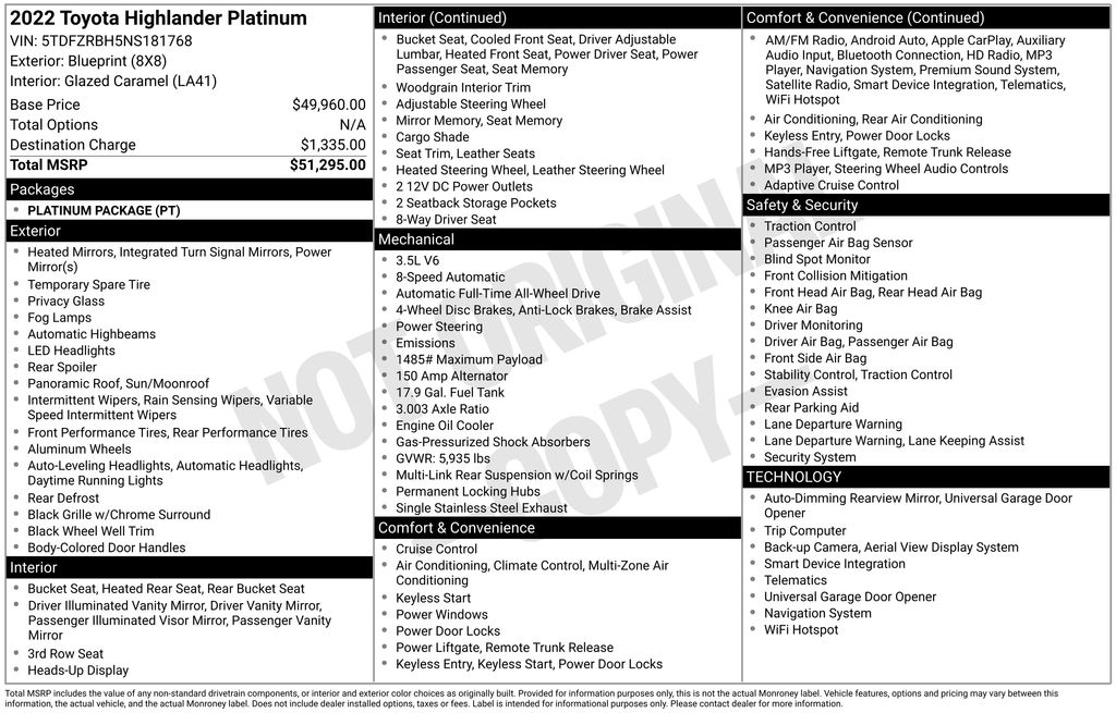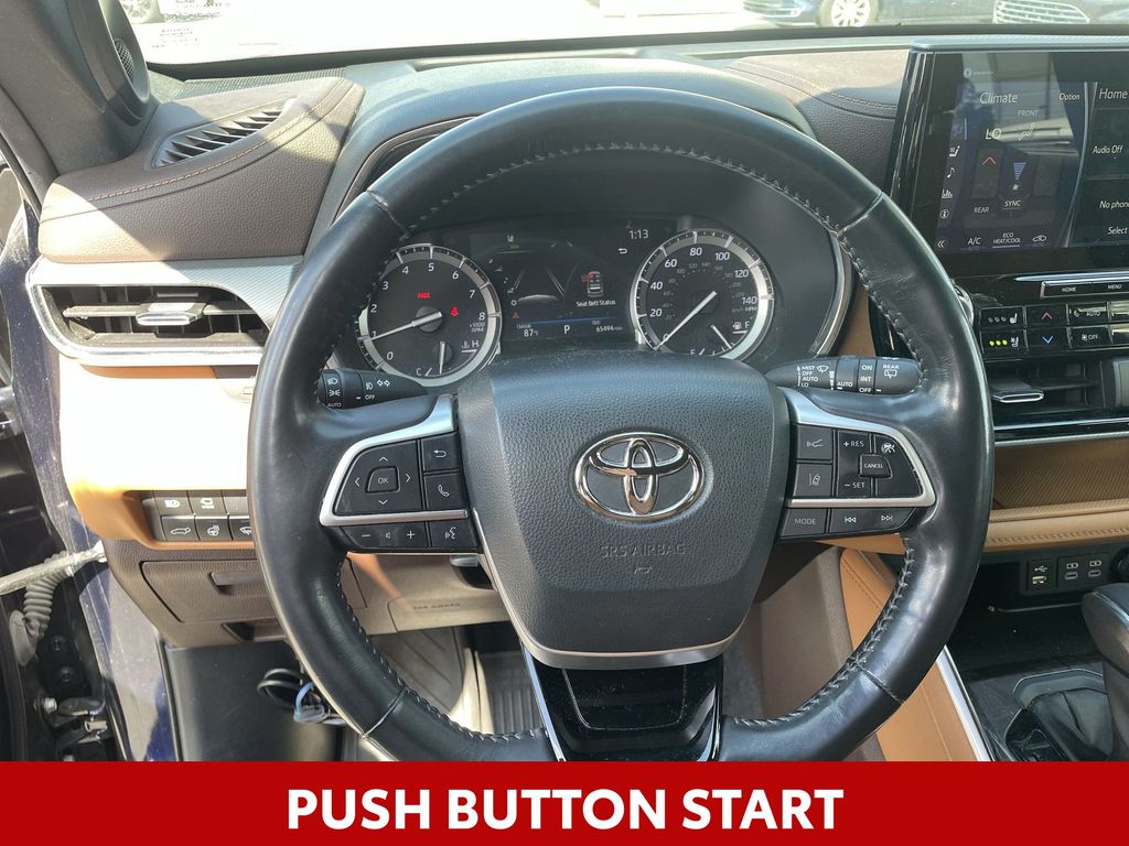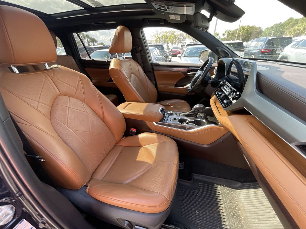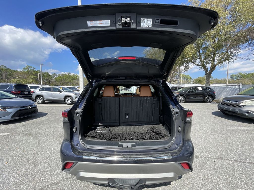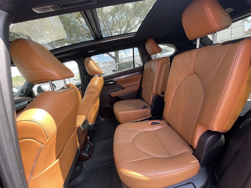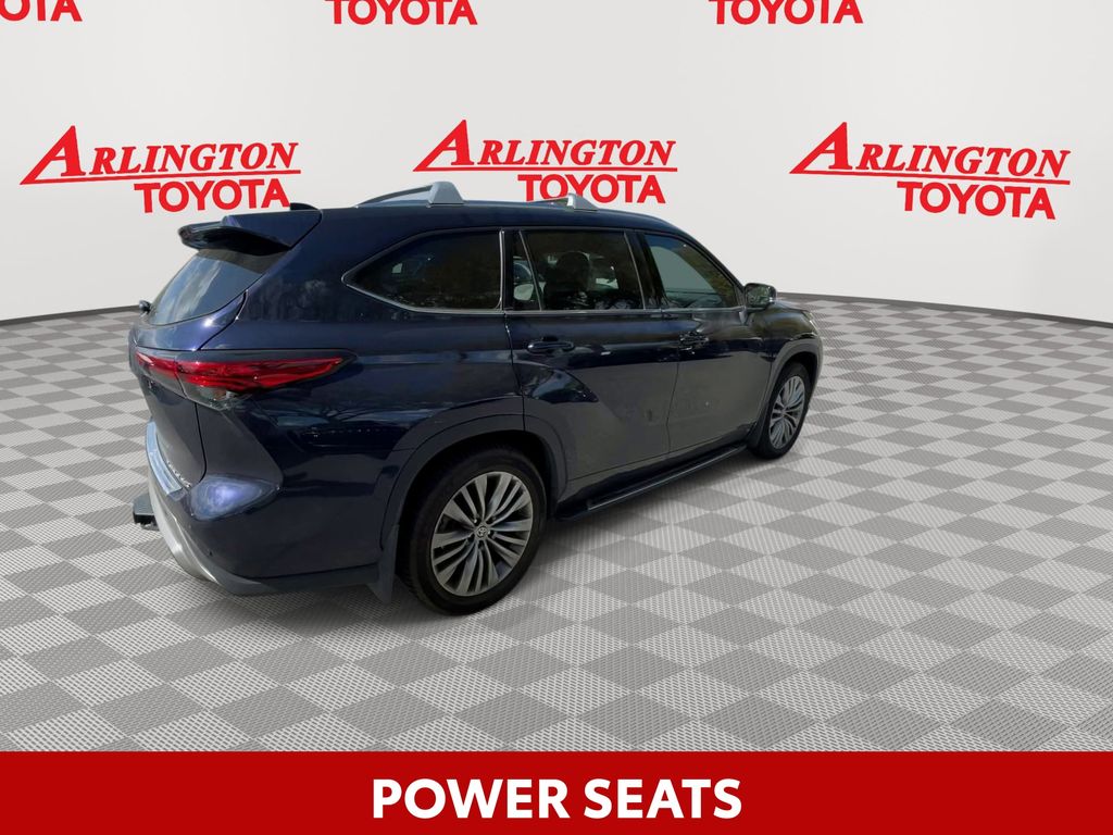 BACKUP CAMERA, BLUETOOTH HANDS FREE, ANDROID AUTO, APPLE CARPLAY, AWD/ALLWHEEL DRIVE, HEATED AND COOLED LEATHER SEATS, POWER SEATS, MEMORY SEATS, NAVIGATION SYSTEM, PANORAMIC MOONROOF, POWER LIFTGATE, SPRAY IN LINER, PUSH BUTTON START, LANE DEPARTURE, ADAPTIVE CRUISE CONTROL, NON SMOKER, Highlander Platinum AWD, 4D Sport Utility, 3.5L V6 DOHC, 8-Speed Automatic, AWD, Blueprint, Glazed Caramel Leather, Electronic Stability Control, Fully automatic headlights, 11 Speakers, 20" Painted Alloy Wheels, 3.003 Axle Ratio, 3rd row seats: split-bench, 4-Wheel Disc Brakes, ABS brakes, Air Conditioning, Alloy wheels, AM/FM radio: SiriusXM, Apple CarPlay/Android Auto, Auto High-beam Headlights, Auto-dimming Rear-View mirror, Automatic temperature control, Brake assist, Bumpers: body-color, Delay-off headlights, Digital Rearview Mirror w/HomeLink, Driver door bin, Driver vanity mirror, Dual front impact airbags, Dual front side impact airbags, Emergency communication system: Safety Connect with 1-year trial, Four wheel independent suspension, Front anti-roll bar, Front Bucket Seats, Front Center Armrest, Front dual zone A/C, Front fog lights, Front reading lights, Garage door transmitter: HomeLink, Heads-Up Display, Heated door mirrors, Heated front seats, Heated rear seats, Heated steering wheel, Heated/Ventilated Front Bucket Seats, High Grade LED Projector Headlights, Illuminated entry, Knee airbag, Leather Seat Trim, Leather Shift Knob, Low tire pressure warning, Memory seat, Navigation system: Dynamic Navigation (3-year trial), Occupant sensing airbag, Outside temperature display, Overhead airbag, Overhead console, Panic alarm, Panoramic Moonroof, Panoramic View Monitor, Passenger door bin, Passenger vanity mirror, Platinum Package, Power door mirrors, Power driver seat, Power Liftgate, Power moonroof, Power passenger seat, Power steering, Power windows, Radio: Premium Audio w/JBL Clari-Fi, Rain sensing wipers, Rear air conditioning, Rear anti-roll bar, Rear reading lights, Rear window defroster, Rear window wiper, Reclining 3rd row seat, Remote keyless entry, Roof rack: rails only, Security system, Speed control, Speed-sensing steering, Split folding rear seat, Spoiler, Steering wheel mounted audio controls, Tachometer, Telescoping steering wheel, Tilt steering wheel, Traction control, Trip computer, Turn signal indicator mirrors, Variably intermittent wipers, Ventilated front seats, Highlander Platinum AWD, 4D Sport Utility, 3.5L V6 DOHC, 8-Speed Automatic, AWD, Blueprint, Glazed Caramel Leather, Electronic Stability Control, Fully automatic headlights.