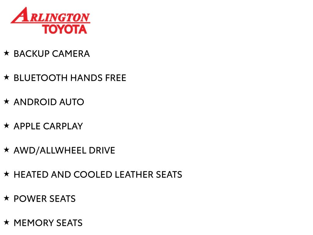 Prices do not include tax, tag, title, a pre-delivery service fee* of $894.00, an electronic registration filing fee* of $199.00 (*these charges represent costs and profits to the dealer for items such as inspecting, cleaning, and preparing documents related to the sale), and an Arlington Toyota Total Value Package of $1,889.00 (*these charges represent costs and profits to the dealer for items such as inspecting, cleaning, and preparing documents related to the sale). The final price is also subject to repair order reconditioning costs. Any price does not include dealer-installed accessories. All offers are mutually exclusive. All vehicles are subject to prior sale. See dealer for complete details.