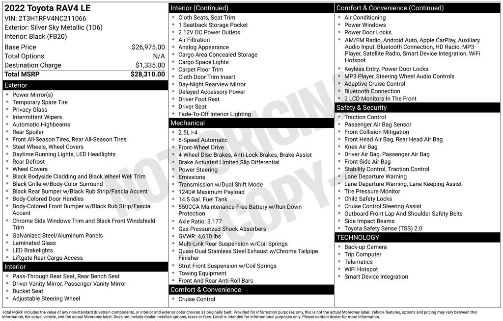 CERTIFIED BY CARFAX - ONE OWNER, BACKUP CAMERA, BLUETOOTH HANDS FREE, ANDROID AUTO, APPLE CARPLAY, LANE DEPARTURE, ADAPTIVE CRUISE CONTROL, NON SMOKER, RAV4 LE, 4D Sport Utility, 2.5L 4-Cylinder DOHC Dual VVT-i, 8-Speed Automatic, FWD, Silver Sky Metallic, Black Cloth, ABS brakes, Electronic Stability Control, Four wheel independent suspension, Low tire pressure warning, Remote keyless entry, Steering wheel mounted audio controls, 17" Steel Wheels, 4-Wheel Disc Brakes, 6 Speakers, Air Conditioning, AM/FM radio: SiriusXM, AM/FM Stereo, Apple CarPlay/Android Auto, Auto High-beam Headlights, Axle Ratio: 3.177, Brake assist, Bumpers: body-color, Driver door bin, Driver vanity mirror, Dual front impact airbags, Dual front side impact airbags, Exterior Parking Camera Rear, Fabric Seat Trim, Front anti-roll bar, Front Bucket Seats, Front Center Armrest, Front reading lights, Illuminated entry, Knee airbag, Occupant sensing airbag, Outside temperature display, Overhead airbag, Overhead console, Panic alarm, Passenger door bin, Passenger vanity mirror, Power door mirrors, Power steering, Power windows, Radio data system, Rear anti-roll bar, Rear seat center armrest, Rear window defroster, Rear window wiper, Speed control, Speed-sensing steering, Split folding rear seat, Spoiler, Tachometer, Telescoping steering wheel, Tilt steering wheel, Traction control, Trip computer, RAV4 LE, 4D Sport Utility, 2.5L 4-Cylinder DOHC Dual VVT-i, 8-Speed Automatic, FWD, Silver Sky Metallic, Black Cloth, ABS brakes, Electronic Stability Control, Four wheel independent suspension, Low tire pressure warning, Remote keyless entry, Steering wheel mounted audio controls.