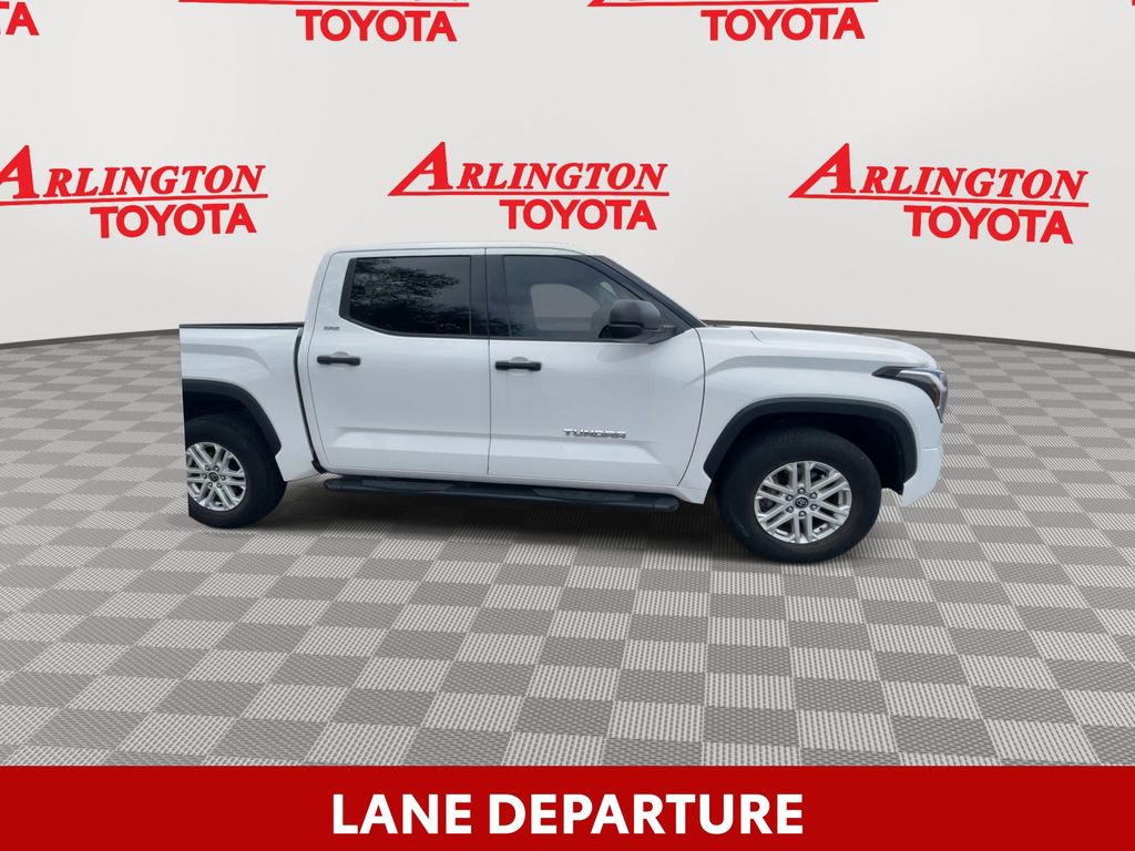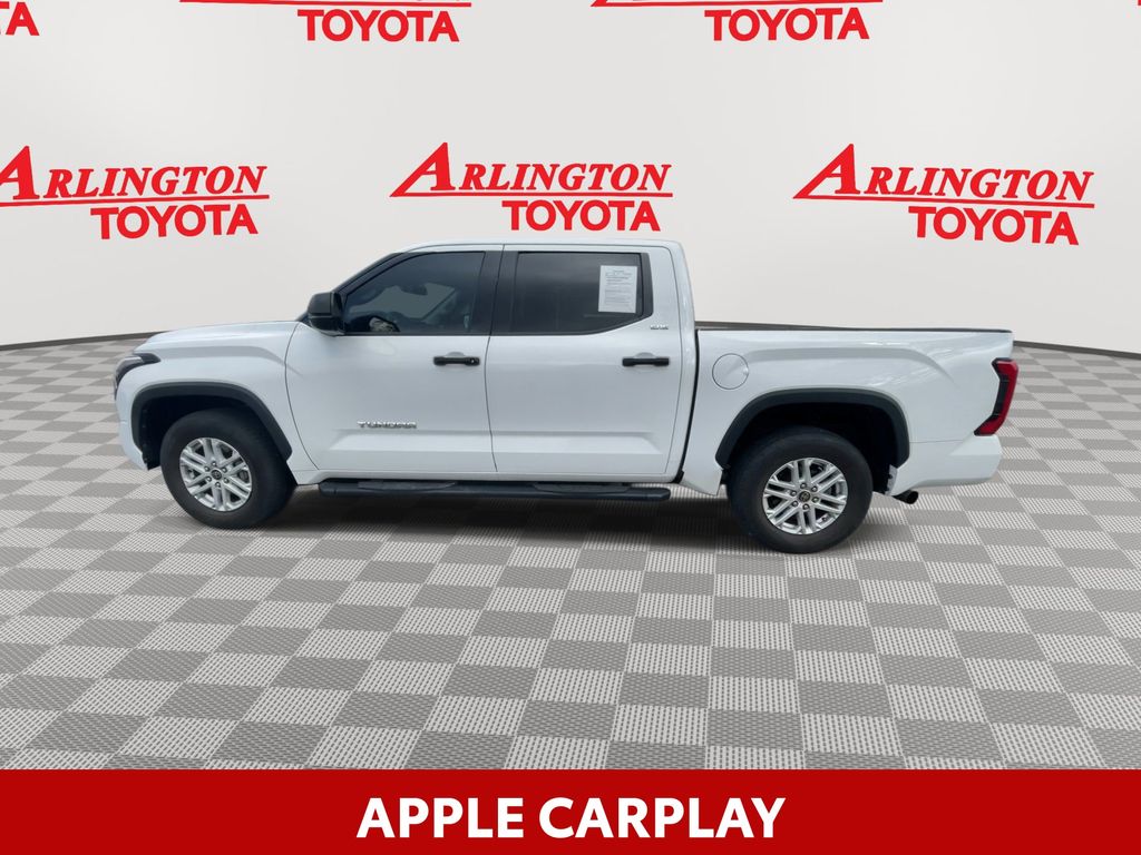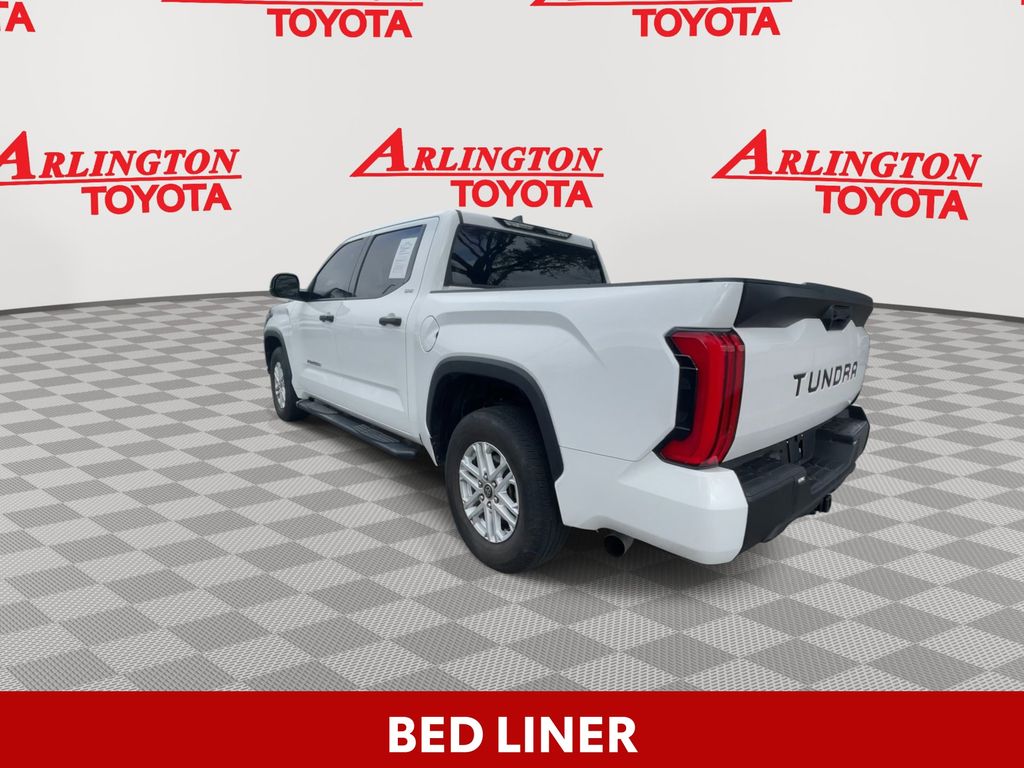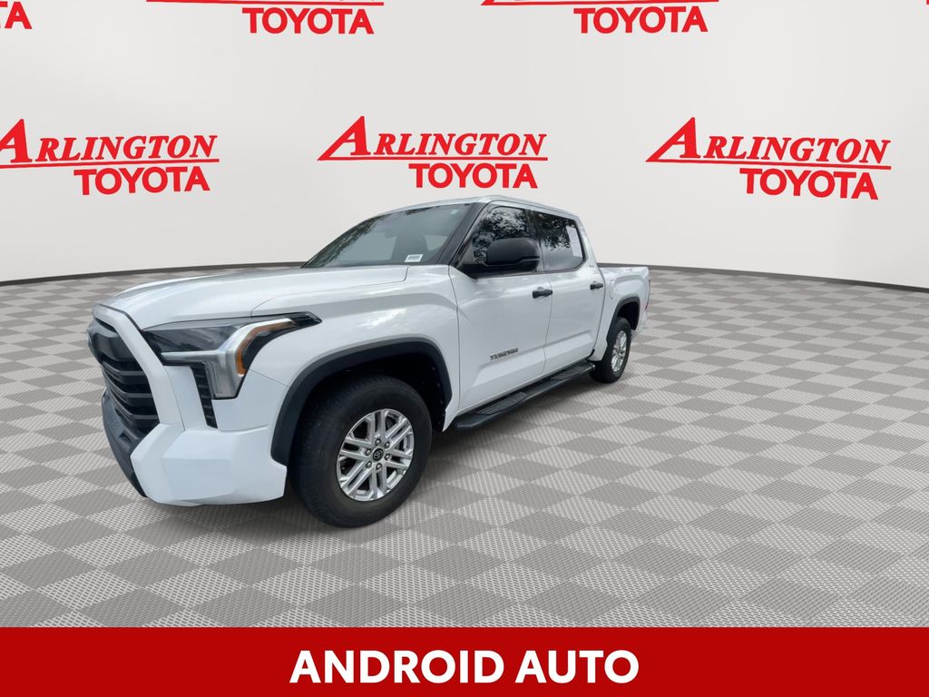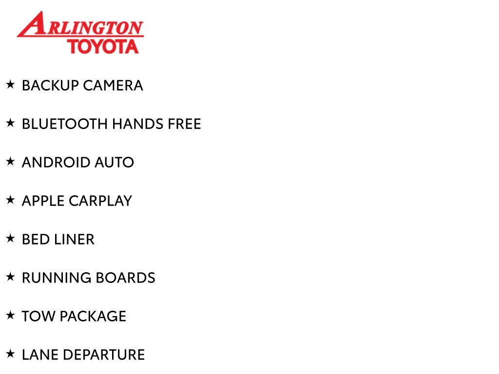 BACKUP CAMERA, BLUETOOTH HANDS FREE, ANDROID AUTO, APPLE CARPLAY, BED LINER, RUNNING BOARDS, TOW PACKAGE, LANE DEPARTURE, ADAPTIVE CRUISE CONTROL, NON SMOKER, Tundra SR5, 4D CrewMax, 3.4L V6, 10-Speed Automatic, RWD, White, Black Cloth, 18" x 8" Alloy Wheels, 3.31 Axle Ratio, 4-Wheel Disc Brakes, 9 Speakers, ABS brakes, Air Conditioning, Alloy wheels, AM/FM Radio, AM/FM radio: SiriusXM, Apple CarPlay/Android Auto, Auto High-beam Headlights, Automatic temperature control, Brake assist, Bumpers: body-color, Delay-off headlights, Driver door bin, Driver vanity mirror, Dual front impact airbags, Dual front side impact airbags, Electronic Stability Control, Emergency communication system: Safety Connect with 1-year trial, Exterior Parking Camera Rear, Fabric Seat Trim, Front anti-roll bar, Front Bucket Seats, Front Center Armrest, Front fog lights, Front reading lights, Front wheel independent suspension, Fully automatic headlights, Heated door mirrors, Illuminated entry, Knee airbag, Low tire pressure warning, Occupant sensing airbag, Outside temperature display, Overhead airbag, Overhead console, Panic alarm, Passenger door bin, Passenger vanity mirror, Power door mirrors, Power steering, Power windows, Radio data system, Rear reading lights, Rear step bumper, Rear window defroster, Remote keyless entry, Security system, Speed control, Speed-sensing steering, Split folding rear seat, Steering wheel mounted audio controls, Tachometer, Telescoping steering wheel, Tilt steering wheel, Traction control, Trip computer, Turn signal indicator mirrors, Variably intermittent wipers, Voltmeter, Tundra SR5, 4D CrewMax, 3.4L V6, 10-Speed Automatic, RWD, White, Black Cloth.