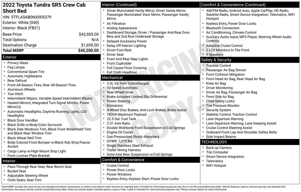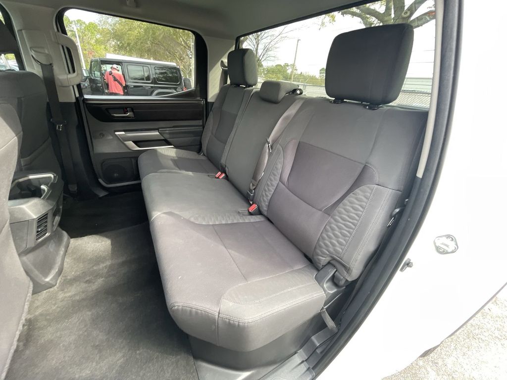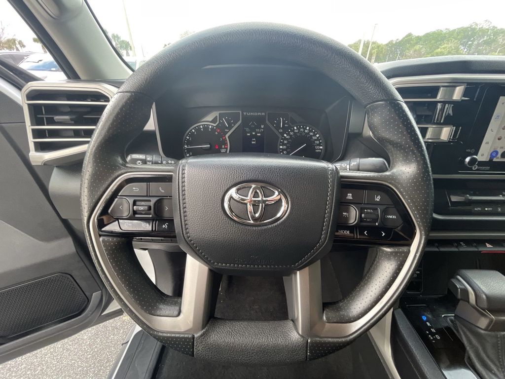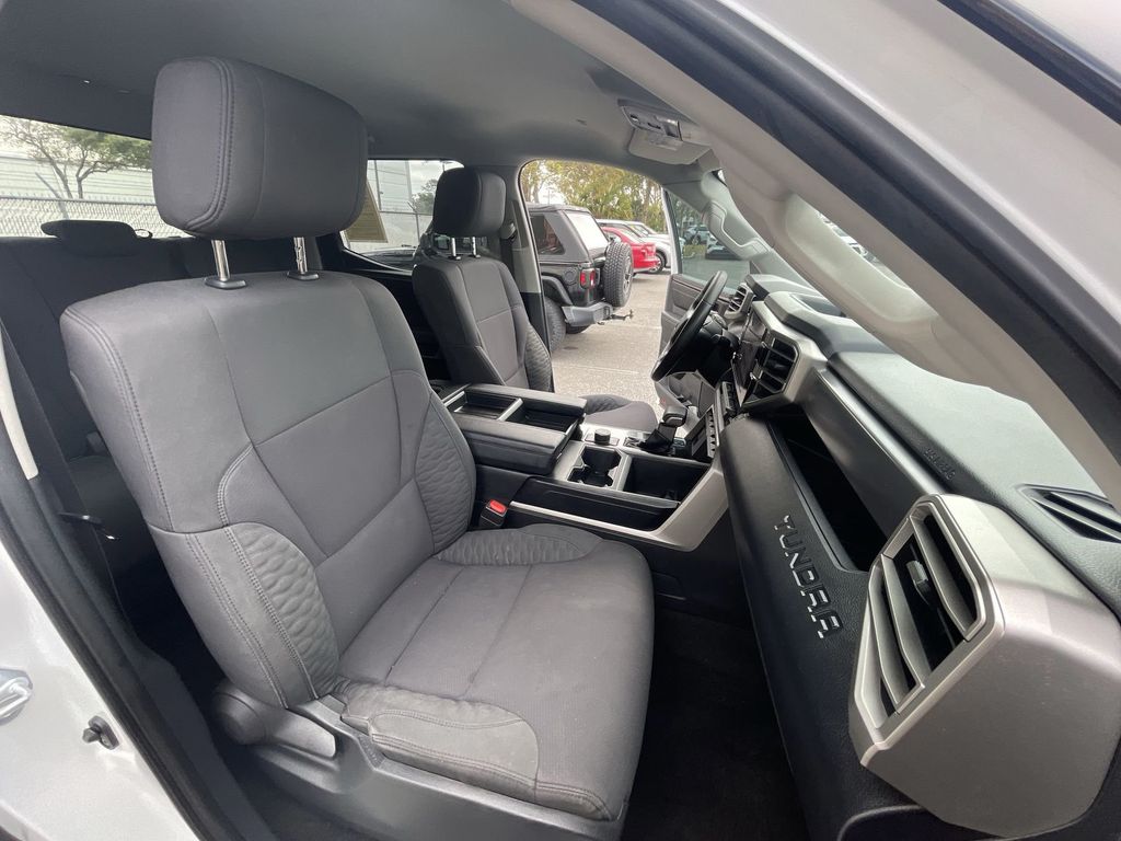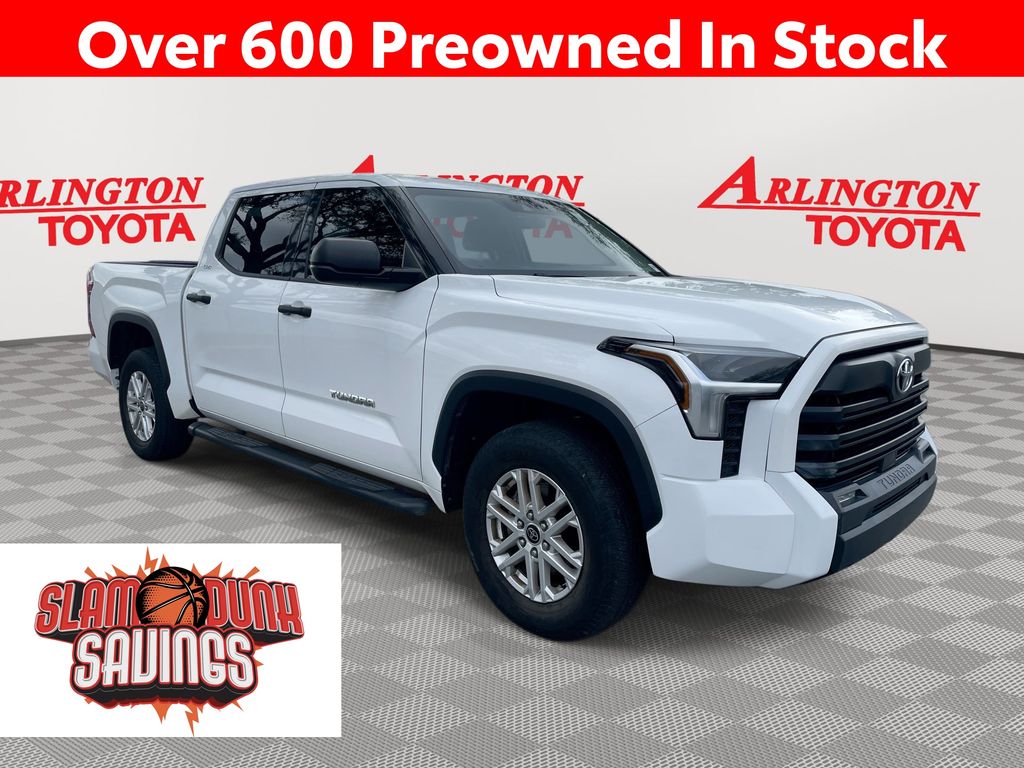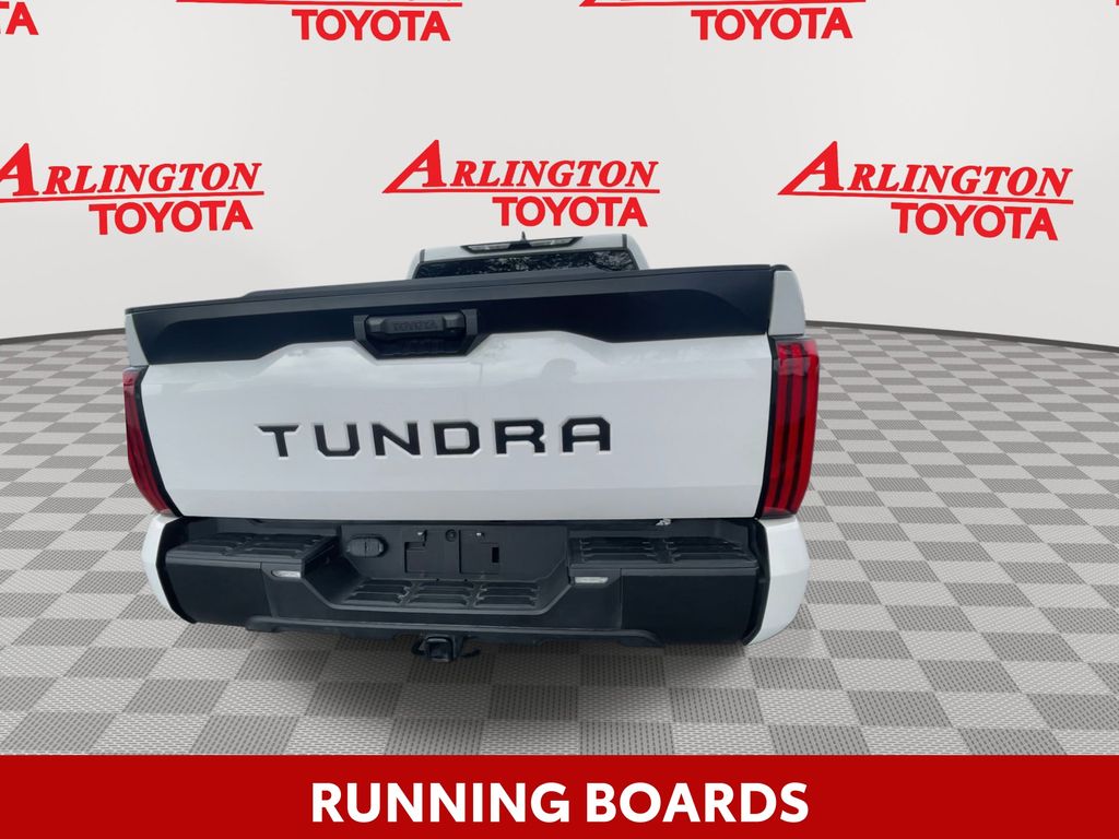BACKUP CAMERA, BLUETOOTH HANDS FREE, ANDROID AUTO, APPLE CARPLAY, BED LINER, RUNNING BOARDS, TOW PACKAGE, LANE DEPARTURE, ADAPTIVE CRUISE CONTROL, NON SMOKER, Tundra SR5, 4D CrewMax, 3.4L V6, 10-Speed Automatic, RWD, White, Black Cloth, 18" x 8" Alloy Wheels, 3.31 Axle Ratio, 4-Wheel Disc Brakes, 9 Speakers, ABS brakes, Air Conditioning, Alloy wheels, AM/FM Radio, AM/FM radio: SiriusXM, Apple CarPlay/Android Auto, Auto High-beam Headlights, Automatic temperature control, Brake assist, Bumpers: body-color, Delay-off headlights, Driver door bin, Driver vanity mirror, Dual front impact airbags, Dual front side impact airbags, Electronic Stability Control, Emergency communication system: Safety Connect with 1-year trial, Exterior Parking Camera Rear, Fabric Seat Trim, Front anti-roll bar, Front Bucket Seats, Front Center Armrest, Front fog lights, Front reading lights, Front wheel independent suspension, Fully automatic headlights, Heated door mirrors, Illuminated entry, Knee airbag, Low tire pressure warning, Occupant sensing airbag, Outside temperature display, Overhead airbag, Overhead console, Panic alarm, Passenger door bin, Passenger vanity mirror, Power door mirrors, Power steering, Power windows, Radio data system, Rear reading lights, Rear step bumper, Rear window defroster, Remote keyless entry, Security system, Speed control, Speed-sensing steering, Split folding rear seat, Steering wheel mounted audio controls, Tachometer, Telescoping steering wheel, Tilt steering wheel, Traction control, Trip computer, Turn signal indicator mirrors, Variably intermittent wipers, Voltmeter, Tundra SR5, 4D CrewMax, 3.4L V6, 10-Speed Automatic, RWD, White, Black Cloth.