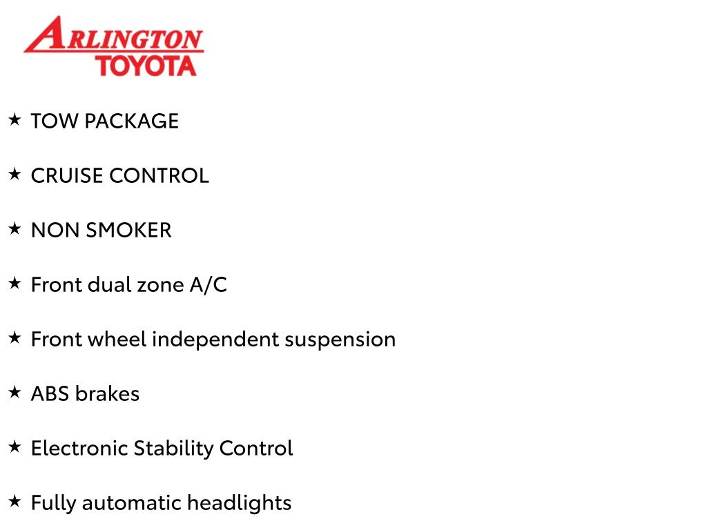 Prices do not include tax, tag, title, a pre-delivery service fee* of $894.00, an electronic registration filing fee* of $199.00 (*these charges represent costs and profits to the dealer for items such as inspecting, cleaning, and preparing documents related to the sale), and an Arlington Toyota Total Value Package of $1,889.00 (*these charges represent costs and profits to the dealer for items such as inspecting, cleaning, and preparing documents related to the sale). The final price is also subject to repair order reconditioning costs. Any price does not include dealer-installed accessories. All offers are mutually exclusive. All vehicles are subject to prior sale. See dealer for complete details.