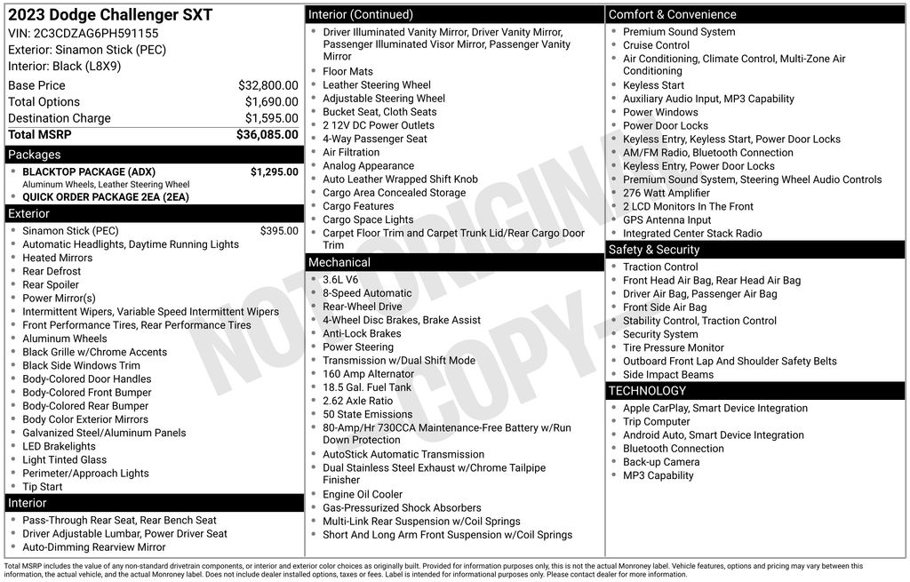 REMAINDER OF FACTORY WARRANTY STILL APPLIES, BACKUP CAMERA, BLUETOOTH HANDS FREE, ANDROID AUTO, APPLE CARPLAY, POWER SEATS, PUSH BUTTON START, CRUISE CONTROL, NON SMOKER, Challenger SE, 2D Coupe, 3.6L V6 24V VVT, 8-Speed Automatic, RWD, Sinamon Stick, Black Cloth, ABS brakes, Electronic Stability Control, Four wheel independent suspension, Front dual zone A/C, Fully automatic headlights, Low tire pressure warning, 276 Watt Amplifier, 4-Wheel Disc Brakes, 6 Speakers, Air Conditioning, Alloy wheels, AM/FM radio, Anti-Lock Brakes, Anti-whiplash front head restraints, Apple CarPlay, Apple CarPlay/Android Auto, Auto Leather Wrapped Shift Knob, Auto-dimming Rear-View mirror, Automatic temperature control, AutoStick Automatic Transmission, Black Fuel Filler Door, Black Grille w/Bezel, Blacktop Package, Body Color Exterior Mirrors, Brake assist, Bumpers: body-color, Challenger Blacktop Grille Badge, Delay-off headlights, Driver door bin, Driver vanity mirror, Dual front impact airbags, Dual front side impact airbags, Exterior Mirrors w/Heating Element, Front anti-roll bar, Front Bucket Seats, Front Center Armrest, Front reading lights, Gloss Black I/P Cluster Trim Rings, Google Android Auto, GPS Antenna Input, Heated door mirrors, Houndstooth Cloth Sport Seat, Illuminated entry, Integrated Center Stack Radio, Integrated Voice Command w/Bluetooth, Leather Performance Steering Wheel, Leather Shift Knob, Media Hub (2 USB, AUX), Outside temperature display, Overhead airbag, Overhead console, Panic alarm, ParkView Rear Back-Up Camera, Passenger door bin, Passenger vanity mirror, Power door mirrors, Power driver seat, Power steering, Power windows, Quick Order Package 2EA, Radio data system, Radio: Uconnect 4 w/7" Display, Rear anti-roll bar, Rear reading lights, Rear seat center armrest, Rear window defroster, Remote keyless entry, Satin Black Dodge Tail Lamp Badge, Security system, Speed control, Speed-sensing steering, Split folding rear seat, Spoiler, Steering wheel mounted audio controls, Tachometer, Telescoping steering wheel, Tilt steering wheel, Tip Start, Traction control, Trip computer, USB Host Flip, Variably intermittent wipers, Wheels: 18" x 7.5" Aluminum Fine Silver, Wheels: 20" x 8.0" Black Noise Painted, Challenger SE, 2D Coupe, 3.6L V6 24V VVT, 8-Speed Automatic, RWD, Sinamon Stick, Black Cloth, ABS brakes, Electronic Stability Control, Four wheel independent suspension, Front dual zone A/C, Fully automatic headlights, Low tire pressure warning.