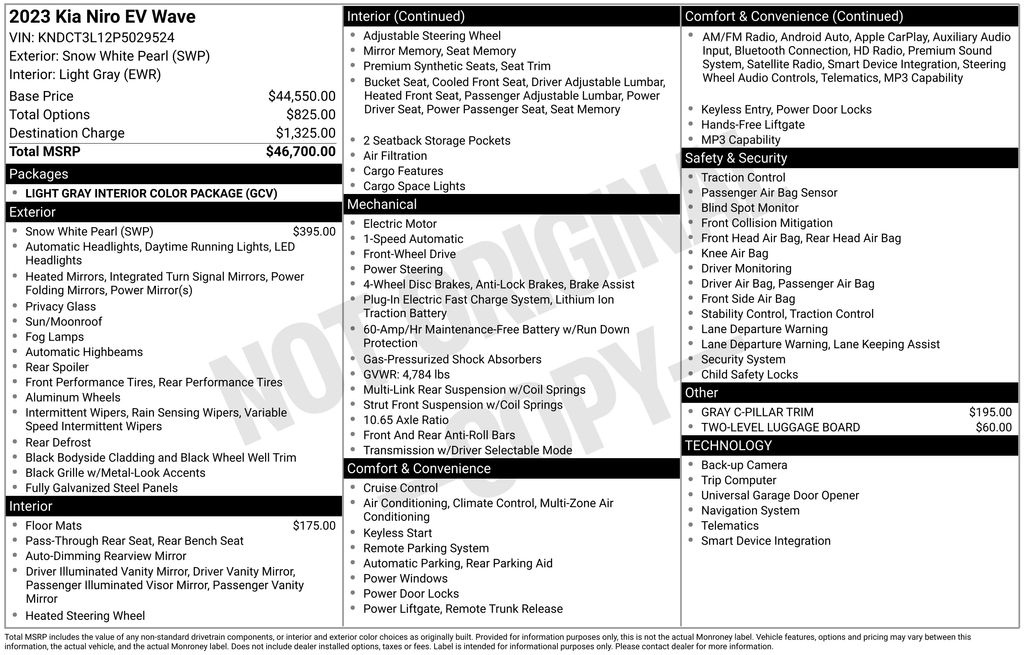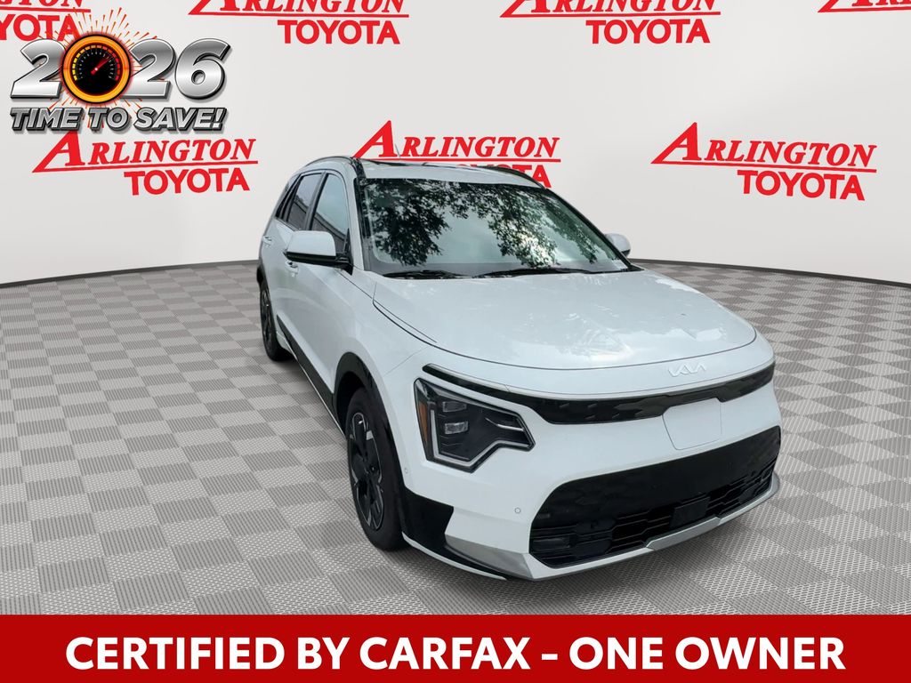 CERTIFIED BY CARFAX - ONE OWNER, REMAINDER OF FACTORY WARRANTY STILL APPLIES, BACKUP CAMERA, BLUETOOTH HANDS FREE, ANDROID AUTO, APPLE CARPLAY, POWER SEATS, MEMORY SEATS, PUSH BUTTON START, CRUISE CONTROL, NON SMOKER, Niro EV Wave, 4D Sport Utility, Electric Motor, 1-Speed Automatic, FWD, Snow White Pearl, Light Gray Leather, ABS brakes, Electronic Stability Control, Four wheel independent suspension, Front dual zone A/C, Fully automatic headlights, Low tire pressure warning, Remote keyless entry, Steering wheel mounted audio controls, Turn signal indicator mirrors, 10.65 Axle Ratio, 4-Wheel Disc Brakes, 8 Speakers, Air Conditioning, Alloy wheels, AM/FM radio: SiriusXM, Apple CarPlay & Android Auto, Auto High-beam Headlights, Auto-dimming Rear-View mirror, Automatic temperature control, Brake assist, Bumpers: body-color, Carpet Floor Mats, Delay-off headlights, Driver door bin, Driver vanity mirror, Dual front impact airbags, Dual front side impact airbags, Exterior Parking Camera Rear, Front anti-roll bar, Front Bucket Seats, Front Center Armrest, Front fog lights, Front reading lights, Garage door transmitter: HomeLink, Gray C-Pillar Trim, harman/kardon® Speakers, Heated & Ventilated Front Bucket Seats, Heated door mirrors, Heated front seats, Heated steering wheel, Illuminated entry, Knee airbag, Light Gray Interior Color Package, Memory seat, Navigation System, Occupant sensing airbag, Outside temperature display, Overhead airbag, Overhead console, Panic alarm, Passenger door bin, Passenger vanity mirror, Perforated Vegan Leather-Trimmed Seats, Power door mirrors, Power driver seat, Power Liftgate, Power moonroof, Power passenger seat, Power steering, Power windows, Radio: harman/kardon Premium Audio System, Rain sensing wipers, Rear anti-roll bar, Rear seat center armrest, Rear window defroster, Rear window wiper, Security system, Speed control, Speed-sensing steering, Split folding rear seat, Spoiler, Telescoping steering wheel, Tilt steering wheel, Traction control, Trip computer, Two-Level Luggage Board, Variably intermittent wipers, Ventilated front seats, Wheels: 7.0J x 17" Aero Alloy, Niro EV Wave, 4D Sport Utility, Electric Motor, 1-Speed Automatic, FWD, Snow White Pearl, Light Gray Leather, ABS brakes, Electronic Stability Control, Four wheel independent suspension, Front dual zone A/C, Fully automatic headlights, Low tire pressure warning, Remote keyless entry, Steering wheel mounted audio controls, Turn signal indicator mirrors.