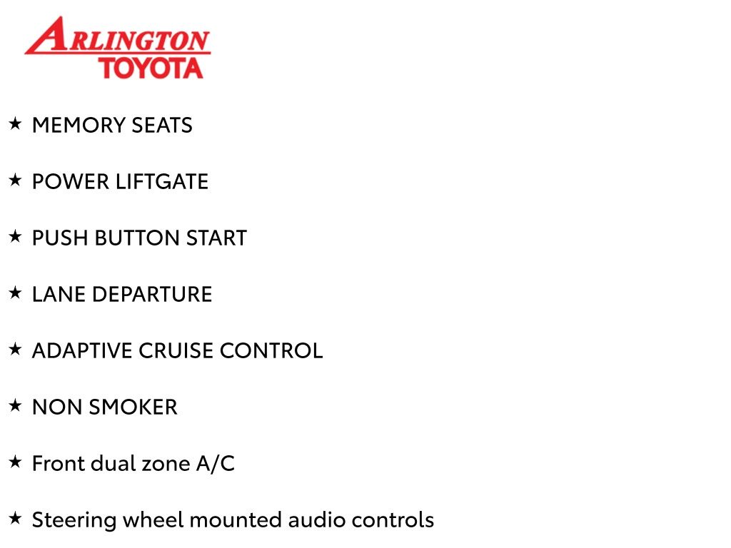 Prices do not include tax, tag, title, a pre-delivery service fee* of $894.00, an electronic registration filing fee* of $199.00 (*these charges represent costs and profits to the dealer for items such as inspecting, cleaning, and preparing documents related to the sale), and an Arlington Toyota Total Value Package of $1,889.00 (*these charges represent costs and profits to the dealer for items such as inspecting, cleaning, and preparing documents related to the sale). The final price is also subject to repair order reconditioning costs. Any price does not include dealer-installed accessories. All offers are mutually exclusive. All vehicles are subject to prior sale. See dealer for complete details.