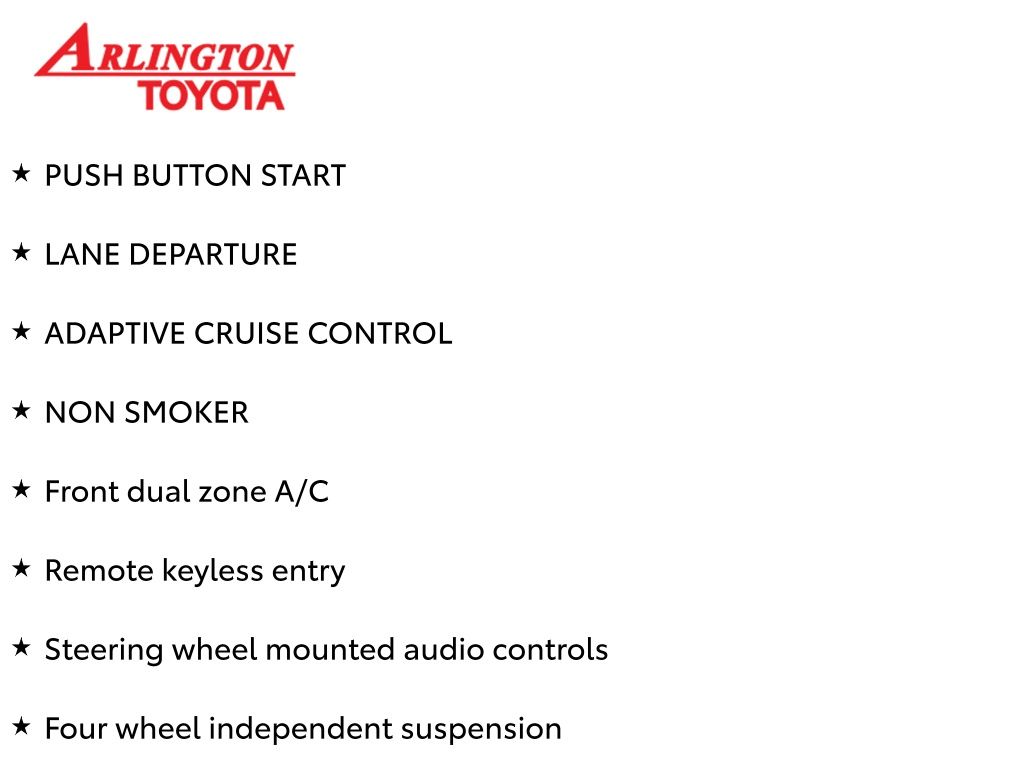 Prices do not include tax, tag, title, a pre-delivery service fee* of $894.00, an electronic registration filing fee* of $199.00 (*these charges represent costs and profits to the dealer for items such as inspecting, cleaning, and preparing documents related to the sale), and an Arlington Toyota Total Value Package of $1,889.00 (*these charges represent costs and profits to the dealer for items such as inspecting, cleaning, and preparing documents related to the sale). The final price is also subject to repair order reconditioning costs. Any price does not include dealer-installed accessories. All offers are mutually exclusive. All vehicles are subject to prior sale. See dealer for complete details.
