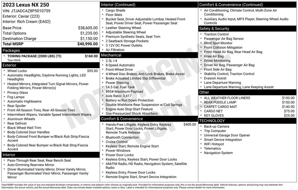CERTIFIED BY CARFAX - ONE OWNER, REMAINDER OF FACTORY WARRANTY STILL APPLIES, BACKUP CAMERA, BLUETOOTH HANDS FREE, ANDROID AUTO, APPLE CARPLAY, POWER SEATS, POWER LIFTGATE, PUSH BUTTON START, LANE DEPARTURE, ADAPTIVE CRUISE CONTROL, NON SMOKER, NX 250 Base, 4D Sport Utility, 2.5L I4 DOHC 16V, 8-Speed Automatic, FWD, Caviar, Rich Cream w/NuLuxe Seat Trim, ABS brakes, Electronic Stability Control, Four wheel independent suspension, Front dual zone A/C, Fully automatic headlights, Low tire pressure warning, Remote keyless entry, Steering wheel mounted audio controls, 10 Speakers, 18" Wheels, 4-Wheel Disc Brakes, Air Conditioning, All Weather Floor Liners, Alloy Wheel Locks, Alloy wheels, AM/FM radio: SiriusXM, Anti-whiplash front head restraints, Auto High-beam Headlights, Auto-dimming door mirrors, Auto-dimming Rear-View mirror, Automatic temperature control, Axle Ratio: 3.417, Brake assist, Bumpers: body-color, Cargo Net, Carpet Cargo Mat, Delay-off headlights, Driver door bin, Driver vanity mirror, Dual front impact airbags, Dual front side impact airbags, Exterior Parking Camera Rear, Front anti-roll bar, Front Bucket Seats, Front Center Armrest, Front fog lights, Front reading lights, Garage door transmitter: HomeLink, Heated door mirrors, Heated Front Bucket Seats, Heated front seats, Illuminated entry, Key Gloves, Knee airbag, Leather Shift Knob, Navigation system: Drive Connect Cloud Navigation (subscription required), NuLuxe Seat Trim, Occupant sensing airbag, Outside temperature display, Overhead airbag, Overhead console, Panic alarm, Passenger door bin, Passenger vanity mirror, Power Back Door, Power door mirrors, Power driver seat, Power passenger seat, Power steering, Power windows, Radio data system, Radio: 10-Speaker Sound System, Rear anti-roll bar, Rear Puddle Lamp, Rear reading lights, Rear seat center armrest, Rear window defroster, Rear window wiper, Roof rack: rails only, Security system, Speed control, Speed-sensing steering, Split folding rear seat, Spoiler, Tachometer, Telescoping steering wheel, Tilt steering wheel, Towing Package (2000 lbs), Traction control, Trip computer, Turn signal indicator mirrors, Variably intermittent wipers, Wireless Apple CarPlay/Wireless Android Auto, Wireless Smart Door Lock, NX 250 Base, 4D Sport Utility, 2.5L I4 DOHC 16V, 8-Speed Automatic, FWD, Caviar, Rich Cream w/NuLuxe Seat Trim, ABS brakes, Electronic Stability Control, Four wheel independent suspension, Front dual zone A/C, Fully automatic headlights, Low tire pressure warning, Remote keyless entry, Steering wheel mounted audio controls.