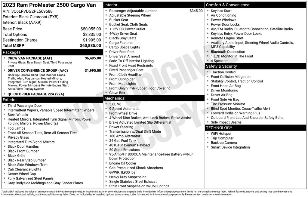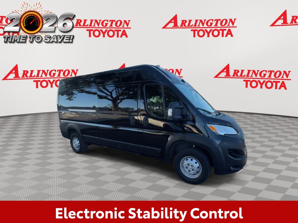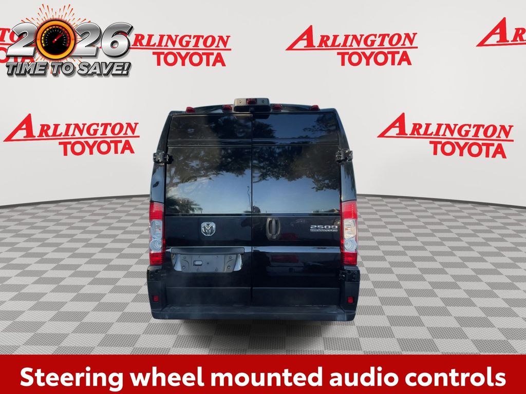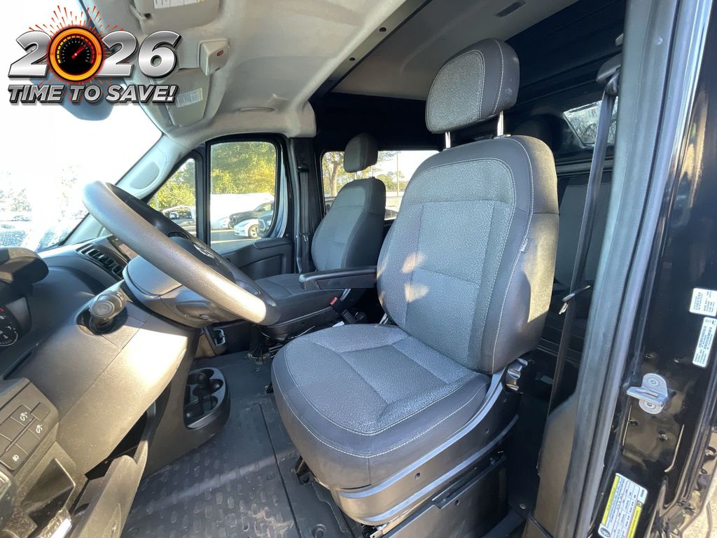 BACKUP CAMERA, BLUETOOTH HANDS FREE, CRUISE CONTROL, NON SMOKER, ProMaster 2500 High Roof, 3D Cargo Van, 3.6L V6 24V VVT, 9-Speed 948TE Automatic, FWD, Black Clearcoat, Black Cloth, ABS brakes, Electronic Stability Control, Low tire pressure warning, Steering wheel mounted audio controls, 4 Speakers, 4-Wheel Disc Brakes, 4.08 Axle Ratio, Air Conditioning, AM/FM radio: SiriusXM, Apple CarPlay/Android Auto, Black/Gray Seats, Blind Spot & Cross Path Detection, Bodyside moldings, Brake assist, Center Wheel Cap, Cloth Bucket Seats, Crew Van Package, Deep Tint Sunscreen Glass, Driver Convenience Group, Driver door bin, Driver Seat Armrest, Driver Side 2nd Row Fixed Window, Driver's Seat Mounted Armrest, Front anti-roll bar, Front Bucket Seats, Front Fog Lamps, Front reading lights, Front wheel independent suspension, Heavy Duty Suspension, Illuminated entry, Manual Folding Exterior Mirrors, MOPAR Crew Van Kit, Outside temperature display, Overhead airbag, Overhead console, ParkView Rear Back-Up Camera, Passenger Bucket Seat, Passenger door bin, Passenger Sliding Door w/Window (Polycarb), Polycarbonate Window Material, Power Folding/Heated Mirrors, Power steering, Power windows, Quick Order Package 22A, Radio: Uconnect 5 w/7" Display, Remote keyless entry, Remote Start System, Surround View Camera System, Tachometer, Telescoping steering wheel, Traction control, Trip computer, Turn signal indicator mirrors, Variably intermittent wipers, Wheels: 16" x 6.0" Steel, ProMaster 2500 High Roof, 3D Cargo Van, 3.6L V6 24V VVT, 9-Speed 948TE Automatic, FWD, Black Clearcoat, Black Cloth, ABS brakes, Electronic Stability Control, Low tire pressure warning, Steering wheel mounted audio controls.