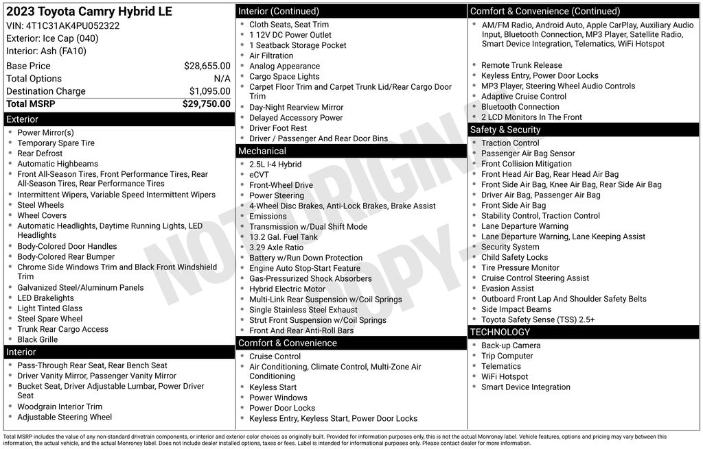 4-Wheel Disc Brakes, 6 Speakers, 6.5J x 16" Steel Wheels, ABS brakes, Air Conditioning, AM/FM radio: SiriusXM, Apple CarPlay/Android Auto, Auto High-beam Headlights, Automatic temperature control, Brake assist, Bumpers: body-color, Delay-off headlights, Driver door bin, Driver vanity mirror, Dual front impact airbags, Dual front side impact airbags, Electronic Stability Control, Emergency communication system: Safety Connect (1-year trial), Exterior Parking Camera Rear, Fabric Seat Trim, Four wheel independent suspension, Front anti-roll bar, Front Bucket Seats, Front Center Armrest, Front dual zone A/C, Front reading lights, Fully automatic headlights, Illuminated entry, Knee airbag, Low tire pressure warning, Occupant sensing airbag, Outside temperature display, Overhead airbag, Overhead console, Panic alarm, Passenger door bin, Passenger vanity mirror, Power door mirrors, Power driver seat, Power steering, Power windows, Radio data system, Radio: Audio, Rear anti-roll bar, Rear seat center armrest, Rear side impact airbag, Rear window defroster, Remote keyless entry, Security system, Speed control, Speed-sensing steering, Split folding rear seat, Steering wheel mounted audio controls, Telescoping steering wheel, Tilt steering wheel, Traction control, Trip computer, Variably intermittent wipers.