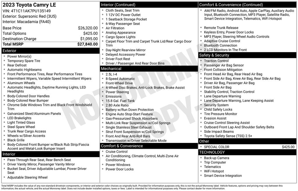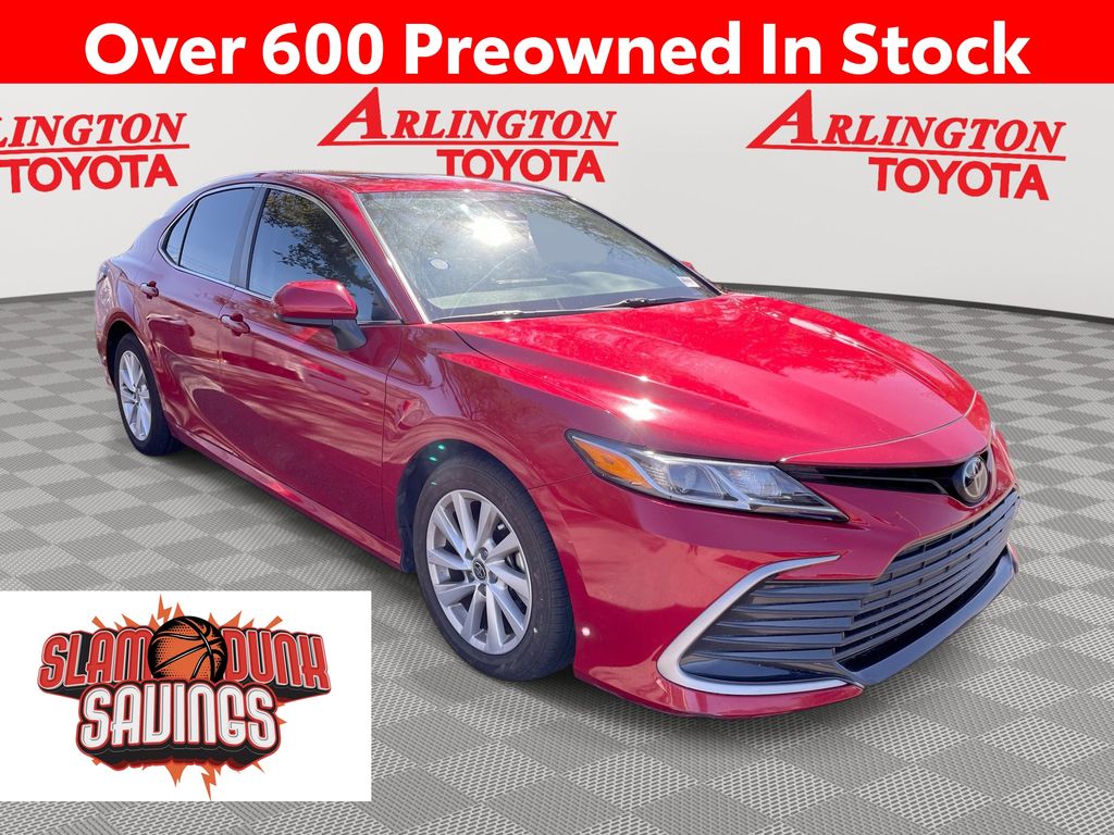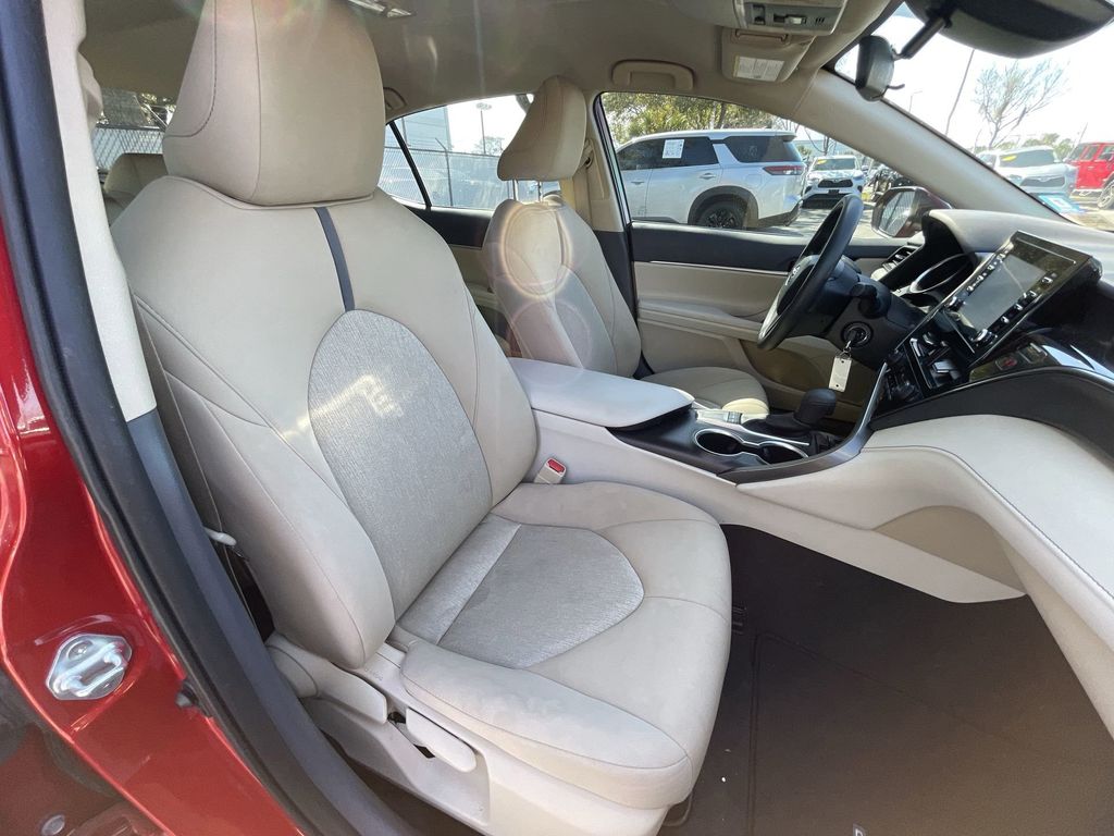BACKUP CAMERA, BLUETOOTH HANDS FREE, ANDROID AUTO, APPLE CARPLAY, POWER SEATS, LANE DEPARTURE, ADAPTIVE CRUISE CONTROL, NON SMOKER, Camry LE, 4D Sedan, 2.5L I4 DOHC 16V, 8-Speed Automatic, FWD, Supersonic Red, Macadamia Cloth, Electronic Stability Control, 4-Wheel Disc Brakes, 6 Speakers, 7.5J x 17" Alloy Wheels, ABS brakes, Air Conditioning, Alloy wheels, AM/FM radio: SiriusXM, Apple CarPlay/Android Auto, Auto High-beam Headlights, Automatic temperature control, Brake assist, Bumpers: body-color, Delay-off headlights, Driver door bin, Driver vanity mirror, Dual front impact airbags, Dual front side impact airbags, Emergency communication system: Safety Connect (1-year trial), Exterior Parking Camera Rear, Fabric Seat Trim, Four wheel independent suspension, Front anti-roll bar, Front Bucket Seats, Front Center Armrest, Front dual zone A/C, Front reading lights, Fully automatic headlights, Illuminated entry, Knee airbag, Low tire pressure warning, Occupant sensing airbag, Outside temperature display, Overhead airbag, Overhead console, Panic alarm, Passenger door bin, Passenger vanity mirror, Power door mirrors, Power driver seat, Power steering, Power windows, Radio data system, Radio: Audio, Rear anti-roll bar, Rear seat center armrest, Rear side impact airbag, Rear window defroster, Remote keyless entry, Security system, Speed control, Speed-sensing steering, Split folding rear seat, Steering wheel mounted audio controls, Tachometer, Telescoping steering wheel, Tilt steering wheel, Traction control, Trip computer, Variably intermittent wipers, Camry LE, 4D Sedan, 2.5L I4 DOHC 16V, 8-Speed Automatic, FWD, Supersonic Red, Macadamia Cloth, Electronic Stability Control.