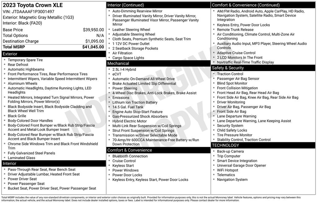 REMAINDER OF FACTORY WARRANTY STILL APPLIES, BACKUP CAMERA, BLUETOOTH HANDS FREE, ANDROID AUTO, APPLE CARPLAY, AWD/ALLWHEEL DRIVE, POWER SEATS, LOCAL TRADE IN, PUSH BUTTON START, LANE DEPARTURE, ADAPTIVE CRUISE CONTROL, NON SMOKER, Crown XLE AWD, 4D Sedan, 2.5L 4-Cylinder DOHC, CVT, AWD, Magnetic Gray Metallic, Black w/SofTex Seat Trim, Electronic Stability Control, Fully automatic headlights, Turn signal indicator mirrors, 4-Wheel Disc Brakes, ABS brakes, Air Conditioning, Alloy wheels, AM/FM radio: SiriusXM, Apple CarPlay/Android Auto, Auto High-beam Headlights, Auto-dimming Rear-View mirror, Automatic temperature control, Brake assist, Bumpers: body-color, Compass, Delay-off headlights, Driver door bin, Driver vanity mirror, Dual front impact airbags, Dual front side impact airbags, Emergency communication system: Safety Connect (1-year trial), Exterior Parking Camera Rear, Four wheel independent suspension, Front anti-roll bar, Front Bucket Seats, Front Center Armrest, Front dual zone A/C, Front reading lights, Garage door transmitter: HomeLink, Heated door mirrors, Heated front seats, Illuminated entry, Knee airbag, Leather Shift Knob, Leather steering wheel, Low tire pressure warning, Navigation system: Dynamic Navigation (3-year trial), Occupant sensing airbag, Outside temperature display, Overhead airbag, Overhead console, Panic alarm, Passenger door bin, Passenger vanity mirror, Power door mirrors, Power driver seat, Power passenger seat, Power steering, Power windows, Radio data system, Rear anti-roll bar, Rear reading lights, Rear seat center armrest, Rear side impact airbag, Rear window defroster, Remote keyless entry, Security system, Speed control, Speed-sensing steering, Split folding rear seat, Steering wheel mounted audio controls, Tachometer, Telescoping steering wheel, Tilt steering wheel, Traction control, Trip computer, Variably intermittent wipers, Wheels: 19" x 7" Multi-Spoke Machined 2-Tone Alloy, Crown XLE AWD, 4D Sedan, 2.5L 4-Cylinder DOHC, CVT, AWD, Magnetic Gray Metallic, Black w/SofTex Seat Trim, Electronic Stability Control, Fully automatic headlights, Turn signal indicator mirrors.