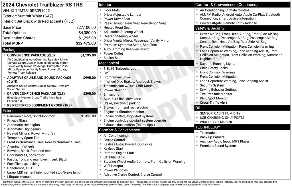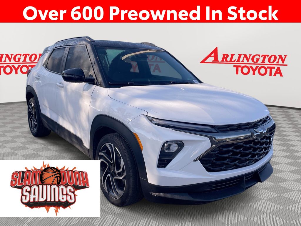 CERTIFIED BY CARFAX - ONE OWNER, REMAINDER OF FACTORY WARRANTY STILL APPLIES, BACKUP CAMERA, BLUETOOTH HANDS FREE, ANDROID AUTO, APPLE CARPLAY, POWER SEATS, PUSH BUTTON START, CRUISE CONTROL, NON SMOKER, TrailBlazer RS, 4D Sport Utility, 1.3L Ecotec Turbo DOHC SIDI w/VVT, CVT, FWD, Summit White, Jet Black With Red Accents, 1 Type-A & 1 Type-C USB Charging-Only Ports, 120-Volt Power Outlet, ABS brakes, Convenience Package, Driver & Front Passenger Illuminated Vanity Mirrors, Electronic Stability Control, Fully automatic headlights, Hands-Free Power Programmable Liftgate, Inside Rear-View Auto-Dimming Mirror, Low tire pressure warning, Remote keyless entry, Single-Zone Auto Climate Control Air Conditioning, Steering wheel mounted audio controls, Wireless Charging, 1 Type-A & 1 Type-C USB Ports, 11" Diagonal HD Color Touchscreen, 2-Way Power Driver Lumbar Seat Adjuster, 4-Way Manual Front Passenger Seat Adjuster, 4-Wheel Disc Brakes, 5.45 Final Drive Axle Ratio, 6 Speakers, 6-Speaker Audio System Feature, 8-Way Power Driver Seat Adjuster, Adaptive Cruise & Sound Package, Adaptive Cruise Control, Air Conditioning, Alloy wheels, AM/FM radio: SiriusXM, Auto High-beam Headlights, Bose Premium 7-Speaker Audio System Feature, Brake assist, Bumpers: body-color, Cabin Humidity Sensor, Chevrolet Connected Access Capable, Compass, Delay-off headlights, Driver Confidence Package, Driver door bin, Driver vanity mirror, Dual front impact airbags, Dual front side impact airbags, Dual-Pane Panoramic Power Sunroof, Evotex Seat Trim, Exterior Parking Camera Rear, Flat-Folding Front Passenger Seatback, Front anti-roll bar, Front Bucket Seats, Front Center Armrest, Front reading lights, Front wheel independent suspension, Heated door mirrors, Heated Driver & Front Passenger Seats, Heated front seats, Heated steering wheel, Illuminated entry, Knee airbag, Lane Change Alert w/Side Blind Zone Alert, Mosaic Black Metallic Two-Tone Roof, Occupant sensing airbag, Overhead airbag, Overhead console, Panic alarm, Passenger door bin, Passenger vanity mirror, Power door mirrors, Power driver seat, Power steering, Power windows, Preferred Equipment Group 1RS, Radio data system, Radio: AM/FM Stereo Audio System, Rear Cross Traffic Alert, Rear Park Assist, Rear seat center armrest, Rear side impact airbag, Rear window defroster, Rear window wiper, Ride & Handling Suspension, Security system, SiriusXM, Speed control, Split folding rear seat, Spoiler, Tachometer, Telescoping steering wheel, Tilt steering wheel, Traction control, Trip computer, Variably intermittent wipers, Wheels: 19" High Gloss Black Machined Aluminum, Wireless Apple CarPlay/Android Auto, TrailBlazer RS, 4D Sport Utility, 1.3L Ecotec Turbo DOHC SIDI w/VVT, CVT, FWD, Summit White, Jet Black With Red Accents, 1 Type-A & 1 Type-C USB Charging-Only Ports, 120-Volt Power Outlet, ABS brakes, Convenience Package, Driver & Front Passenger Illuminated Vanity Mirrors, Electronic Stability Control, Fully automatic headlights, Hands-Free Power Programmable Liftgate, Inside Rear-View Auto-Dimming Mirror, Low tire pressure warning, Remote keyless entry, Single-Zone Auto Climate Control Air Conditioning, Steering wheel mounted audio controls, Wireless Charging.