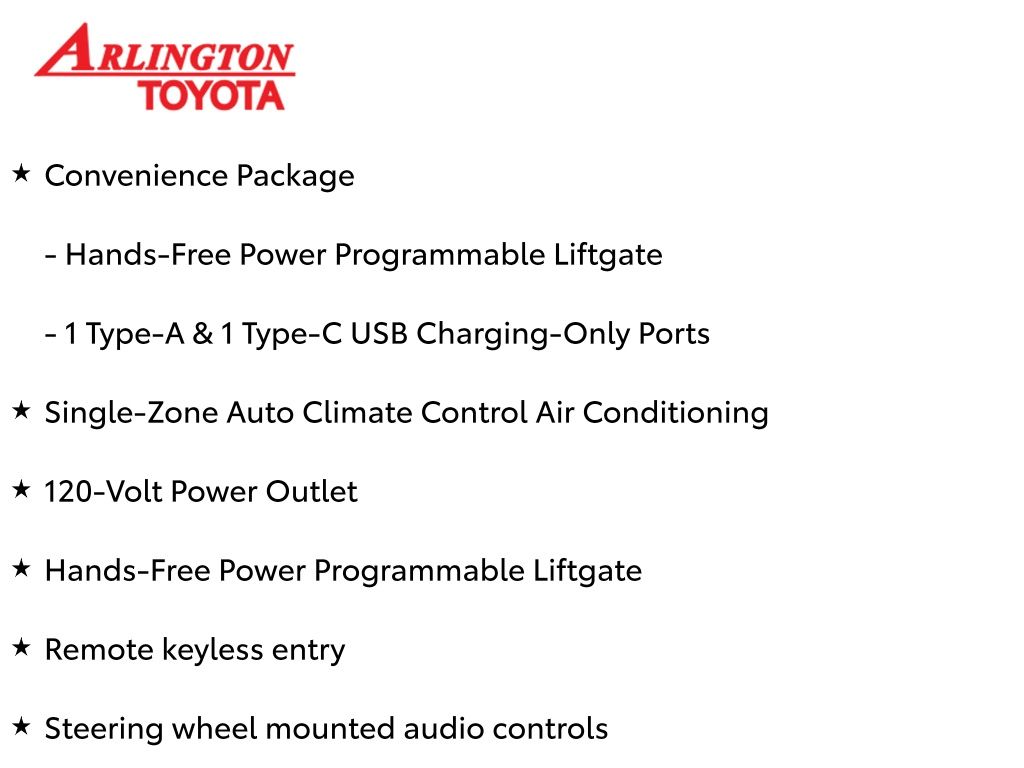 Prices do not include tax, tag, title, a pre-delivery service fee* of $894.00, an electronic registration filing fee* of $199.00 (*these charges represent costs and profits to the dealer for items such as inspecting, cleaning, and preparing documents related to the sale), and an Arlington Toyota Total Value Package of $1,889.00 (*these charges represent costs and profits to the dealer for items such as inspecting, cleaning, and preparing documents related to the sale). The final price is also subject to repair order reconditioning costs. Any price does not include dealer-installed accessories. All offers are mutually exclusive. All vehicles are subject to prior sale. See dealer for complete details.
