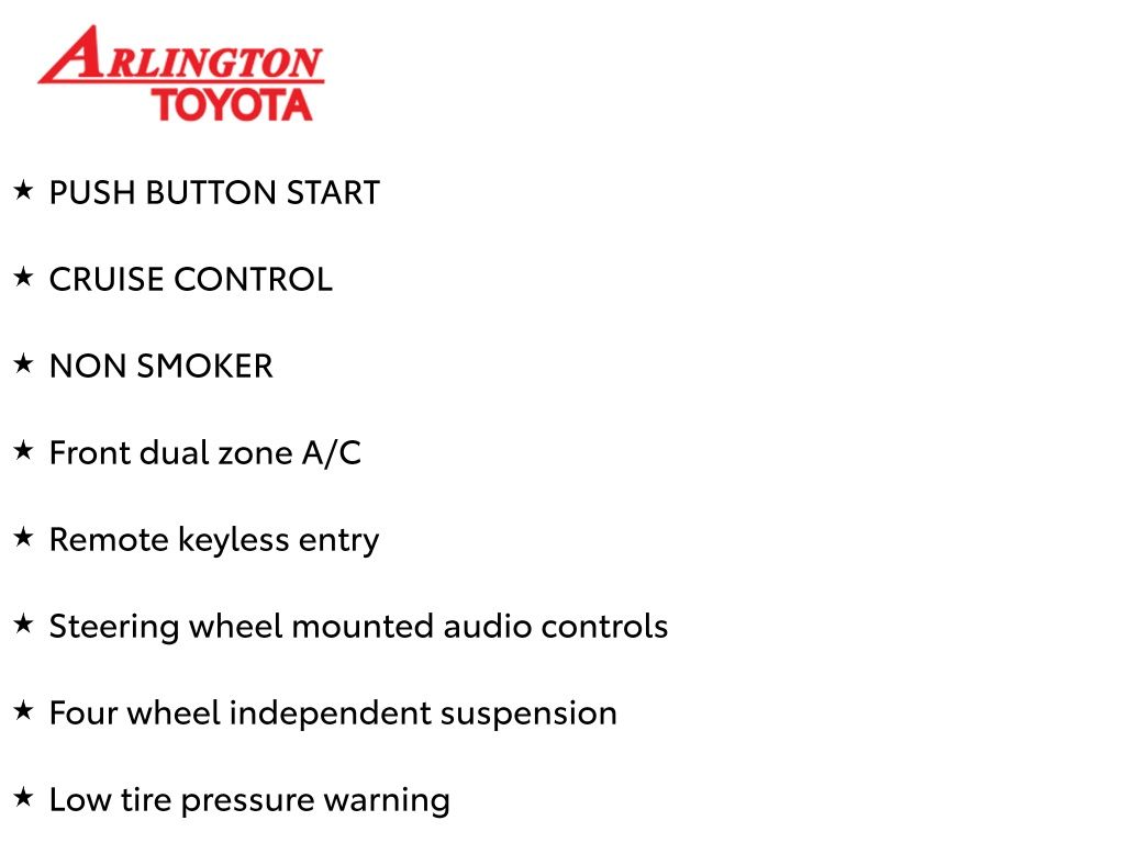Prices do not include tax, tag, title, a pre-delivery service fee* of $894.00, an electronic registration filing fee* of $199.00 (*these charges represent costs and profits to the dealer for items such as inspecting, cleaning, and preparing documents related to the sale), and an Arlington Toyota Total Value Package of $1,889.00 (*these charges represent costs and profits to the dealer for items such as inspecting, cleaning, and preparing documents related to the sale). The final price is also subject to repair order reconditioning costs. Any price does not include dealer-installed accessories. All offers are mutually exclusive. All vehicles are subject to prior sale. See dealer for complete details.