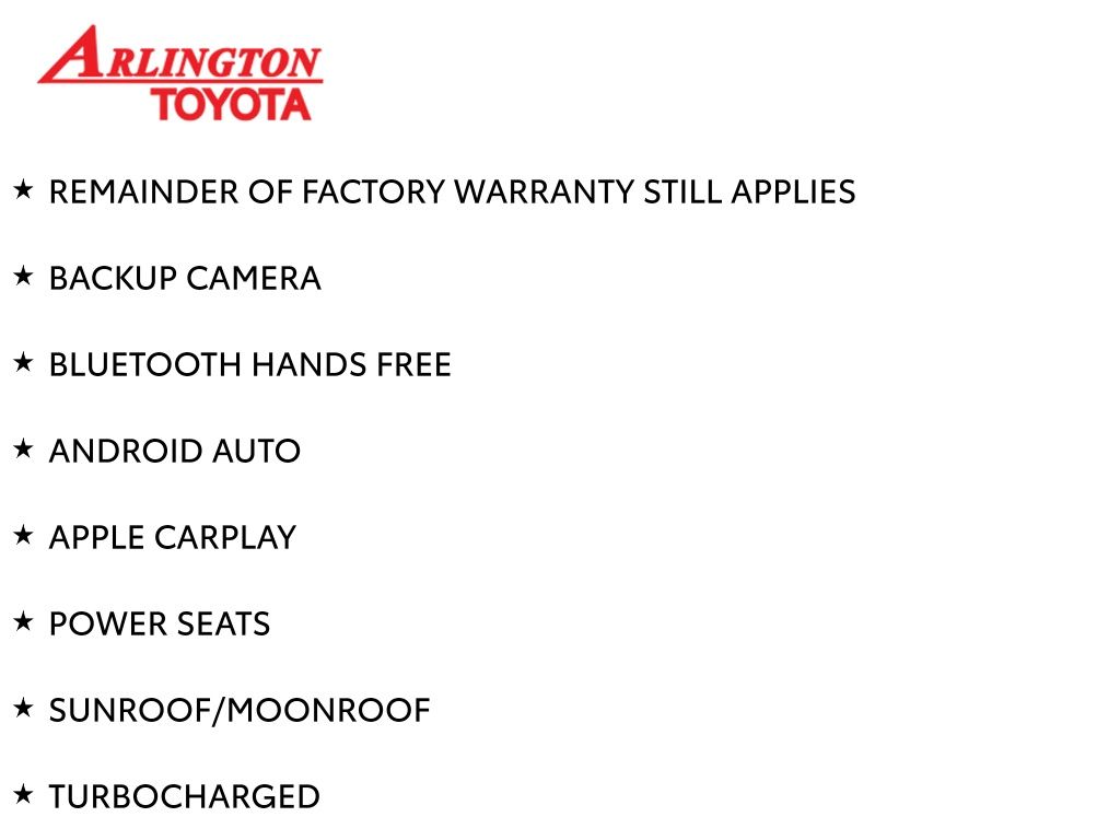 Prices do not include tax, tag, title, a pre-delivery service fee* of $894.00, an electronic registration filing fee* of $199.00 (*these charges represent costs and profits to the dealer for items such as inspecting, cleaning, and preparing documents related to the sale), and an Arlington Toyota Total Value Package of $1,889.00 (*these charges represent costs and profits to the dealer for items such as inspecting, cleaning, and preparing documents related to the sale). The final price is also subject to repair order reconditioning costs. Any price does not include dealer-installed accessories. All offers are mutually exclusive. All vehicles are subject to prior sale. See dealer for complete details.