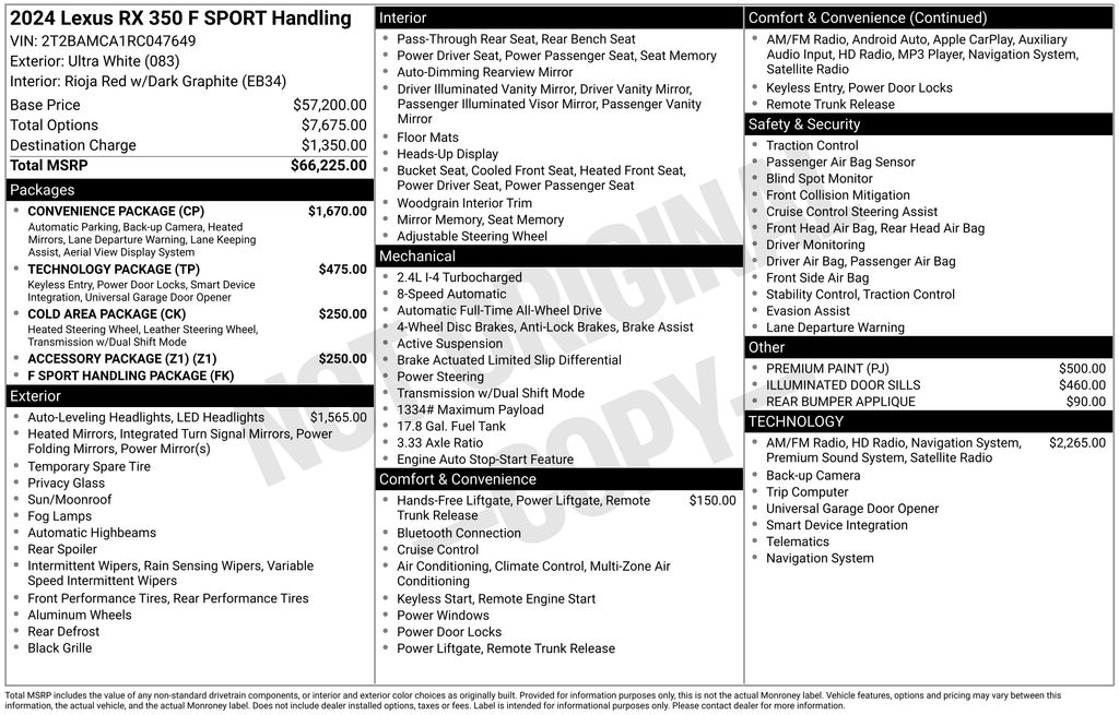 CERTIFIED BY CARFAX - ONE OWNER, REMAINDER OF FACTORY WARRANTY STILL APPLIES, BACKUP CAMERA, BLUETOOTH HANDS FREE, ANDROID AUTO, APPLE CARPLAY, AWD/ALLWHEEL DRIVE, POWER SEATS, POWER LIFTGATE, SUNROOF/MOONROOF, PREMIUM SOUND, TURBOCHARGED, PUSH BUTTON START, LANE DEPARTURE, ADAPTIVE CRUISE CONTROL, NON SMOKER, RX 350 F Sport Handling AWD, 4D Sport Utility, 2.4L I4 PDI Turbocharged DOHC 16V LEV3-SULEV30 275hp, 8-Speed Automatic, AWD, Ultra White, Rioja Red w/Dark Graphite Aluminum w/F SPORT NuLuxe Seat Trim, Convenience Package, Electrochromic Heated Outside Rearview Mirror, Lane Change Assist w/Lane Keeping Assist System, 12 Speakers, 3.33 Axle Ratio, 4-Wheel Disc Brakes, 8-Way Power Driver & Front Passenger Seat Adjusters, ABS brakes, Accessory Package (Z1), Adaptive suspension, Air Conditioning, Alloy wheels, AM/FM radio: SiriusXM, Anti-whiplash front head restraints, Auto High-beam Headlights, Auto tilt-away steering wheel, Auto-dimming door mirrors, Auto-dimming Rear-View mirror, Auto-leveling suspension, Automatic temperature control, Brake assist, Bumpers: body-color, Cargo Net, Carpet Cargo Mat, Cold Area Package, Compass, Delay-off headlights, Driver door bin, Driver vanity mirror, Dual front impact airbags, Dual front side impact airbags, Electronic Stability Control, Emergency communication system: Safety Connect (10-year trial), Exterior Parking Camera Rear, F SPORT Handling Package, F SPORT NuLuxe Seat Trim, Four wheel independent suspension, Front anti-roll bar, Front Bucket Seats, Front Center Armrest, Front dual zone A/C, Front fog lights, Front reading lights, Fully automatic headlights, Garage door transmitter: HomeLink, Genuine wood console insert, Heads-Up Display, Heated & Ventilated Front Bucket Seats, Heated door mirrors, Heated front seats, Illuminated Door Sills, Illuminated entry, Key Gloves, Leather Shift Knob, Leather steering wheel, Low tire pressure warning, Memory seat, Navigation System, Occupant sensing airbag, Outside temperature display, Overhead airbag, Overhead console, Panic alarm, Passenger door bin, Passenger vanity mirror, Power door mirrors, Power driver seat, Power Liftgate, Power moonroof, Power passenger seat, Power Rear Door w/Kick Sensor, Power steering, Power windows, Premium Triple-Beam LED Headlamps, Radio data system, Radio: Lexus Interface w/14" HD Touchscreen Display, Radio: Lexus Interface w/9.8" HD Touchscreen Display, Radio: Lexus Interface w/Mark Levinson Audio, Rain sensing wipers, Rear air conditioning, Rear anti-roll bar, Rear Bumper Applique, Rear reading lights, Rear seat center armrest, Rear side impact airbag, Rear window defroster, Rear window wiper, Remote keyless entry, Security system, Speed control, Speed-sensing steering, Split folding rear seat, Spoiler, Sport steering wheel, Steering wheel memory, Steering wheel mounted audio controls, Tachometer, Technology Package, Telescoping steering wheel, Tilt steering wheel, Traction control, Trip computer, Turn signal indicator mirrors, Variably intermittent wipers, Ventilated front seats, Wheels: 21", Wireless Apple CarPlay/Wireless Android Auto, RX 350 F Sport Handling AWD, 4D Sport Utility, 2.4L I4 PDI Turbocharged DOHC 16V LEV3-SULEV30 275hp, 8-Speed Automatic, AWD, Ultra White, Rioja Red w/Dark Graphite Aluminum w/F SPORT NuLuxe Seat Trim, Convenience Package, Electrochromic Heated Outside Rearview Mirror, Lane Change Assist w/Lane Keeping Assist System.