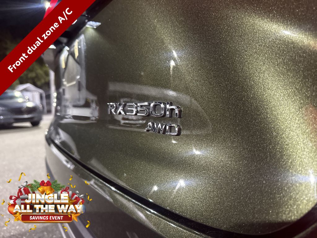 CERTIFIED BY CARFAX - ONE OWNER, REMAINDER OF FACTORY WARRANTY STILL APPLIES, BACKUP CAMERA, BLUETOOTH HANDS FREE, BLIND SPOT MONITORING, ANDROID AUTO, APPLE CARPLAY, AWD/ALLWHEEL DRIVE, POWER SEATS, LOCAL TRADE IN, MEMORY SEATS, POWER LIFTGATE, PUSH BUTTON START, LANE DEPARTURE, ADAPTIVE CRUISE CONTROL, NON SMOKER, RX 350h Luxury AWD, 4D Sport Utility, 2.5L I4, CVT, AWD, Nori Green Pearl, Peppercorn W/Black Open Pore, ABS brakes, Four wheel independent suspension, Front dual zone A/C, Low tire pressure warning, Remote keyless entry, Steering wheel mounted audio controls, 12 Speakers, 3.64 Axle Ratio, 4-Wheel Disc Brakes, Accessory Package (Z1), Air Conditioning, Alloy wheels, AM/FM radio: SiriusXM, Anti-whiplash front head restraints, Auto High-beam Headlights, Auto-dimming door mirrors, Auto-dimming Rear-View mirror, Automatic temperature control, Brake assist, Bumpers: body-color, Cargo Net, Carpet Cargo Mat, Cold Area Package, Compass, Delay-off headlights, Driver door bin, Driver vanity mirror, Dual front impact airbags, Dual front side impact airbags, Electronic Stability Control, Exterior Parking Camera Rear, Front anti-roll bar, Front Bucket Seats, Front Center Armrest, Front fog lights, Front reading lights, Fully automatic headlights, Garage door transmitter: HomeLink, Heated door mirrors, Heated front seats, Illuminated entry, Key Gloves, Leather Shift Knob, Leather steering wheel, Navigation System, Occupant sensing airbag, Outside temperature display, Overhead airbag, Overhead console, Panic alarm, Passenger door bin, Passenger vanity mirror, Power door mirrors, Power driver seat, Power Liftgate, Power passenger seat, Power steering, Power windows, Radio data system, Rain sensing wipers, Rear air conditioning, Rear anti-roll bar, Rear reading lights, Rear seat center armrest, Rear side impact airbag, Rear window defroster, Rear window wiper, Security system, Speed control, Speed-sensing steering, Split folding rear seat, Spoiler, Telescoping steering wheel, Tilt steering wheel, Traction control, Trip computer, Turn signal indicator mirrors, Variably intermittent wipers, Wireless Apple CarPlay/Wireless Android Auto, RX 350h Luxury AWD, 4D Sport Utility, 2.5L I4, CVT, AWD, Nori Green Pearl, Peppercorn W/Black Open Pore, ABS brakes, Four wheel independent suspension, Front dual zone A/C, Low tire pressure warning, Remote keyless entry, Steering wheel mounted audio controls.